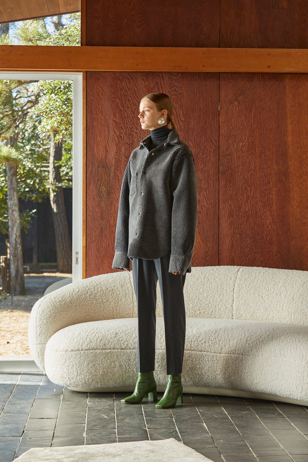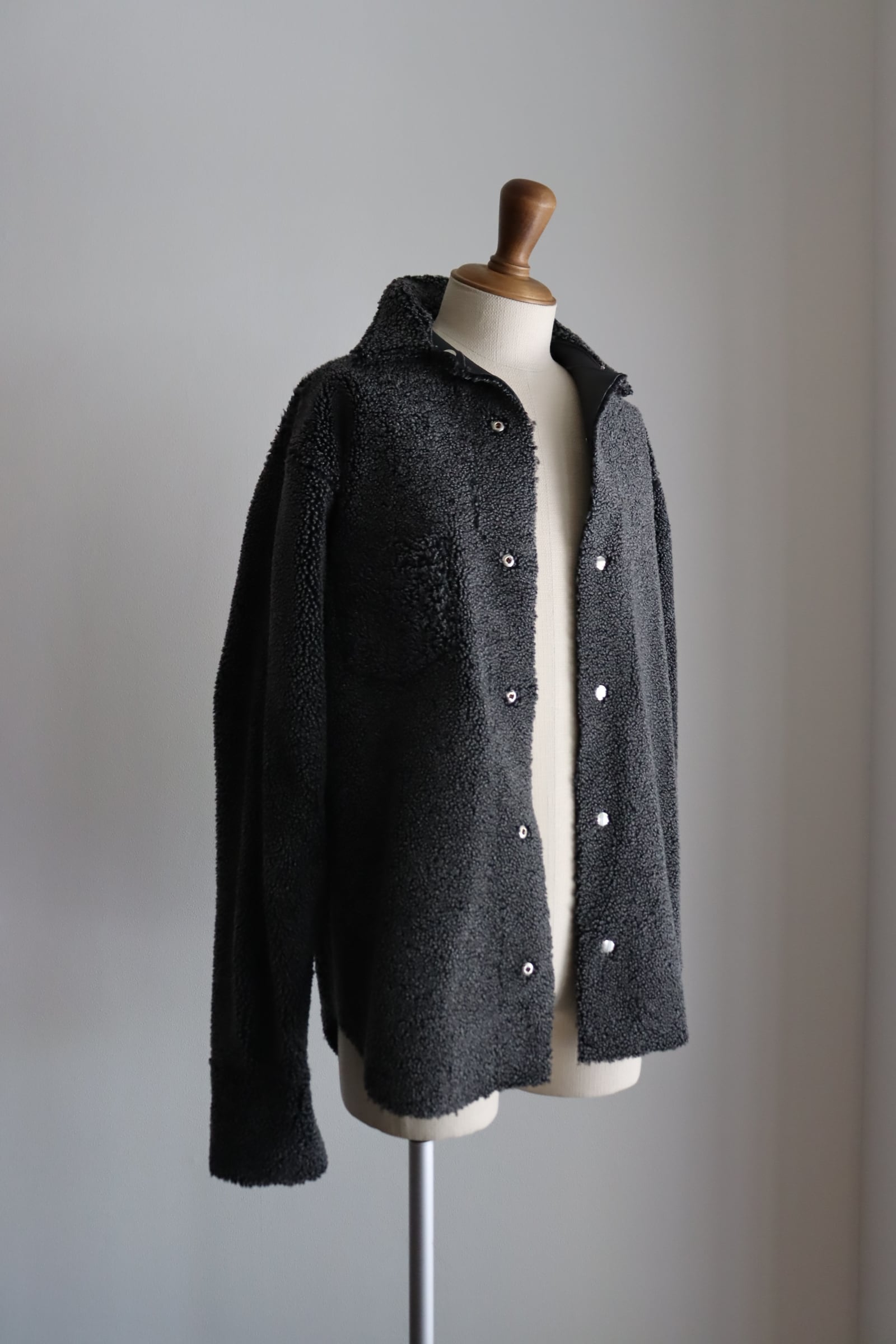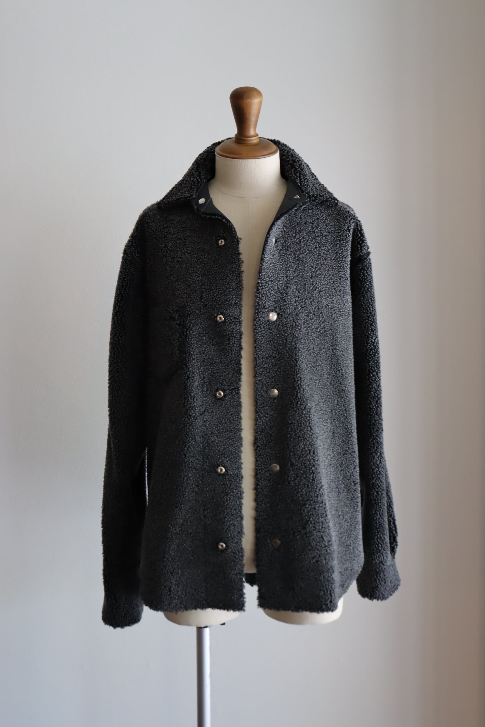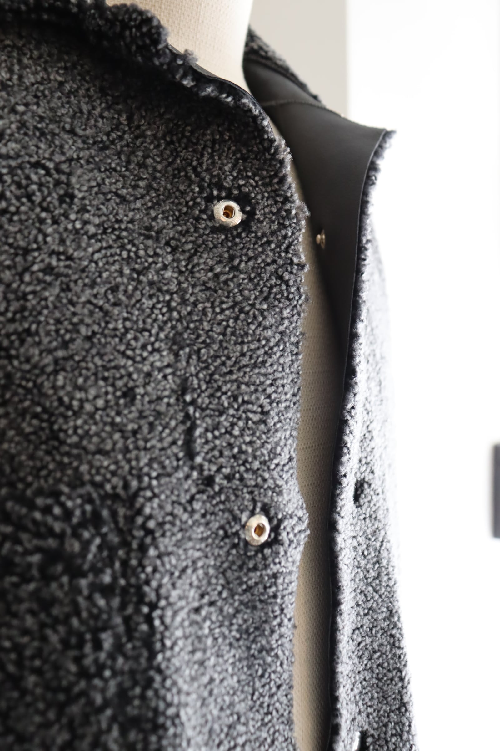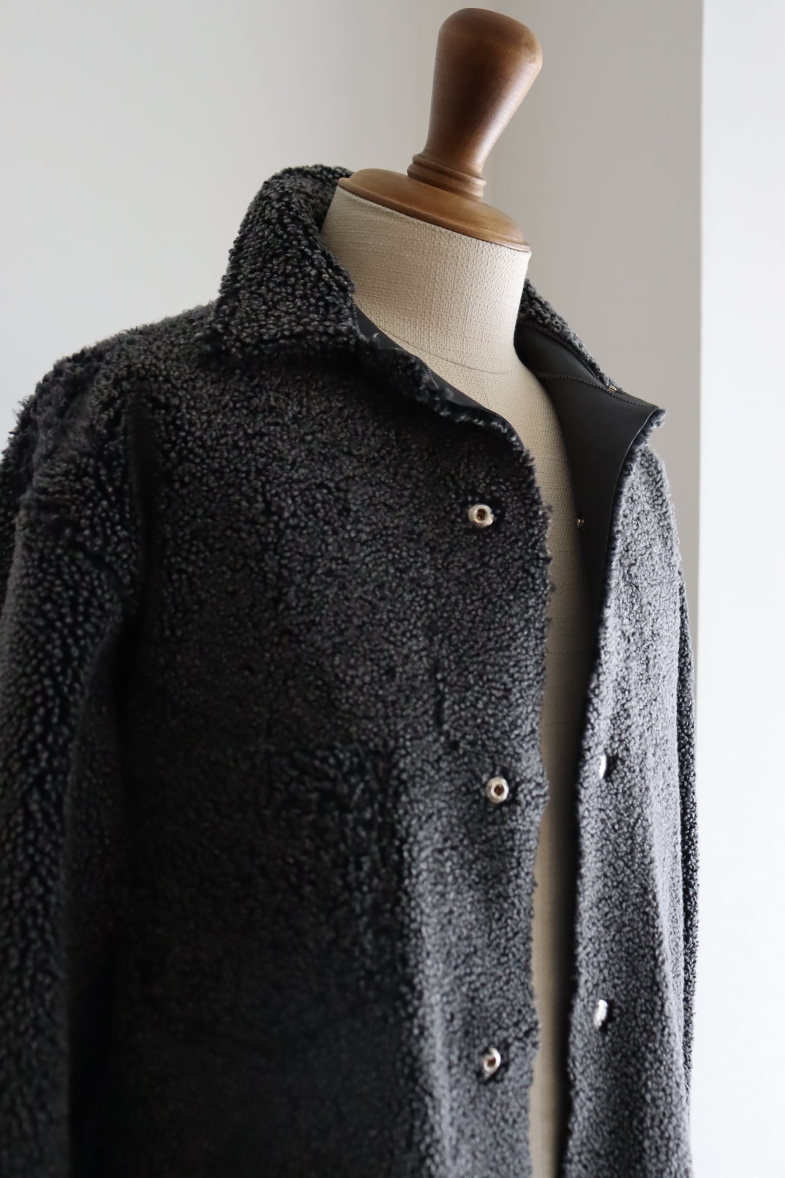 ムートンボアのシャツ型ジャケットです。表面はセミナッパ加工を施し、しっとりとした艶があります。