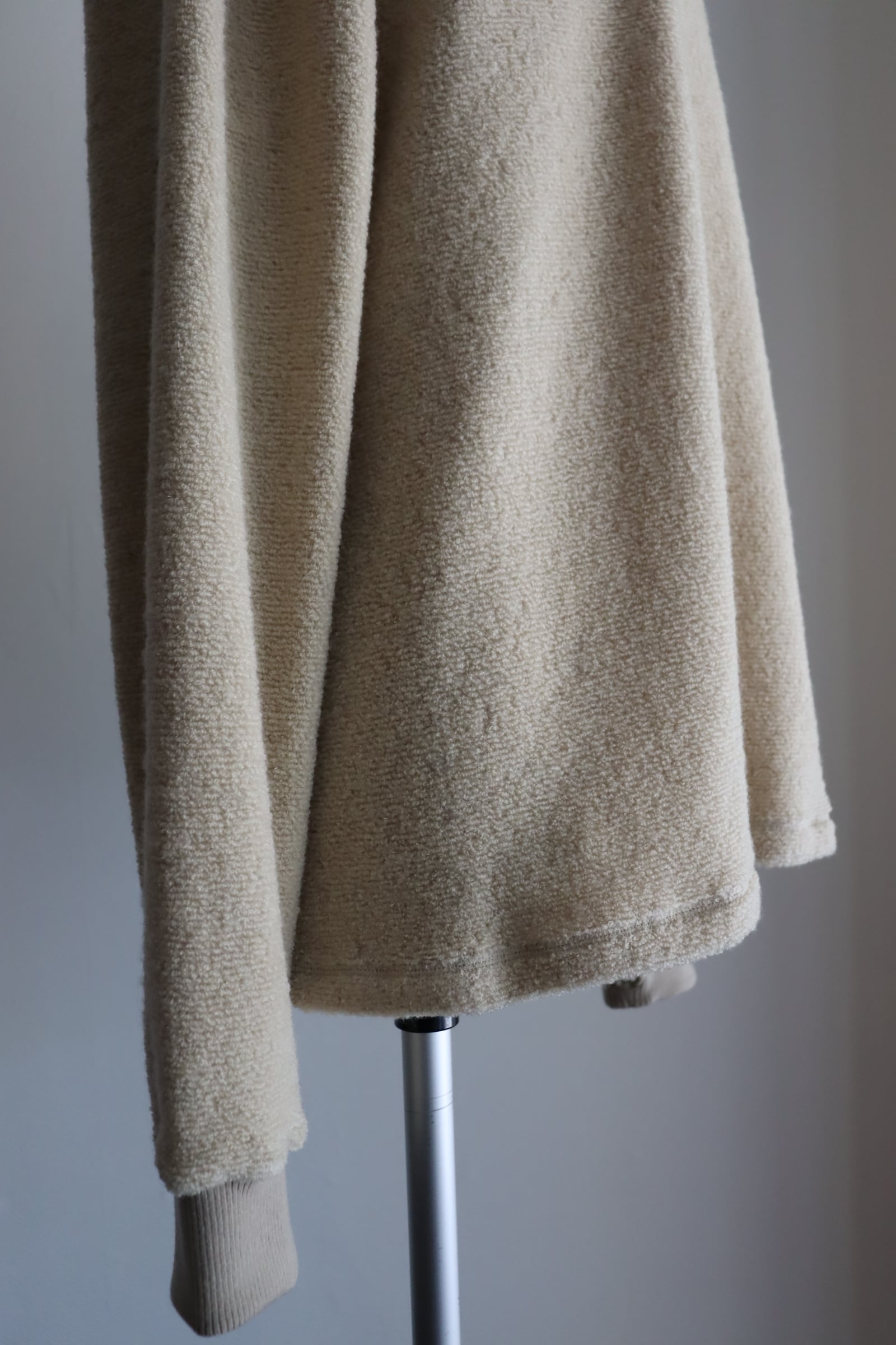 インナーとして、ジャケットの首もとのポイントとして活躍できるデザインです。身幅にややゆとりを持たせ、程よく肩のラインをドロップさせたシルエットです。両袖先にはサムホールデザインもポイントです。