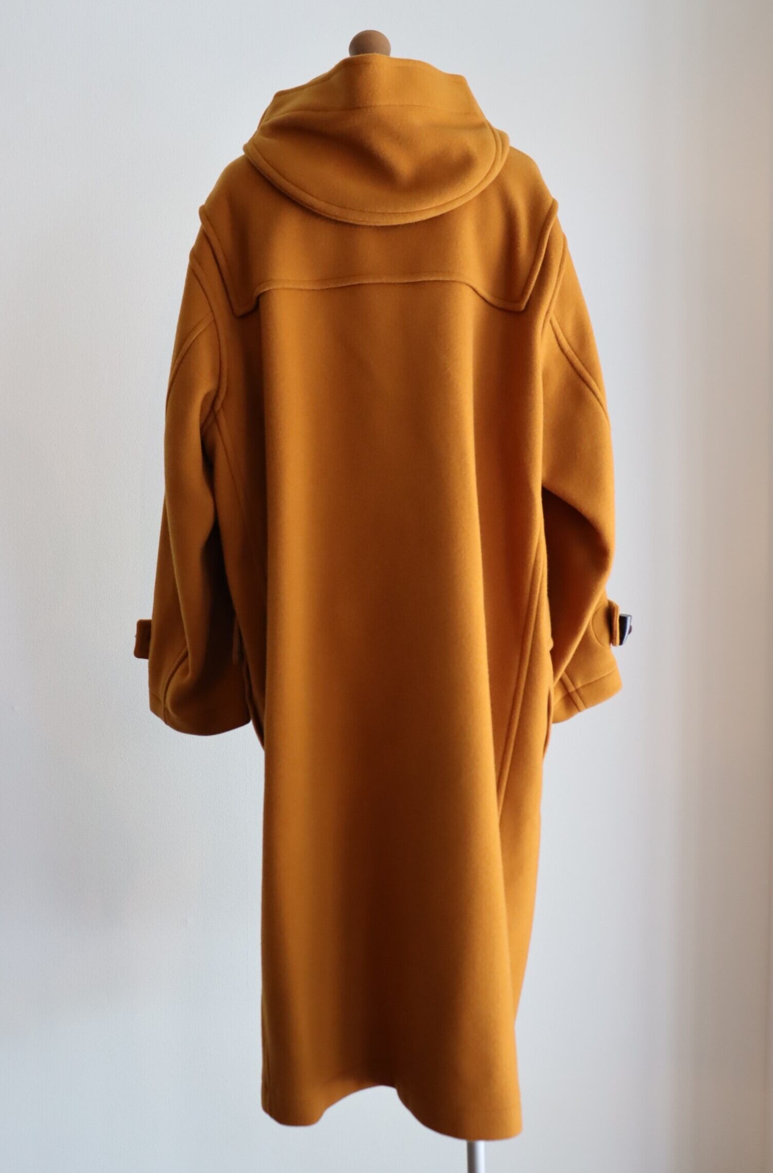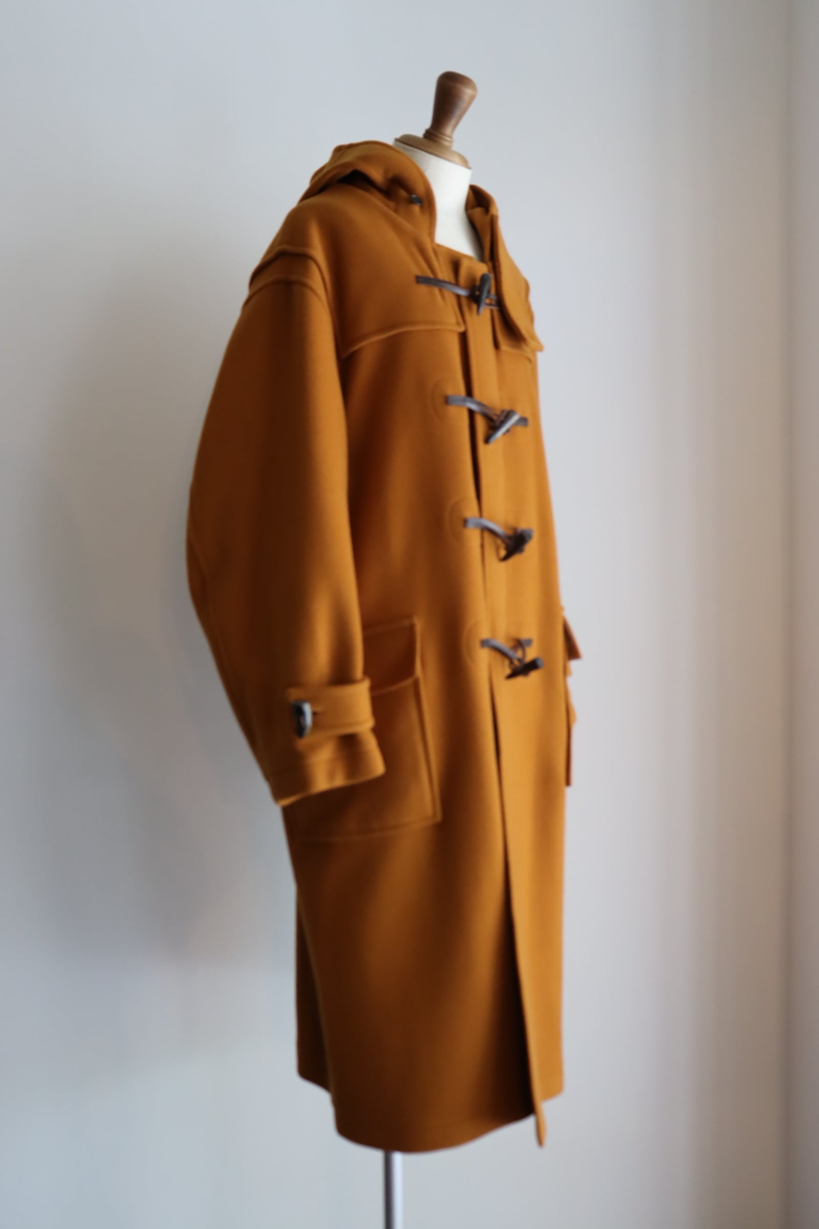 ゆったりとしたシルエットで表現し、それによって生まれるドレープ感と450gの軽い目付がオーセンティツクなメルトンダッフルコートと差別化しております。