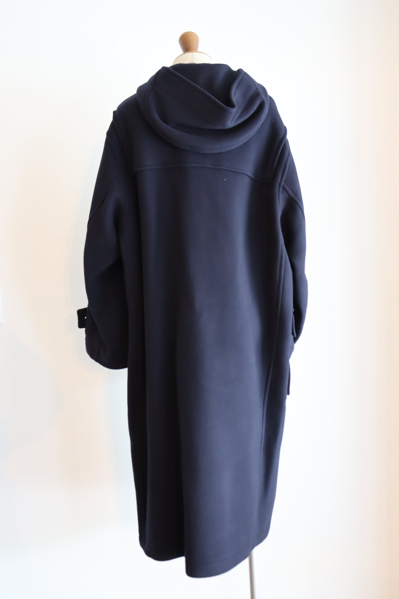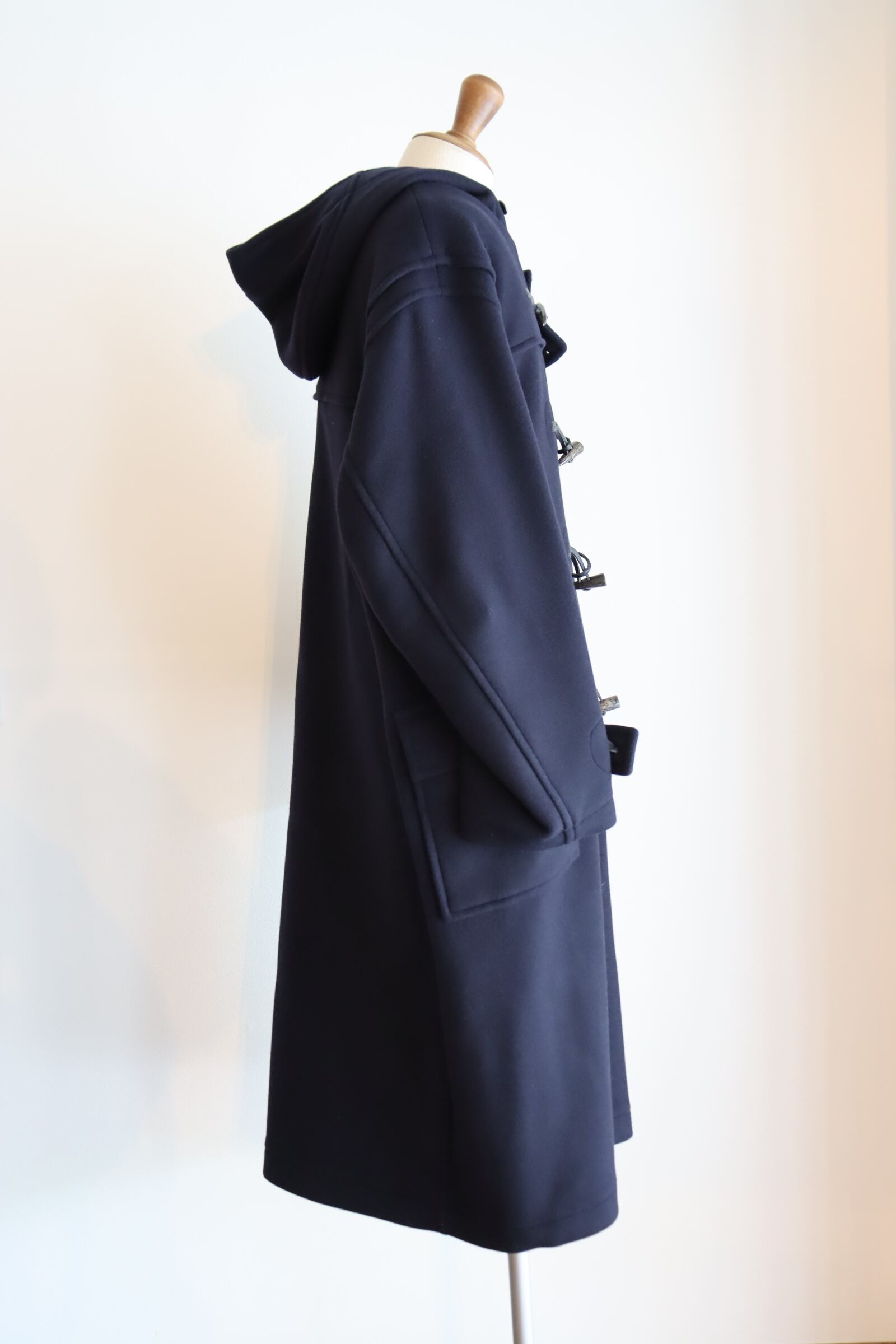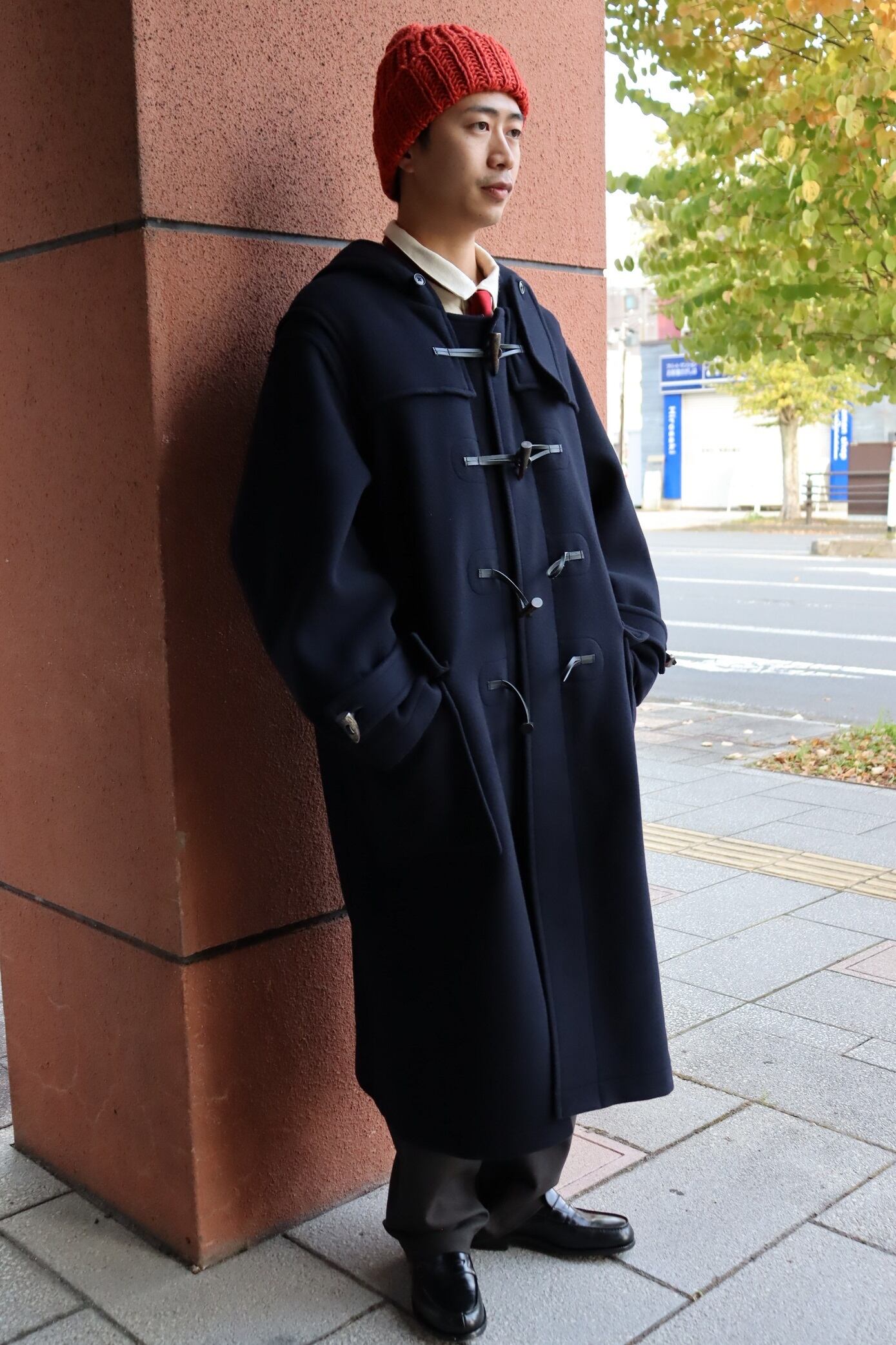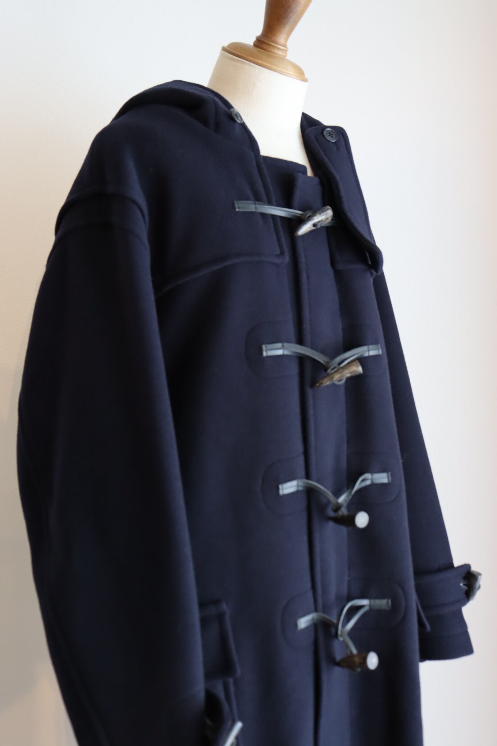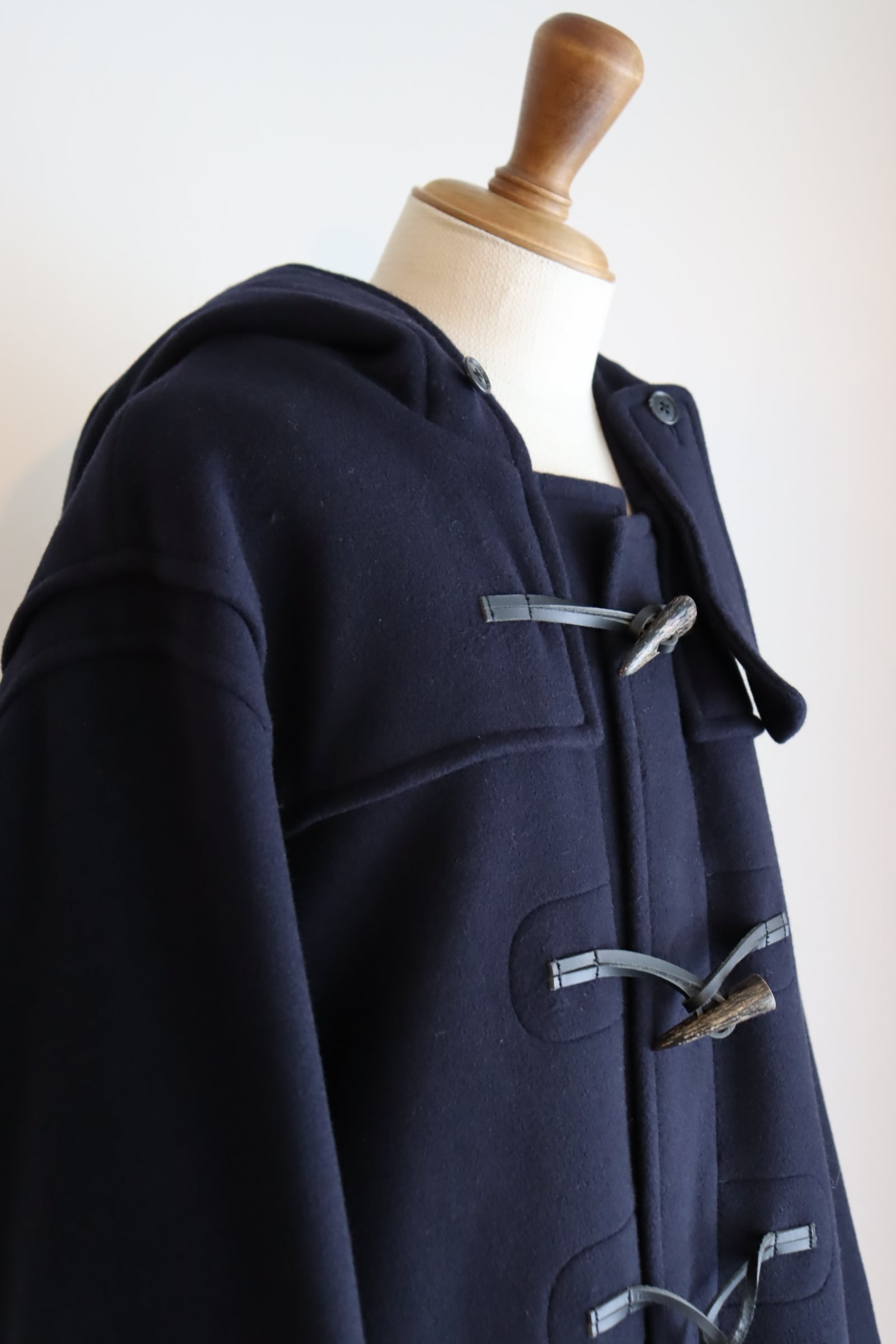 ゆったりとしたシルエットで表現し、それによって生まれるドレープ感と450gの軽い目付がオーセンティツクなメルトンダッフルコートと差別化しております。