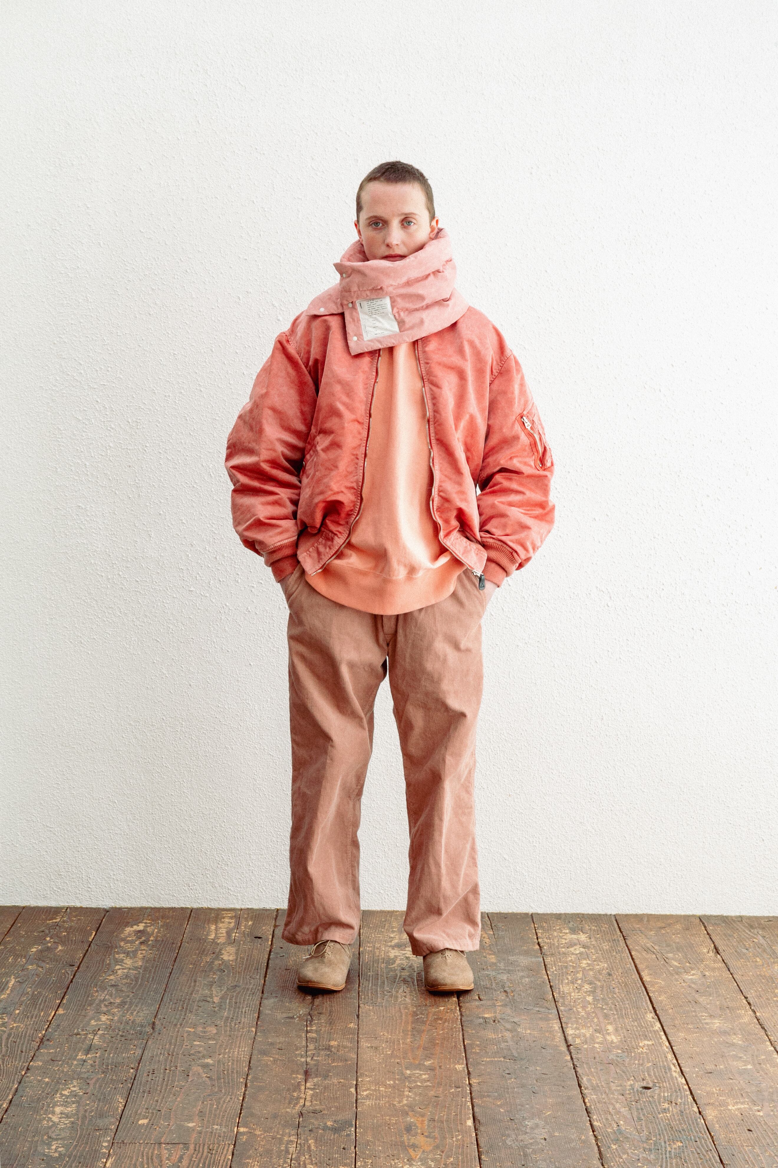 ⾊々な混率の素材がMIXされている為、縮率や⾊の⼊り⽅を製品染で再現する事が困難でしたが試⾏錯誤の末、再現する事が出来ました。⼿染めの⾊ムラ感と奥⾏きのある⾊⽬が何とも⾔えない佇まいです。