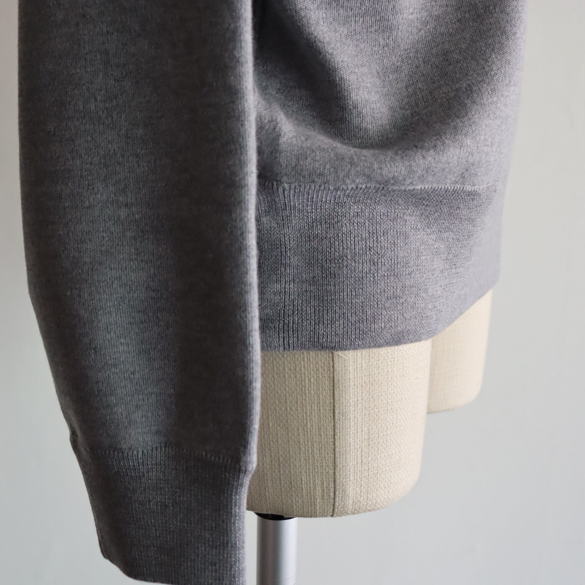 表面感が滑らかなスムース編みは肌馴染みがよくインナーとしても最適です。アームホールと袖下と脇の縫い代が表出し仕様プラス、右側のリンキング糸は配色のデザインなので1枚着としてもアクセントのある1着に仕立てられております。袖と裾リブはダブル仕様でボリュームを出し、BODYと別リンキングにする事で丸みのあるフォルムに仕立てております。