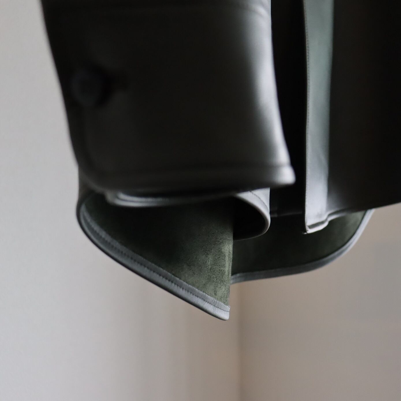 美しく艶やかな表面感と柔らかさを兼ね備えた上質なスぺインラムを切り替えなどの繋ぎ目がなく贅沢に使用し、Caleにて定番で展開しているシャツの形に近づけるようにデザインされている。また、シャツのパターンながらもジャケットしても着用できるデザインとなっており、境界線なくご使用頂けるアイテムとなっております。