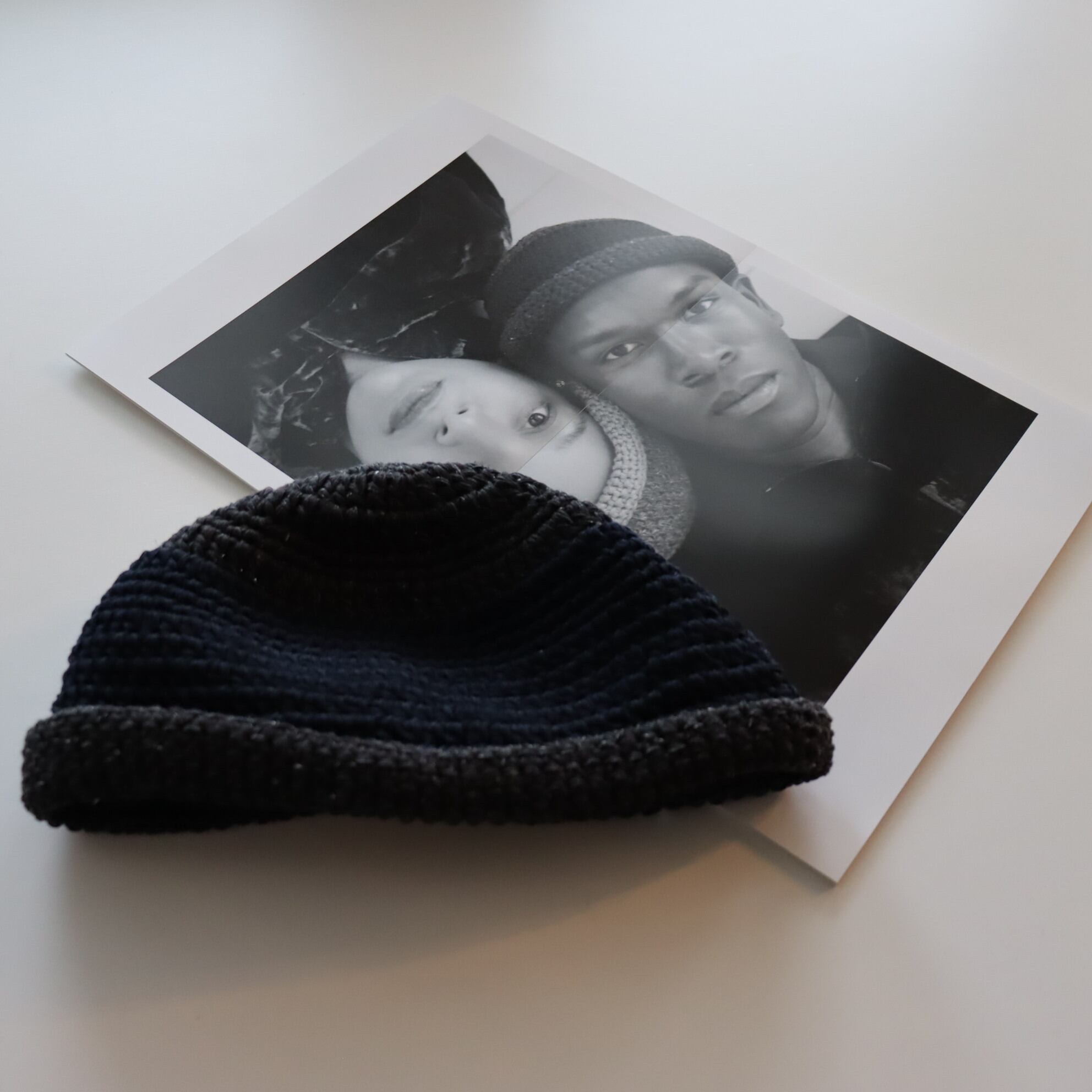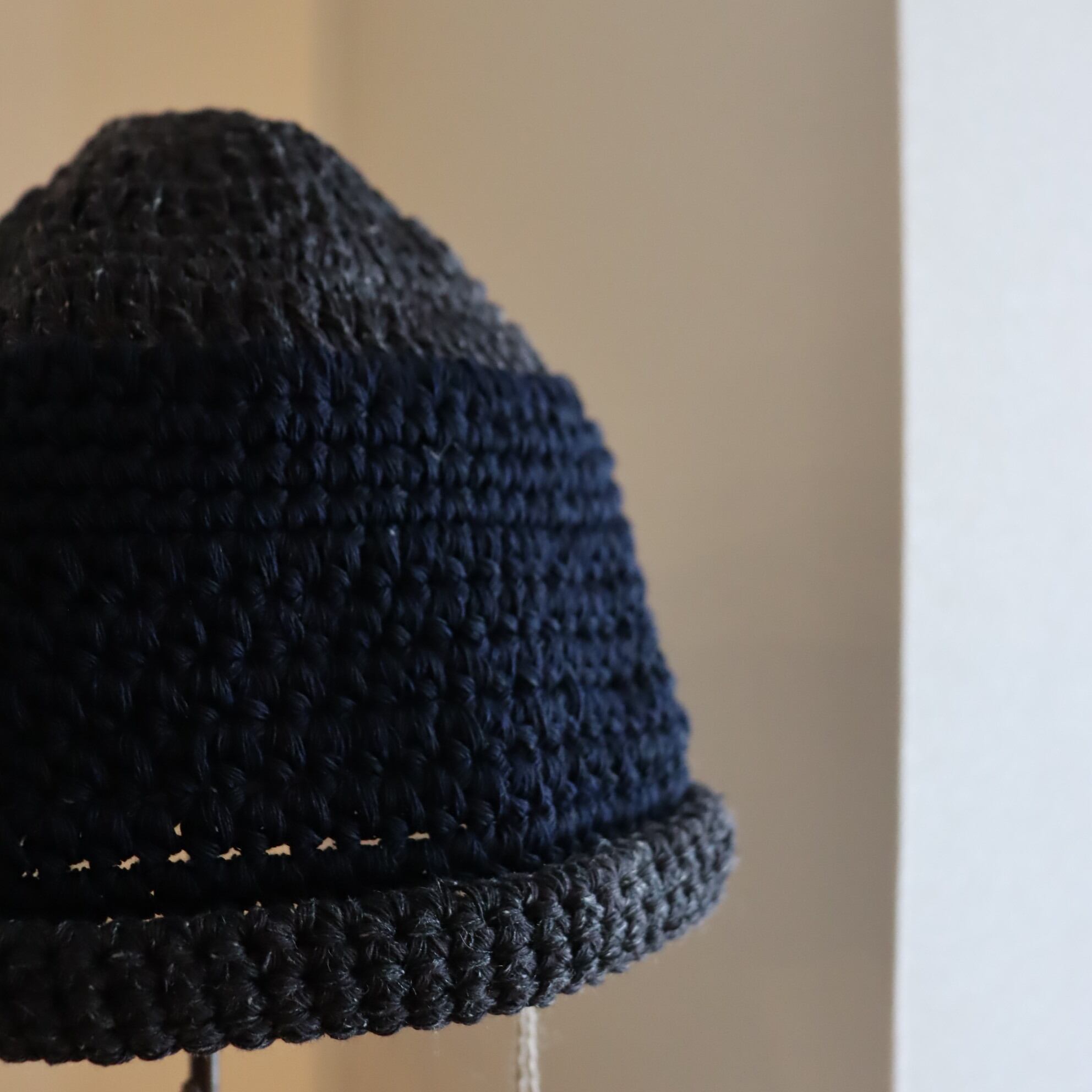 ドライな肌触りのコットンシルクの手編みビーニー。