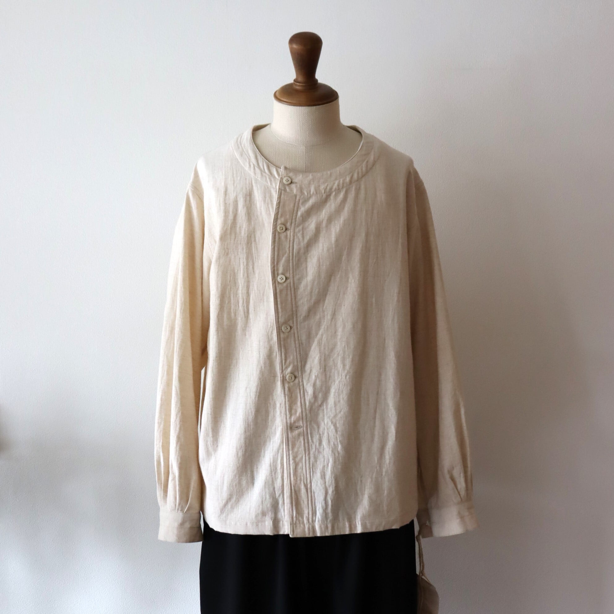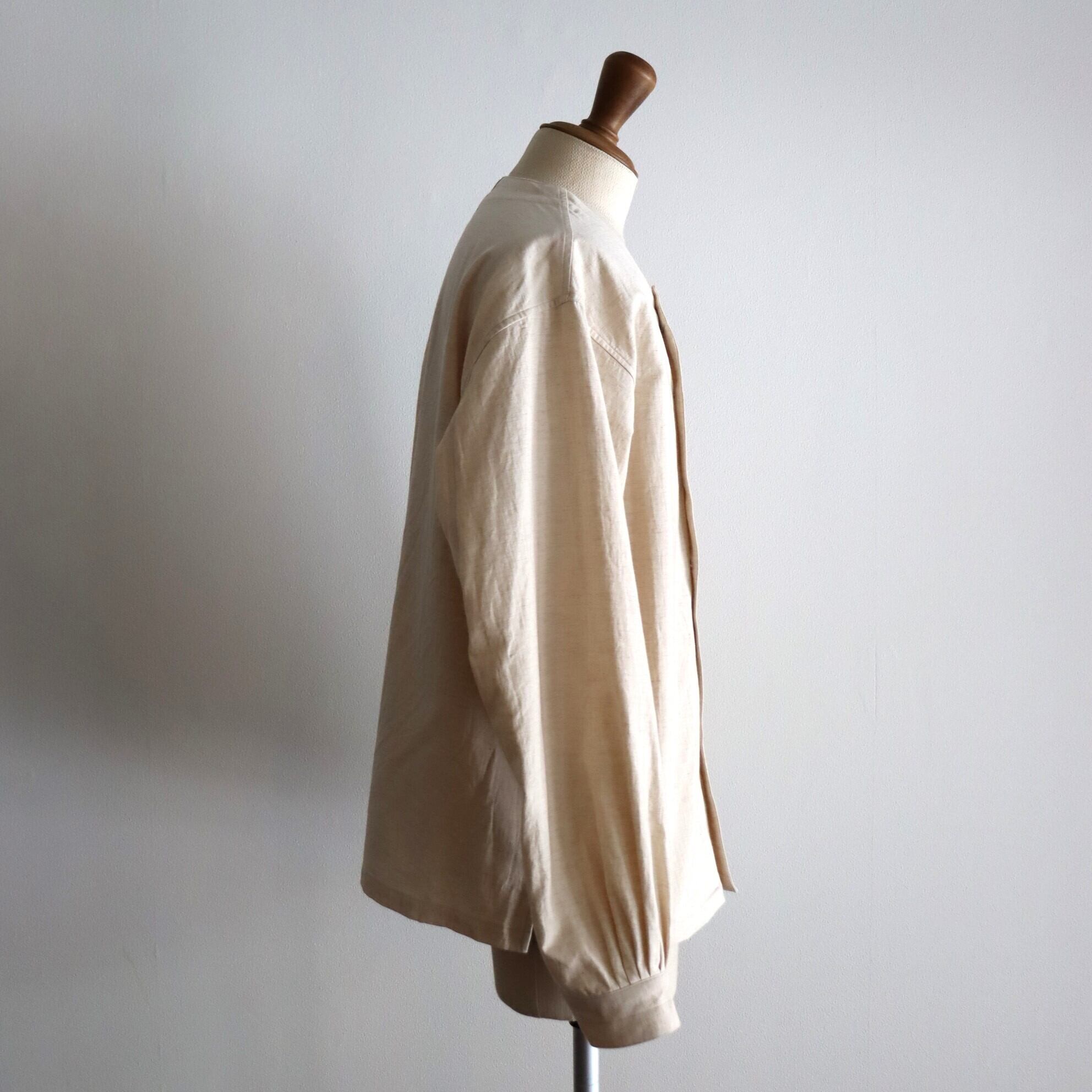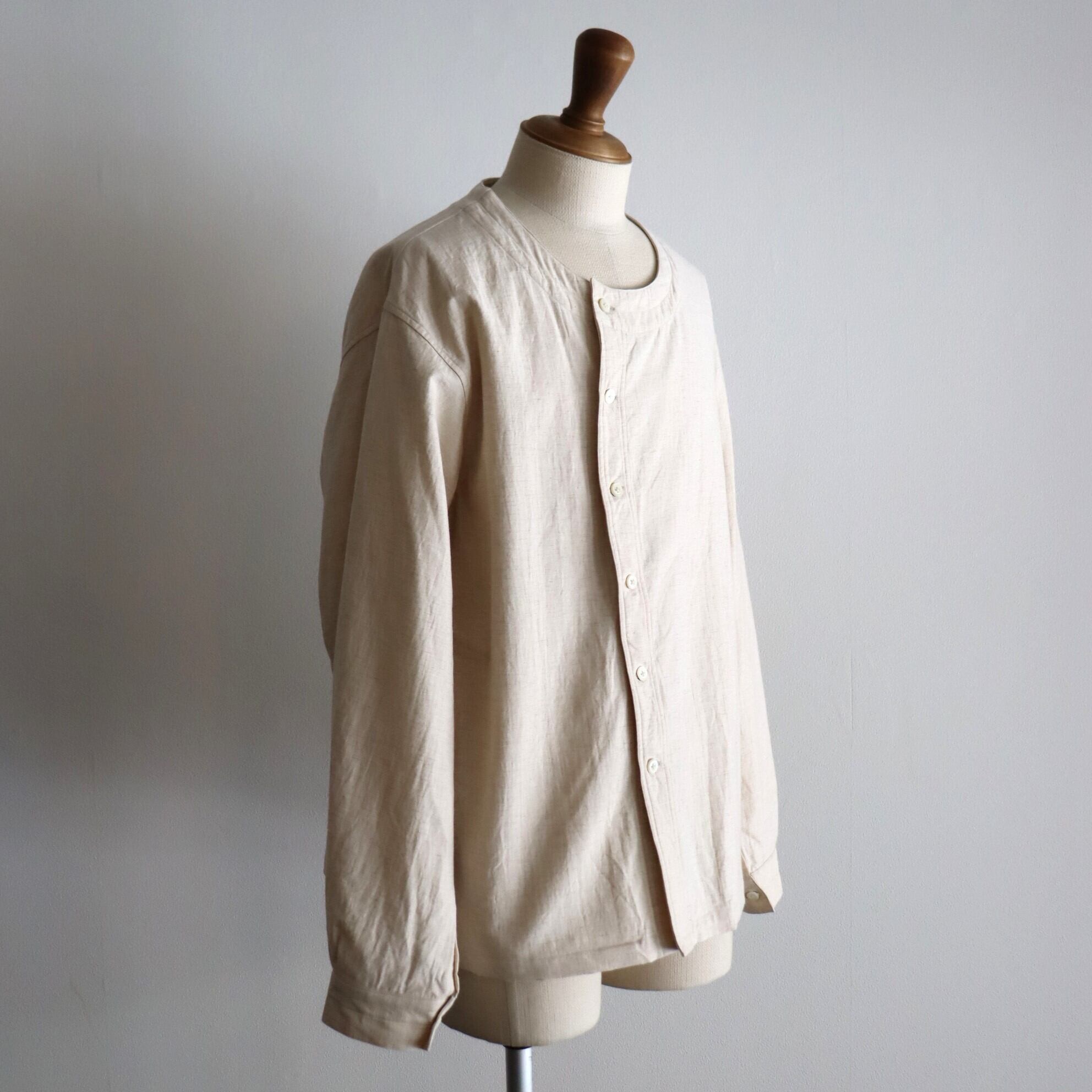 適度なゆとりを持たせたサイズバランスにノーカラーの衿元、程よい張りのある素材使いの為、本来のシャツとしてのみでは無く、カーディガンやライトアウター的な着用方法にも適したアイテムとなります。