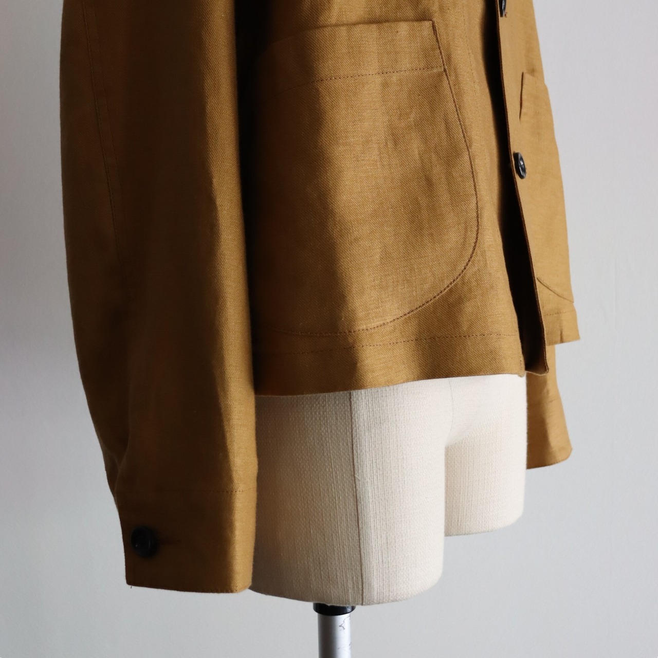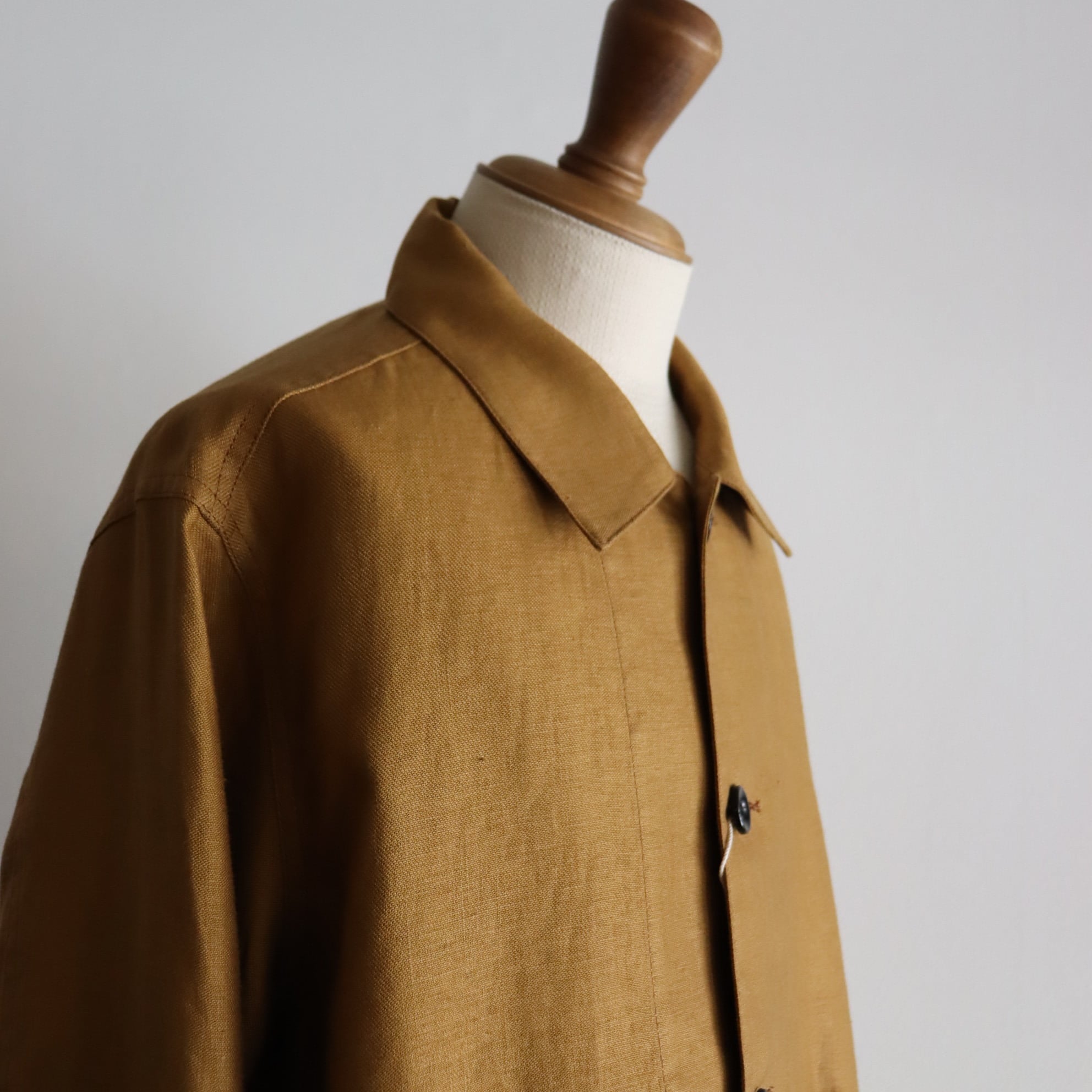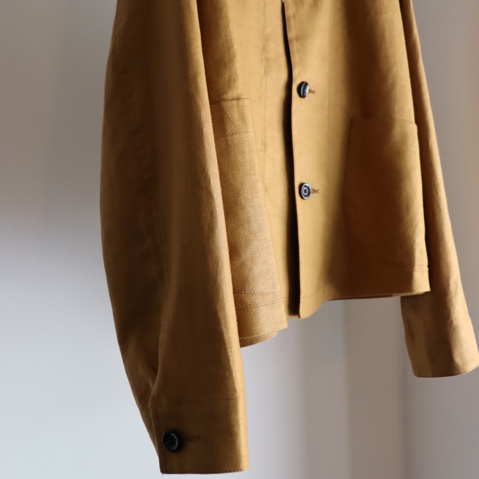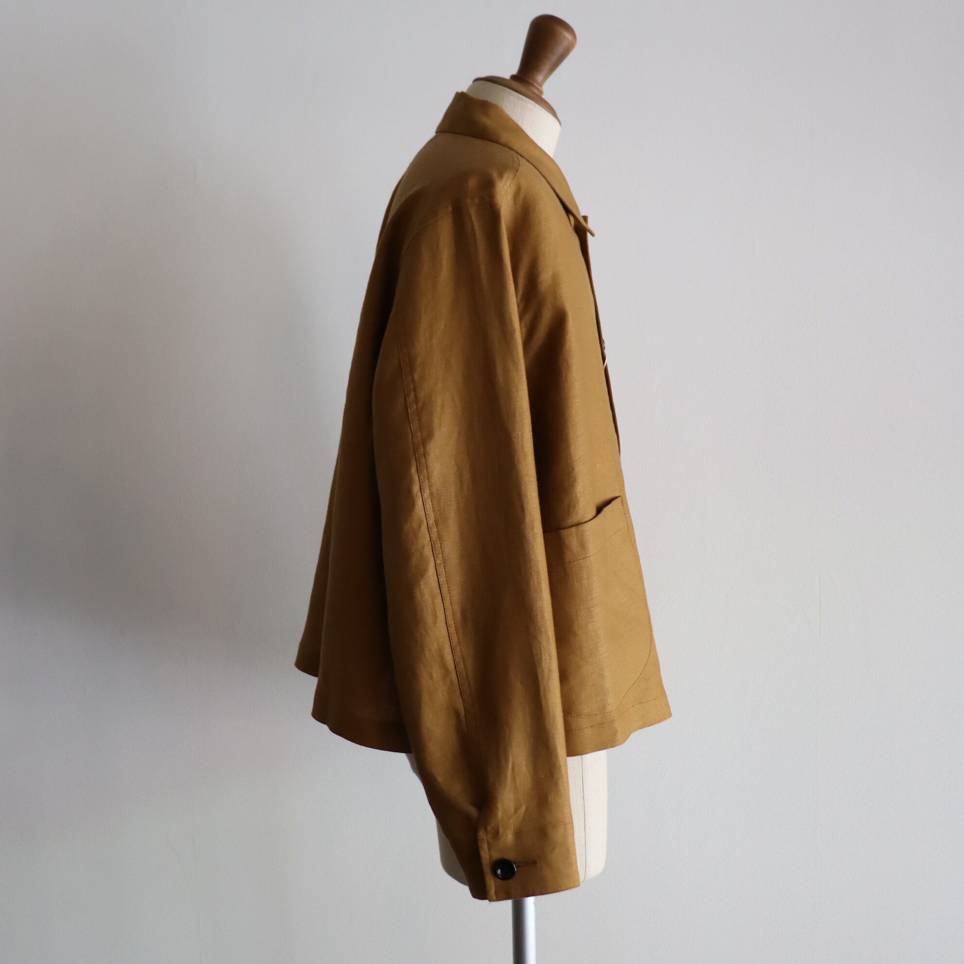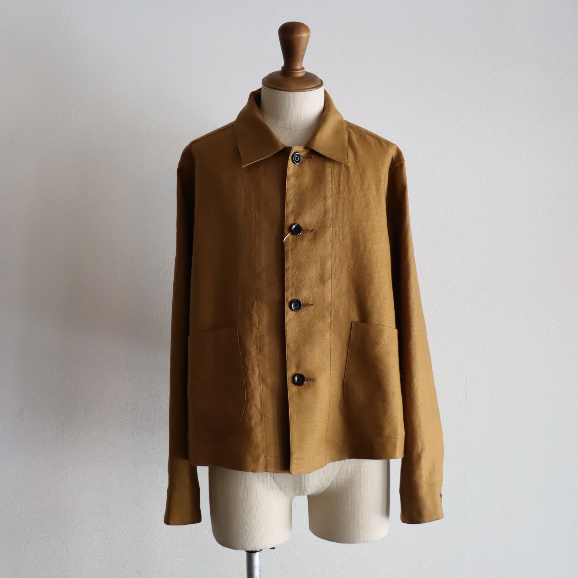 胸、肩甲骨あたりはタイトめ、脇下から裾はゆとりがあり、きつめの肩傾斜や袖山の高さなど50年代フランスワークジャケットをボディファイしたワークJKT。