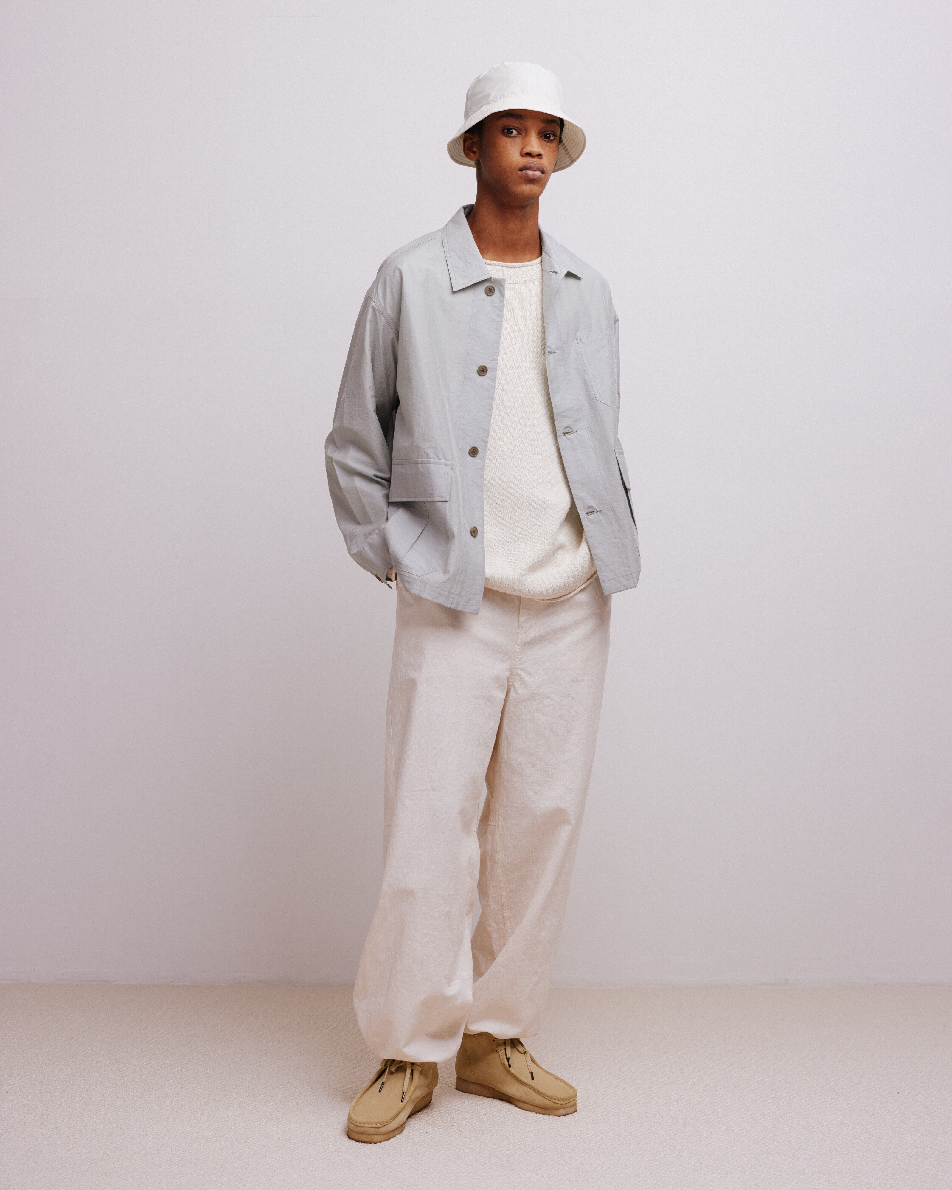 細番手の糸を使用して経糸にナイロン緯糸にコットンを使用した透け感とハリ感のあるローンを使用し、清涼感があるカバーオールに。