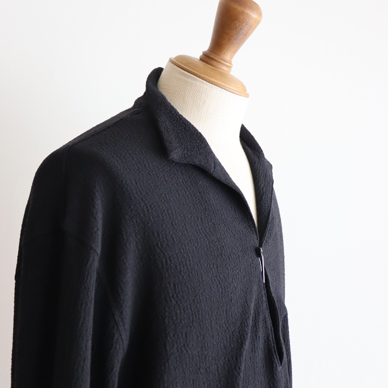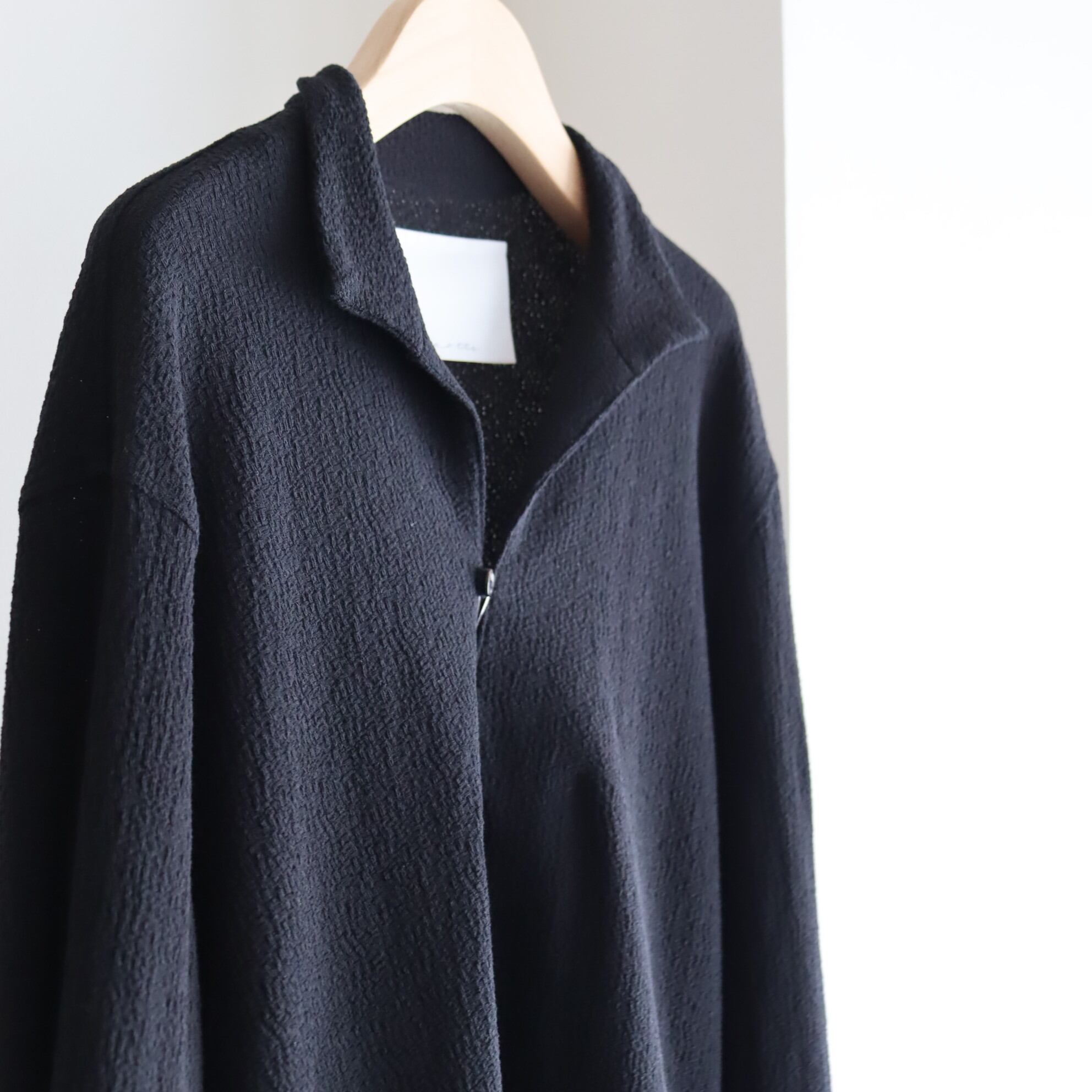 日本の湿度の高い気候に、どのようなシャツが一番最適かを考え、 「シルクのようなシャリみのある強撚糸の肌触り」 「布帛のサッカー組織のように生地の表面に凹凸がありベタつかず肌離れが良いこと」「天然繊維で何度も洗えて、乾燥機もかけれて、翌日着用できる強さ」 「縮まないこと、斜行しないこと」 「経年変化で毛羽が立たないこと」 そして願わくばそこにプラス、エレガント性。 読んで頂いて分かる通り、とてもわがままで実現が難しい素材です。 それらを実現するにあたり、最初に述べたように強撚糸をさらにガス焼きし、 凹凸を表現するためにオーストリッチのような表情を目指し組織を組みました。 ジャガードで布帛の平織を再現し、強撚糸の伸度もテンションの差を利用したことにより生み出しております。 リンクス編みは1日に1反しか編めない古い機械です。 染色工程ではタンブラー仕上げをして風合いを出しています。ご家庭でも洗濯機で洗え、ヘビーに使用する事ができます。自信を持って進められる上質でヘビーユース可能な商品となっております。