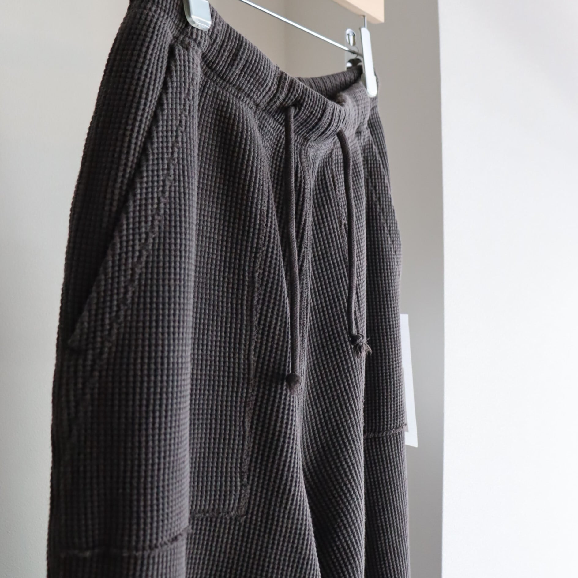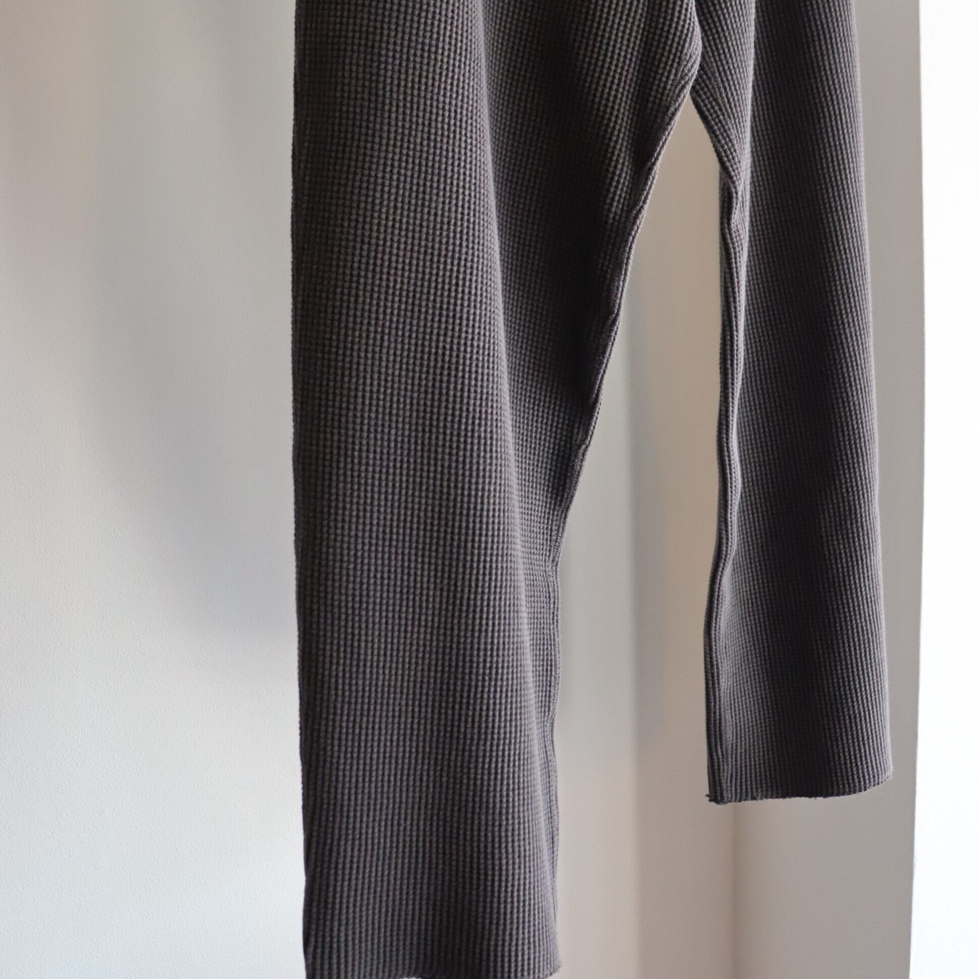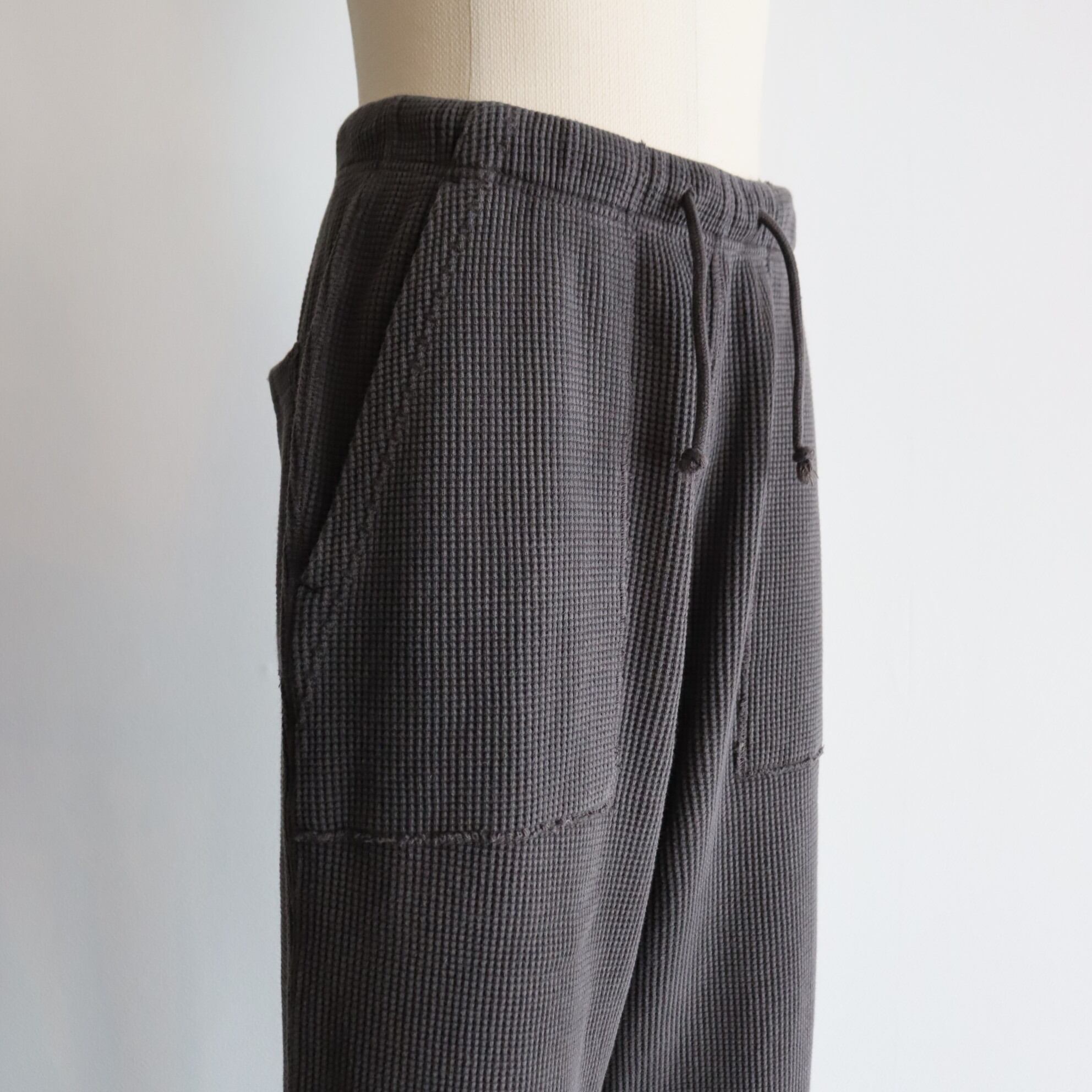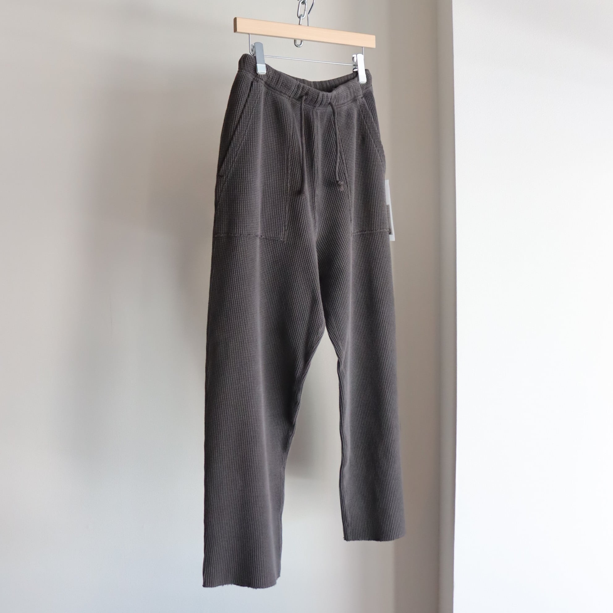 20番のコーマ⽷をローゲージの編み機で編み上げる事でワッフルの⽬を⼤きくしたビッグワッフル⽣地で作った WAFFLE PANTS。