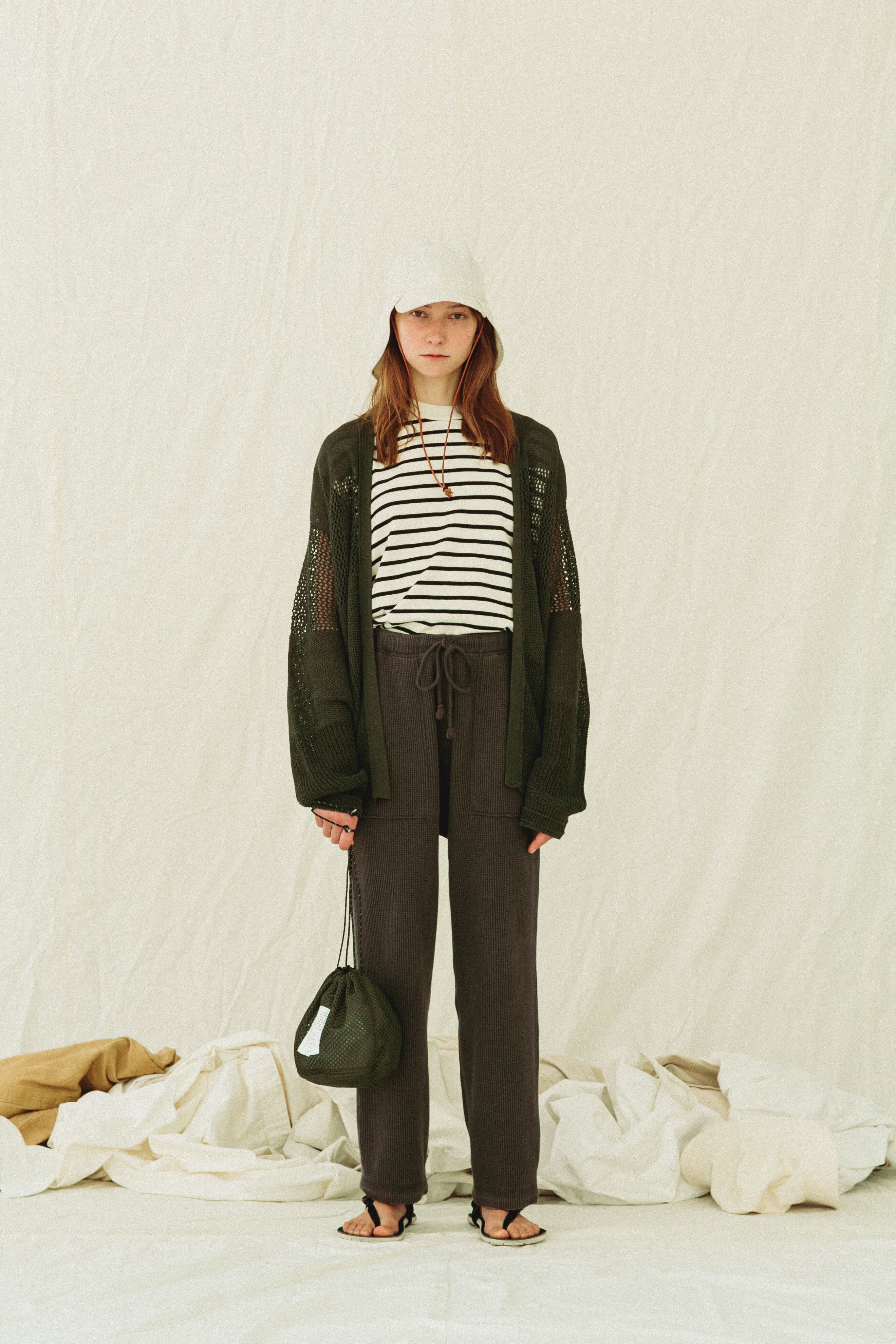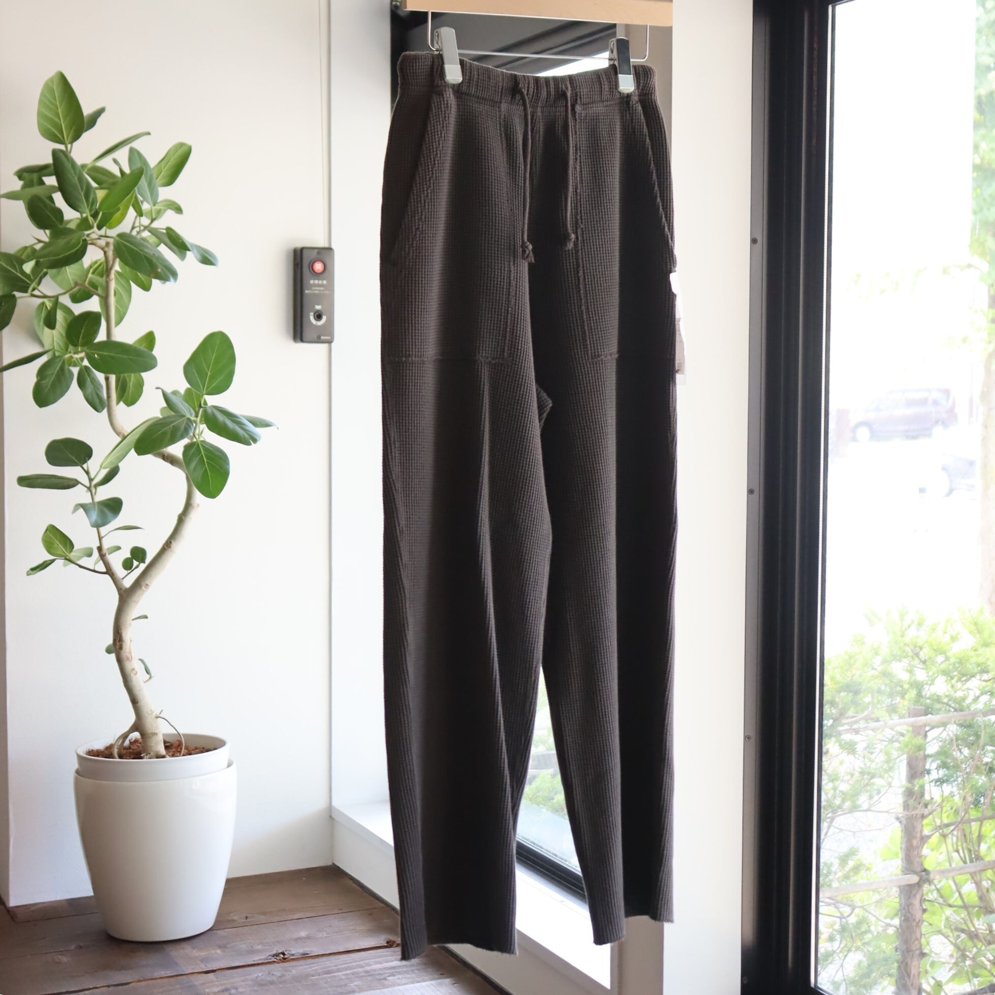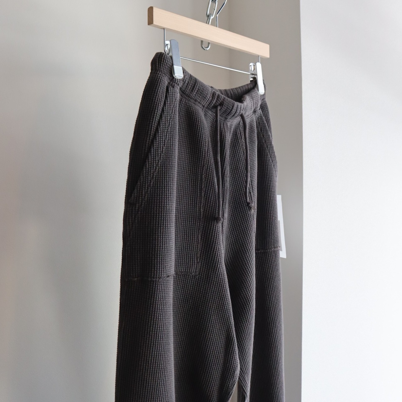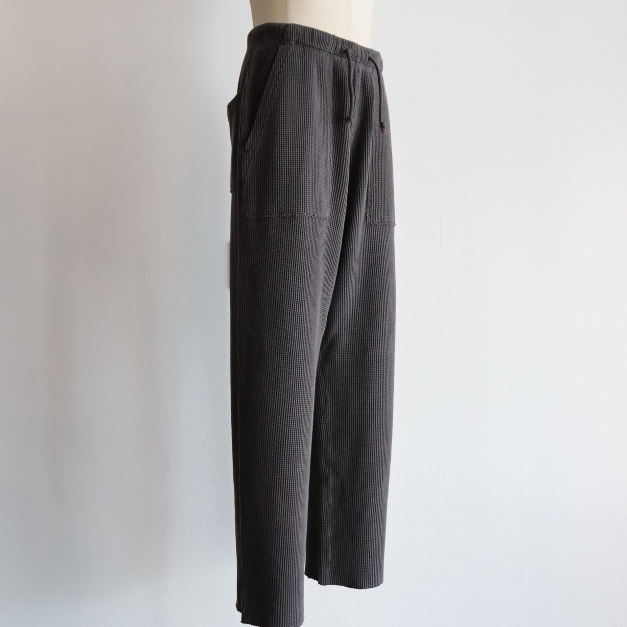 20番のコーマ⽷をローゲージの編み機で編み上げる事でワッフルの⽬を⼤きくしたビッグワッフル⽣地で作った WAFFLE PANTS。