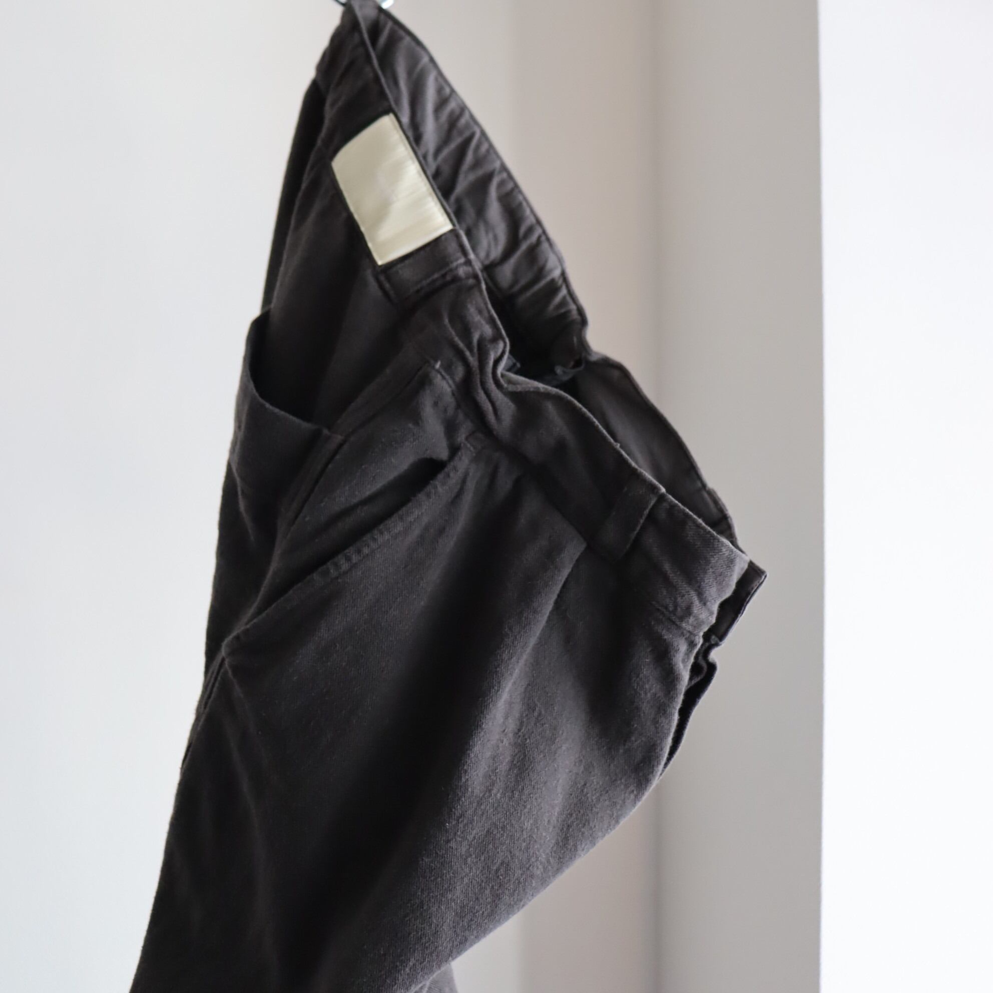 出来る様、⼦供服でよく使⽤される内側ウエストゴムを両脇のボタンでアジャストして調整出来る仕様を採⽤。素材にはリネンコットンのカツラギを職⼈さんによって少量づつ天⽇⼲しした⽣地を採⽤。敢えて最終⼯程で⽑焼きの⼯程をしないことで、⽣地の⽑⽻感を残し、柔らかさとシワ感を表現しています。