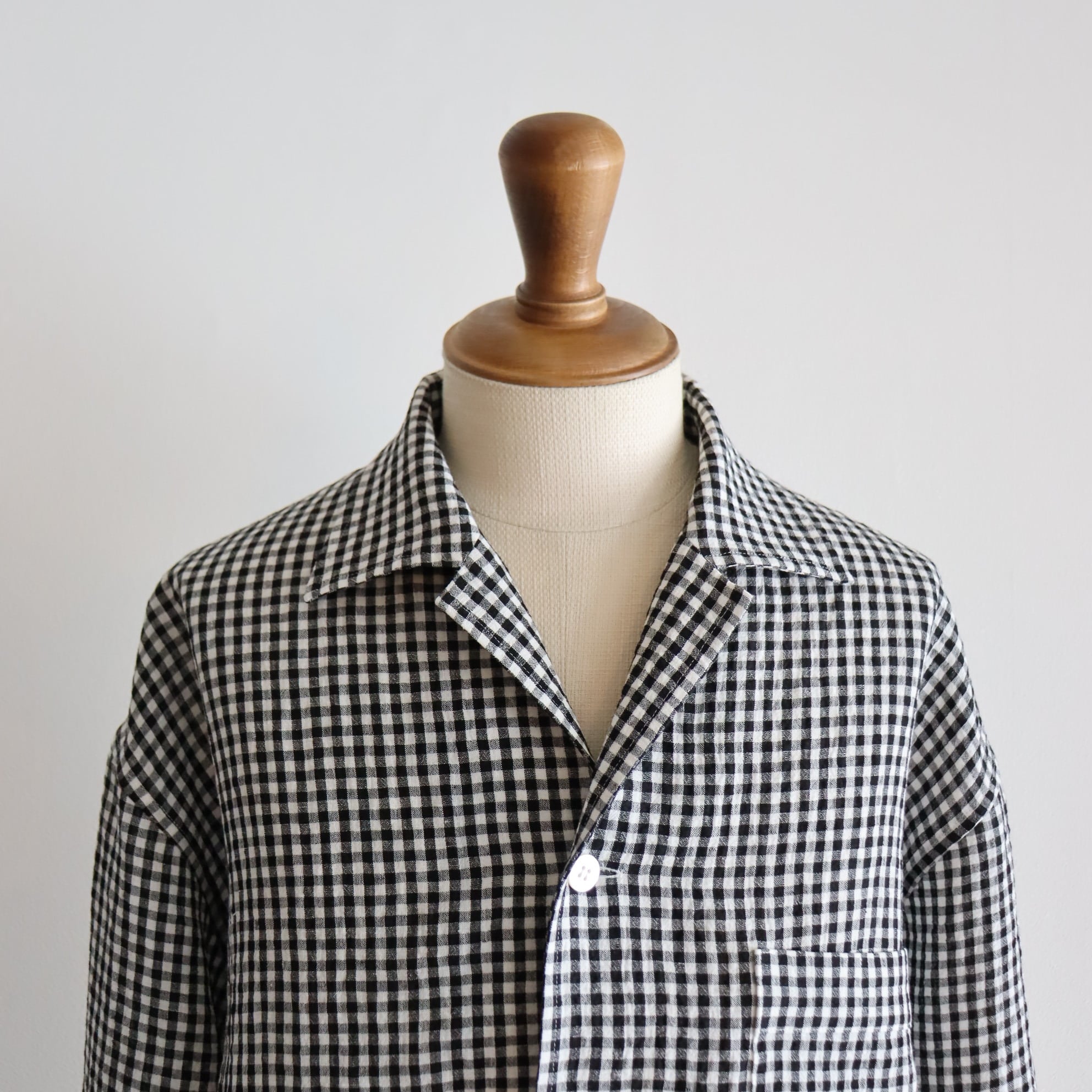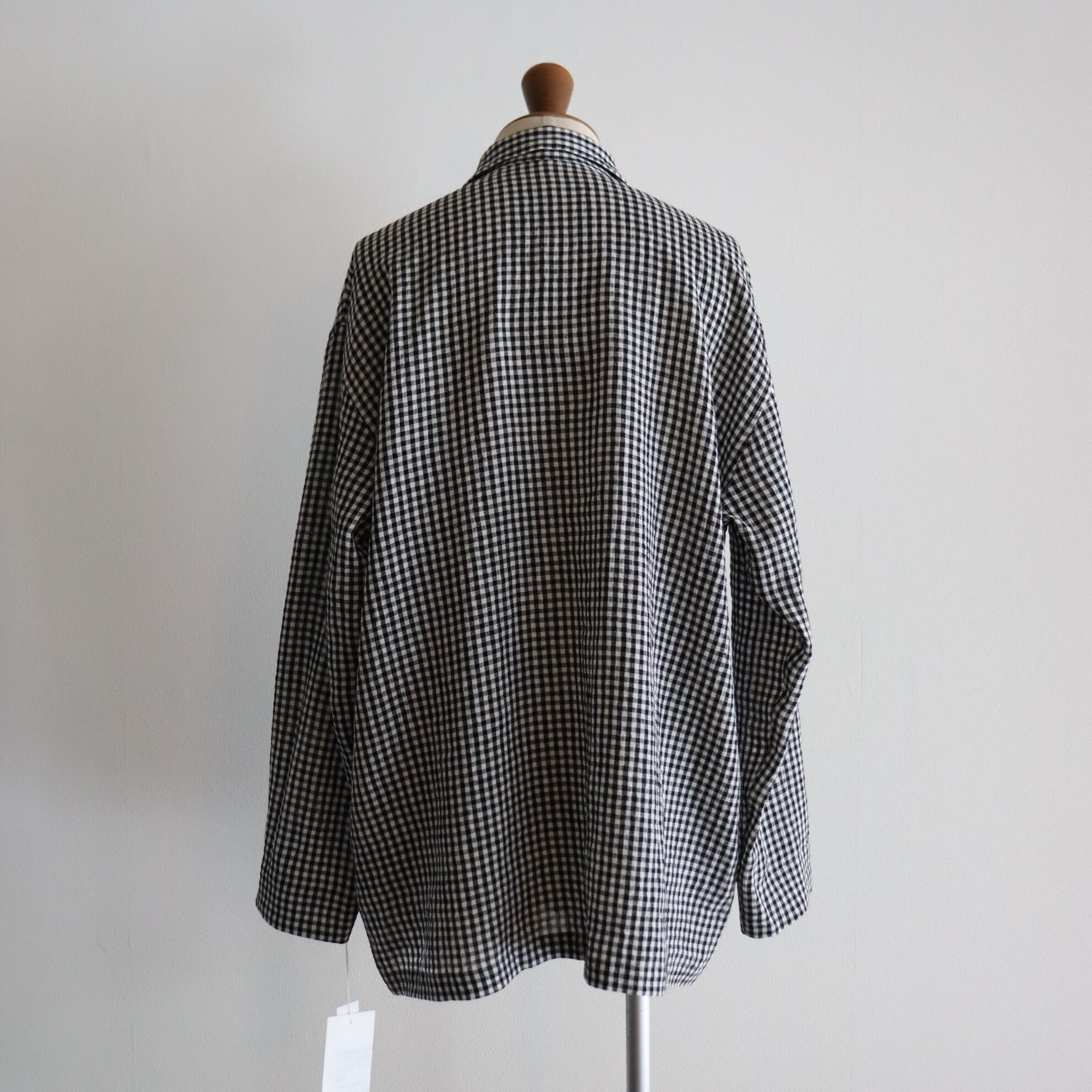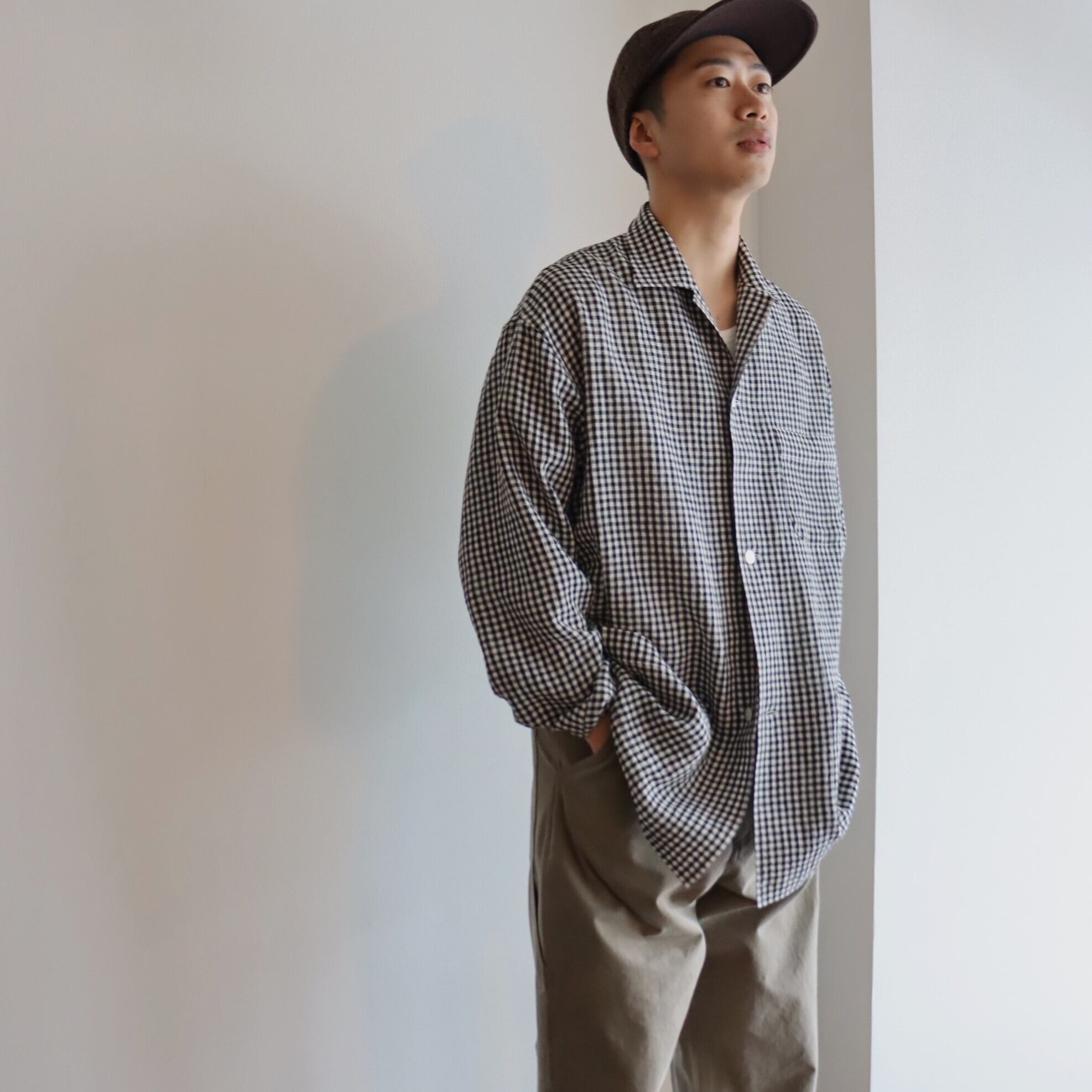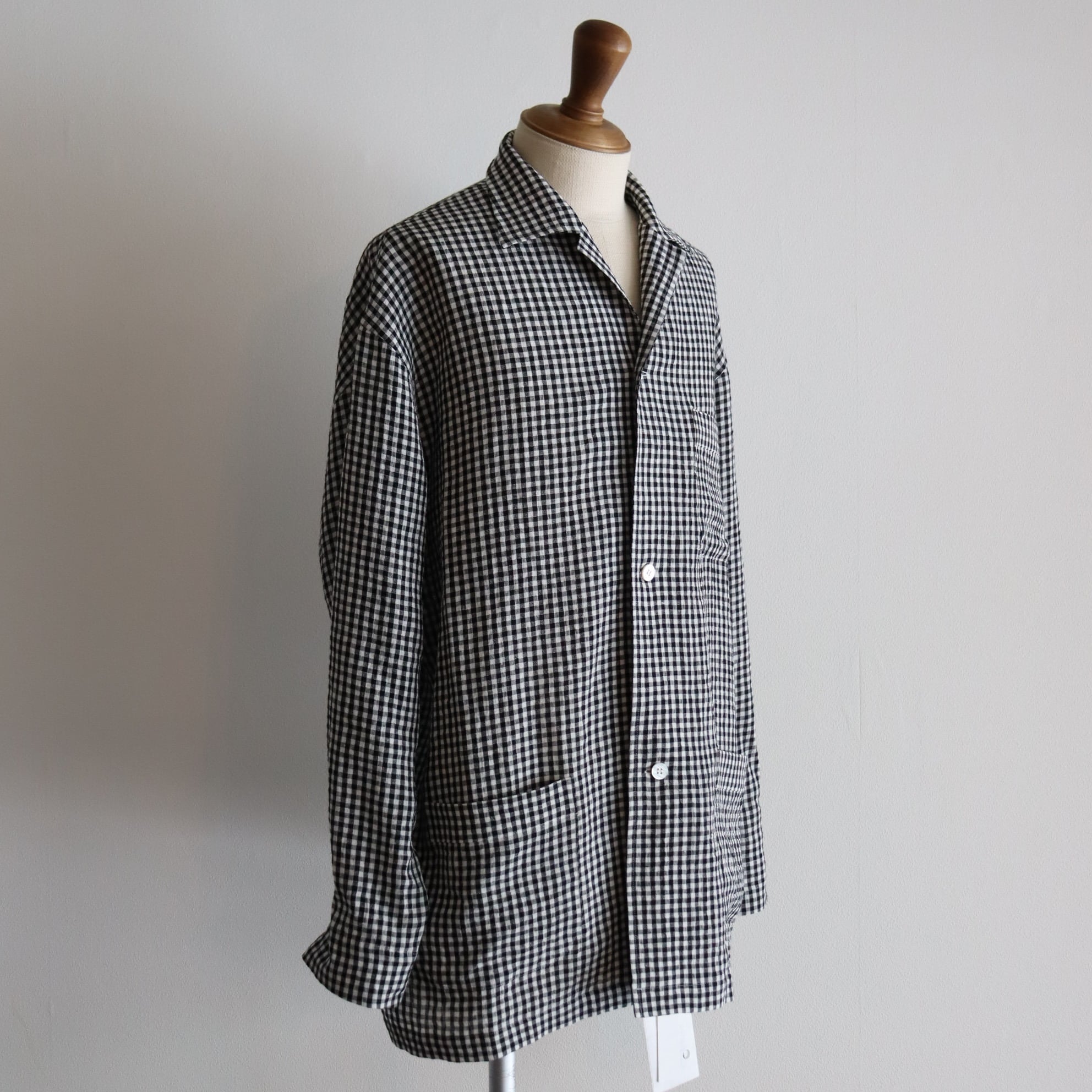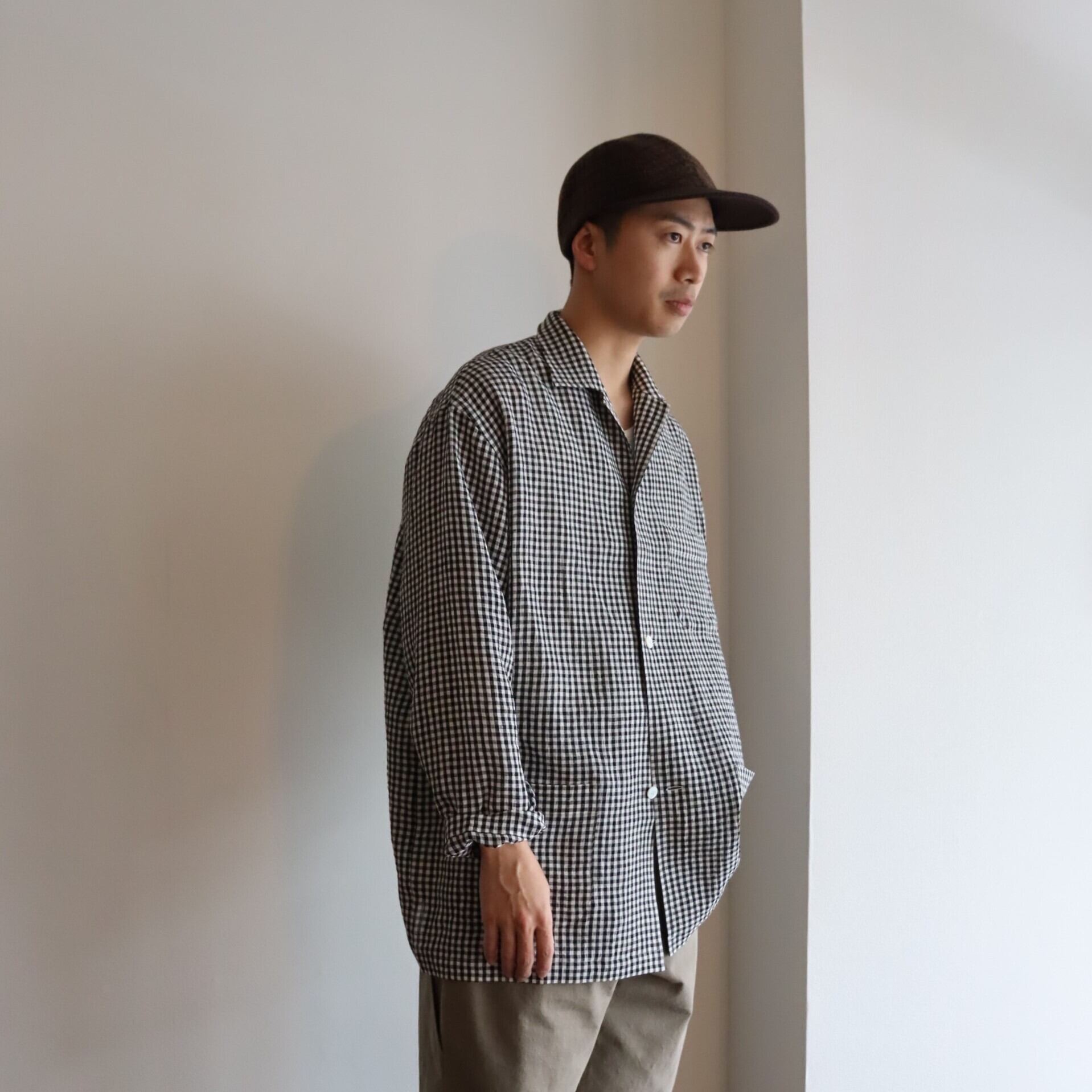 ウオーターツイストリネン素材を使用し、非常に清涼感のあるタッチに仕上げたギンガムチェックシャツJKT。