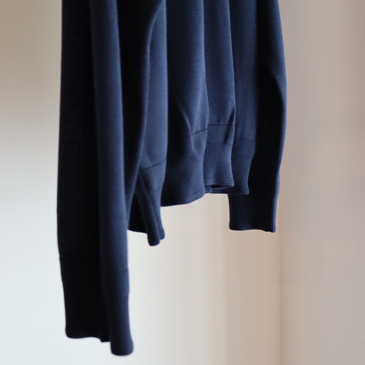 総針仕立てにし身頃の天竺との編み地を変えてシルクの質感の見え方に変化を付けております。袖口はミリタリーのヘンリーネックシャツを取り入れリブと片畦編みの切り替えのティ