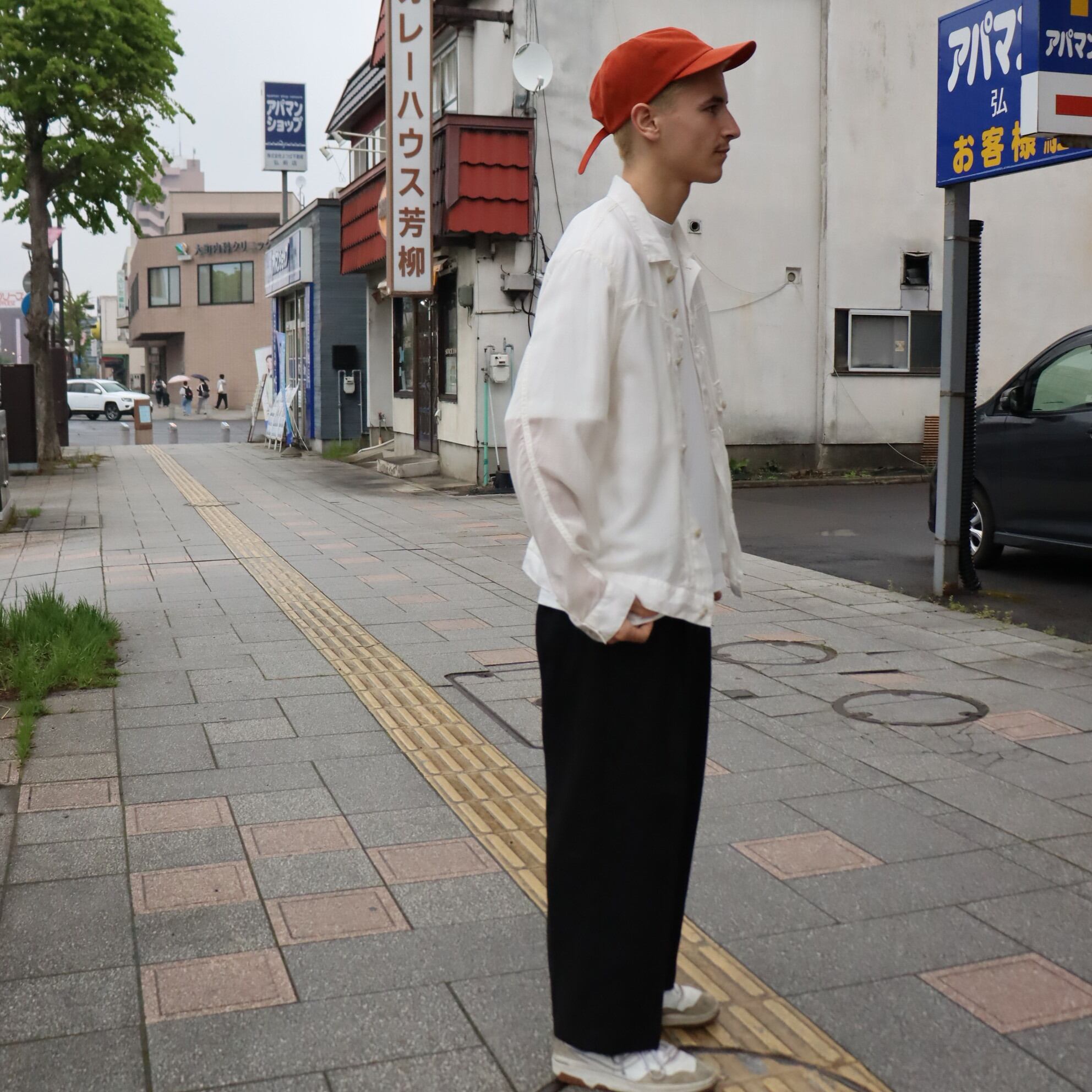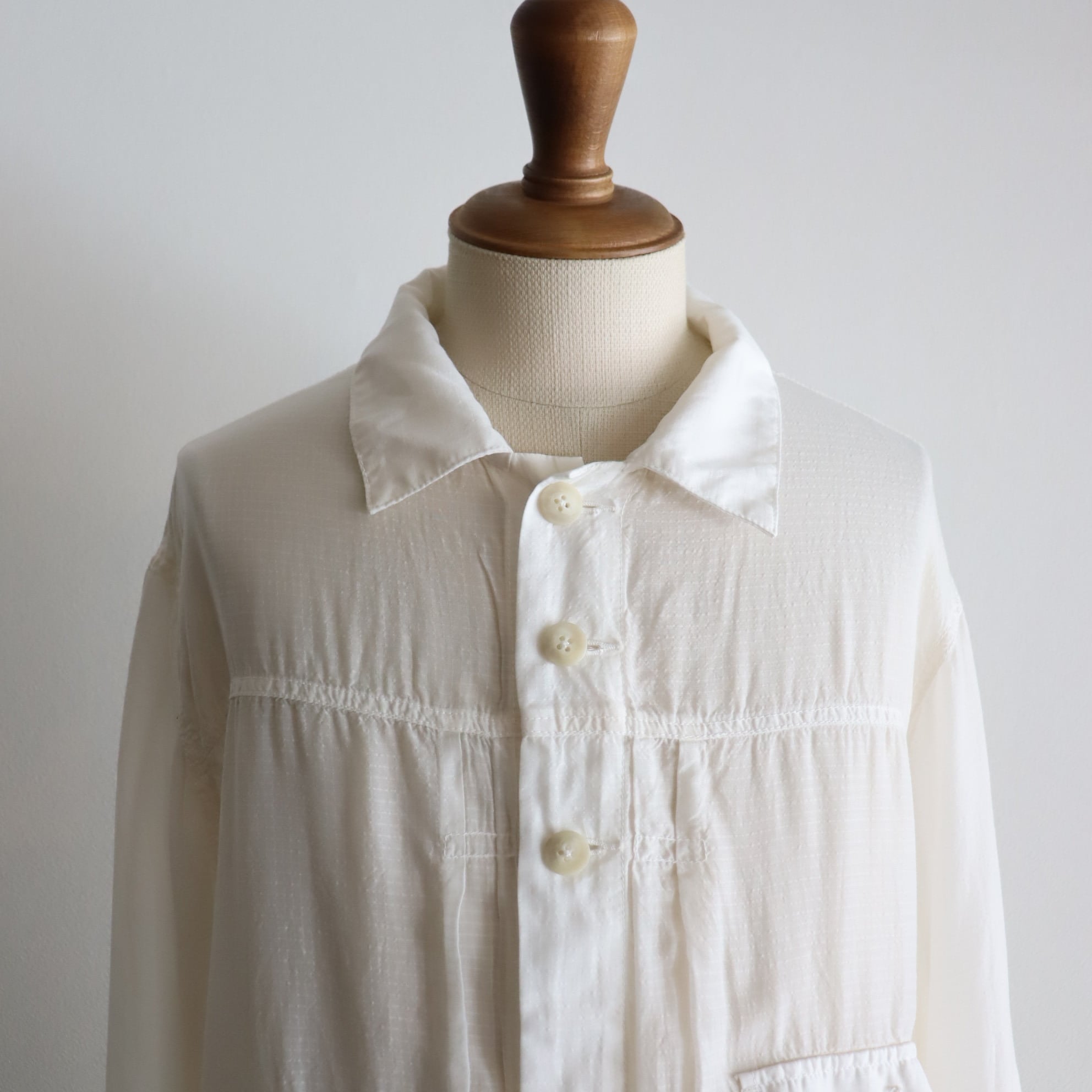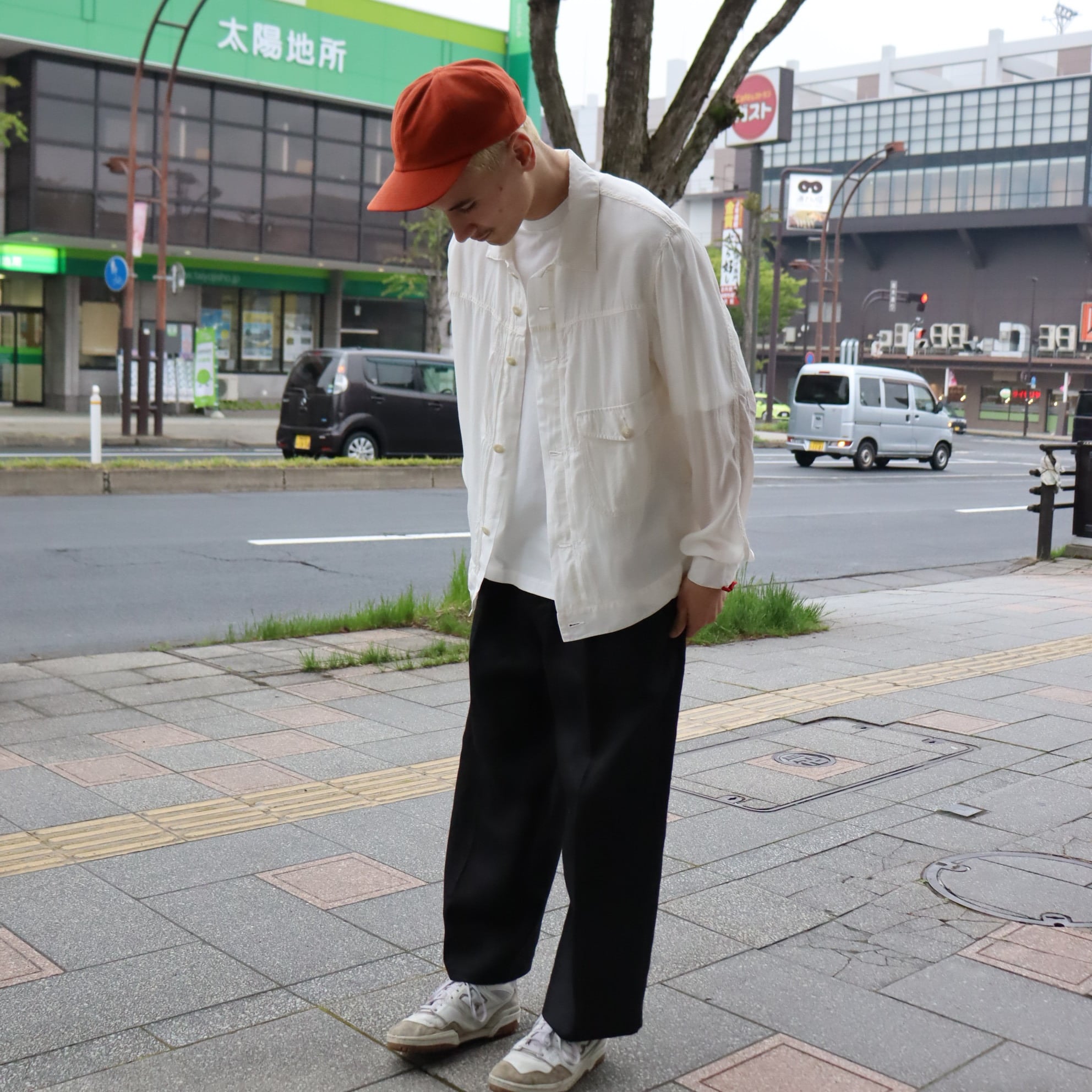 シルエットやボリューム感をチューニングしています。素材は桐⽣の機屋で織り上げた細番⼿のキュプラリップストップのオリジナルファブリックを採⽤。キュプラとは"コットンリンー”と呼ばれる綿を収穫した際に採れる綿の種⼦の周りにあるうぶ⽑を繊維にした再⽣繊維で、ジャケットの裏地に良く使⽤されるのは吸湿性があるという機能性によるもの。繊維が細く、⽇本でしか織れない特別な素材です。そのキュプラに洗いや加⼯を加えた時に⼊る縦シワの⾵合いが光沢を緩和させ、リラックス感ある優しいワークアイテムに仕上がっています。ボタニカルのハイブリッドの後染加⼯を施しています。
