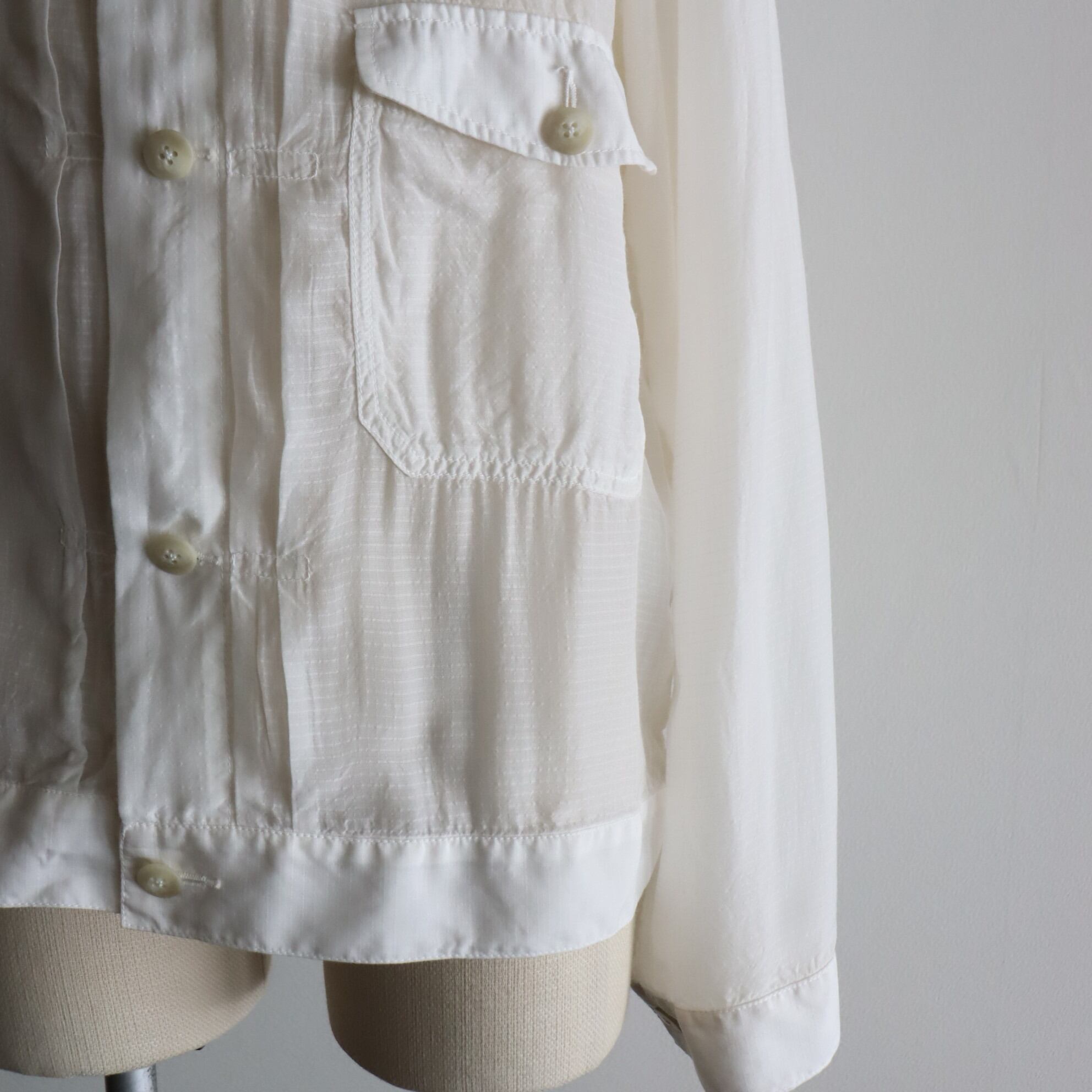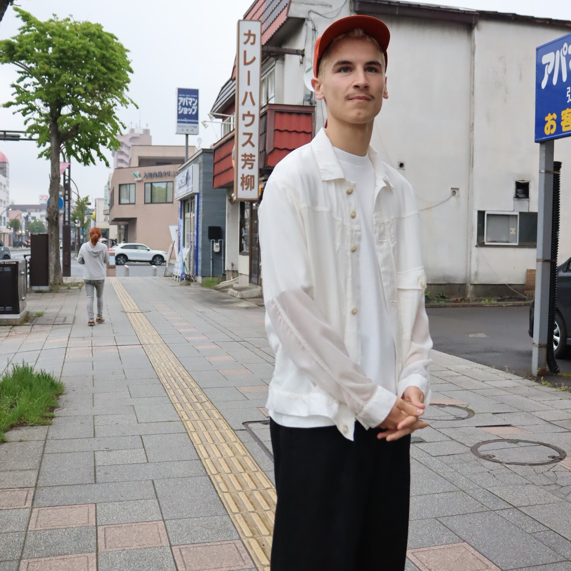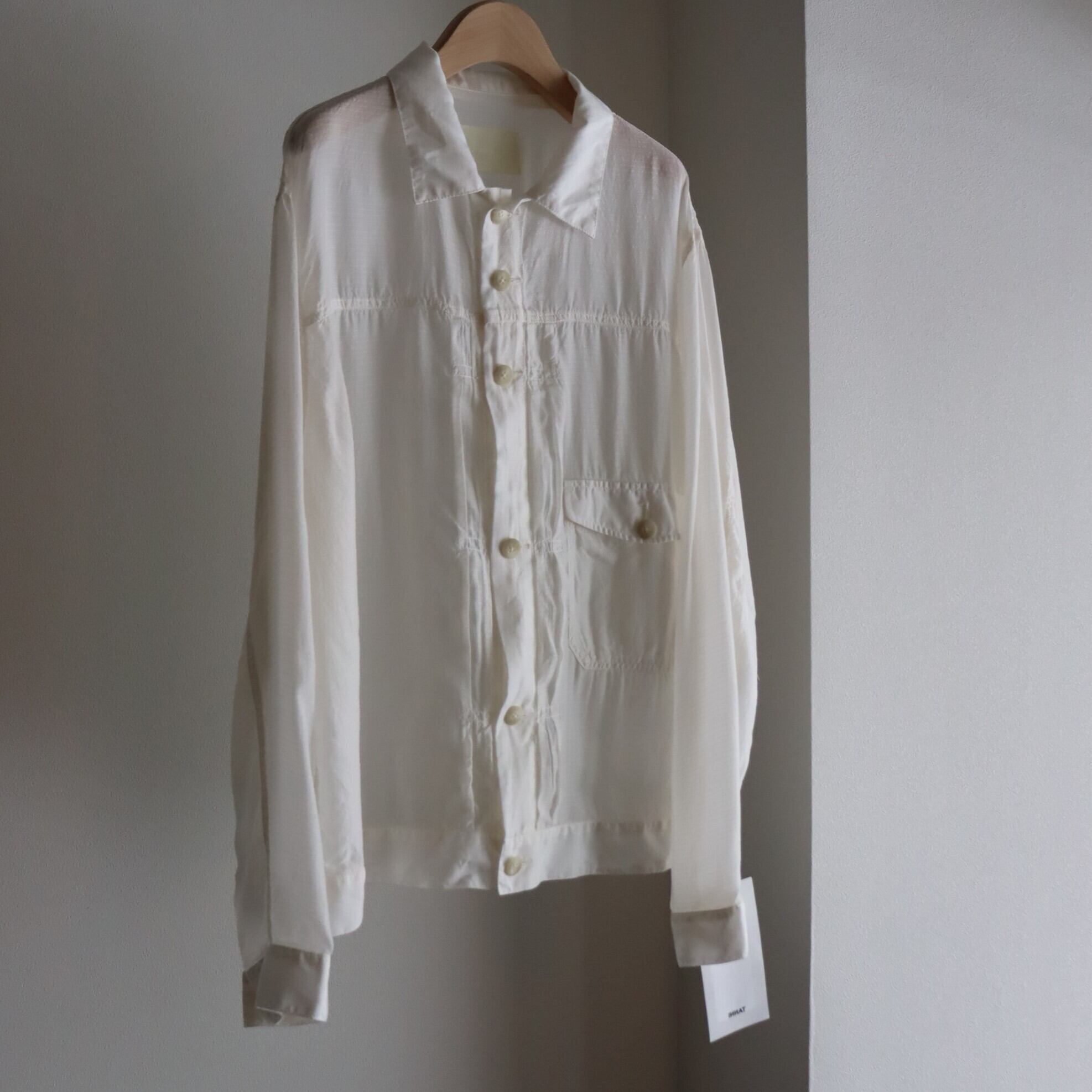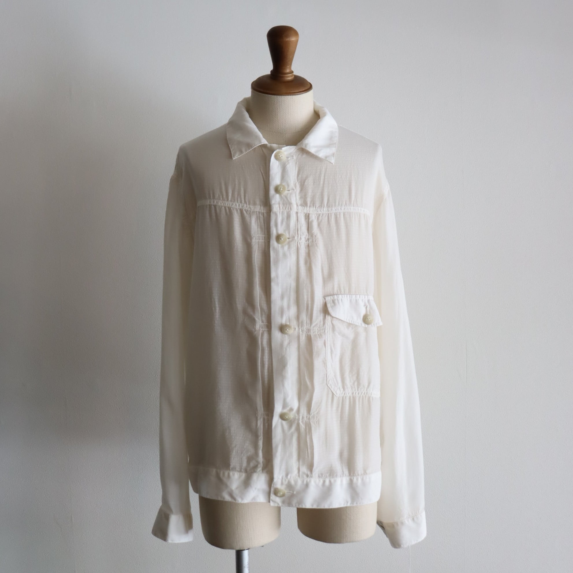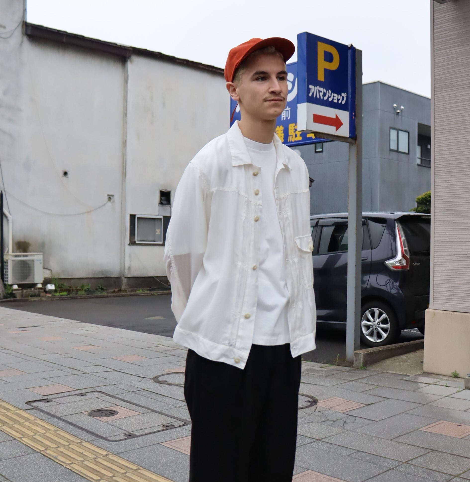デザイナーが夏場でも⽻織れる軽いGジャンを作りたい、と思い製作したシャツジャケット。デザインは、某デニムブランドのTYPE1のモデルをオマージュ。