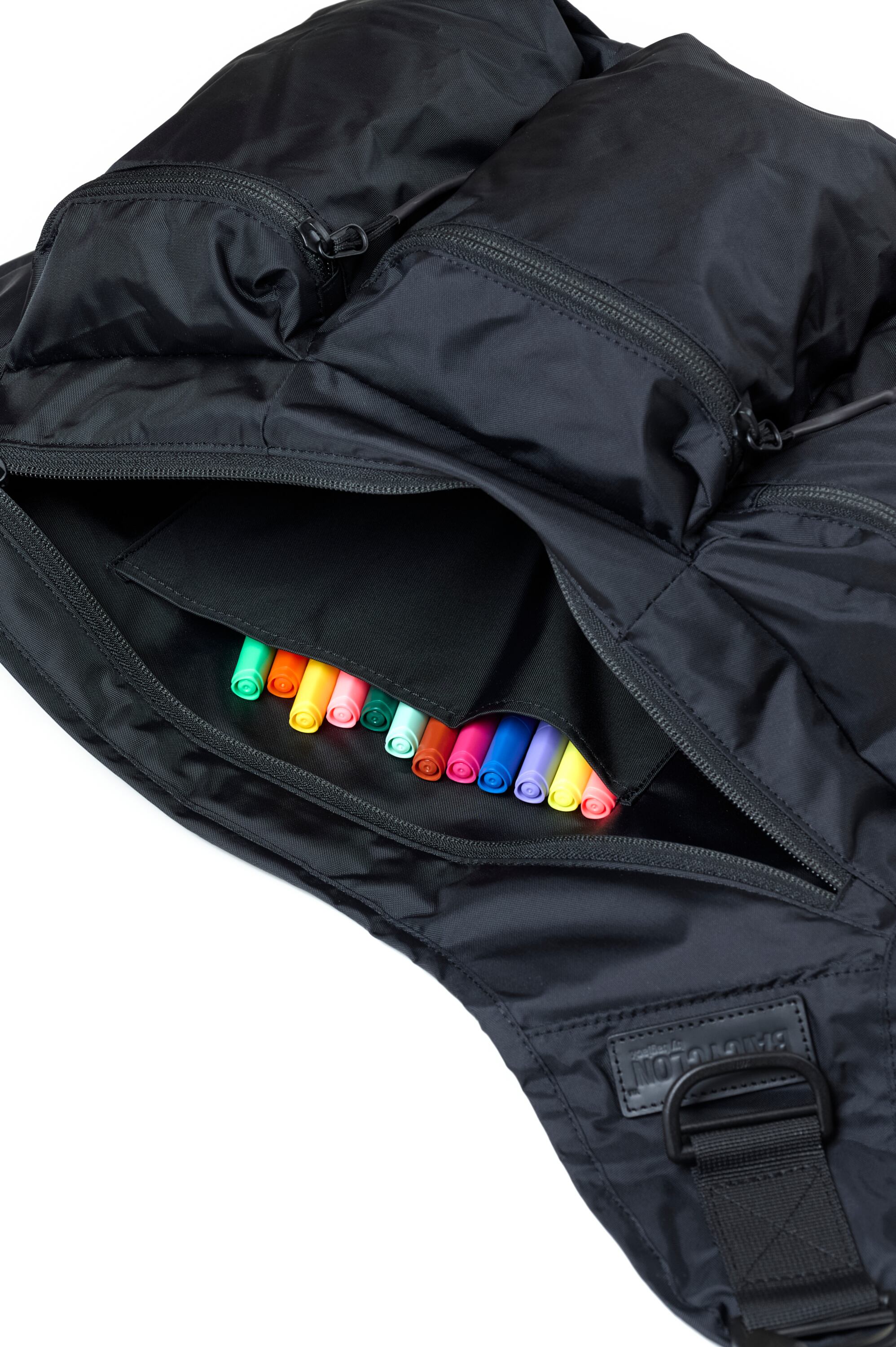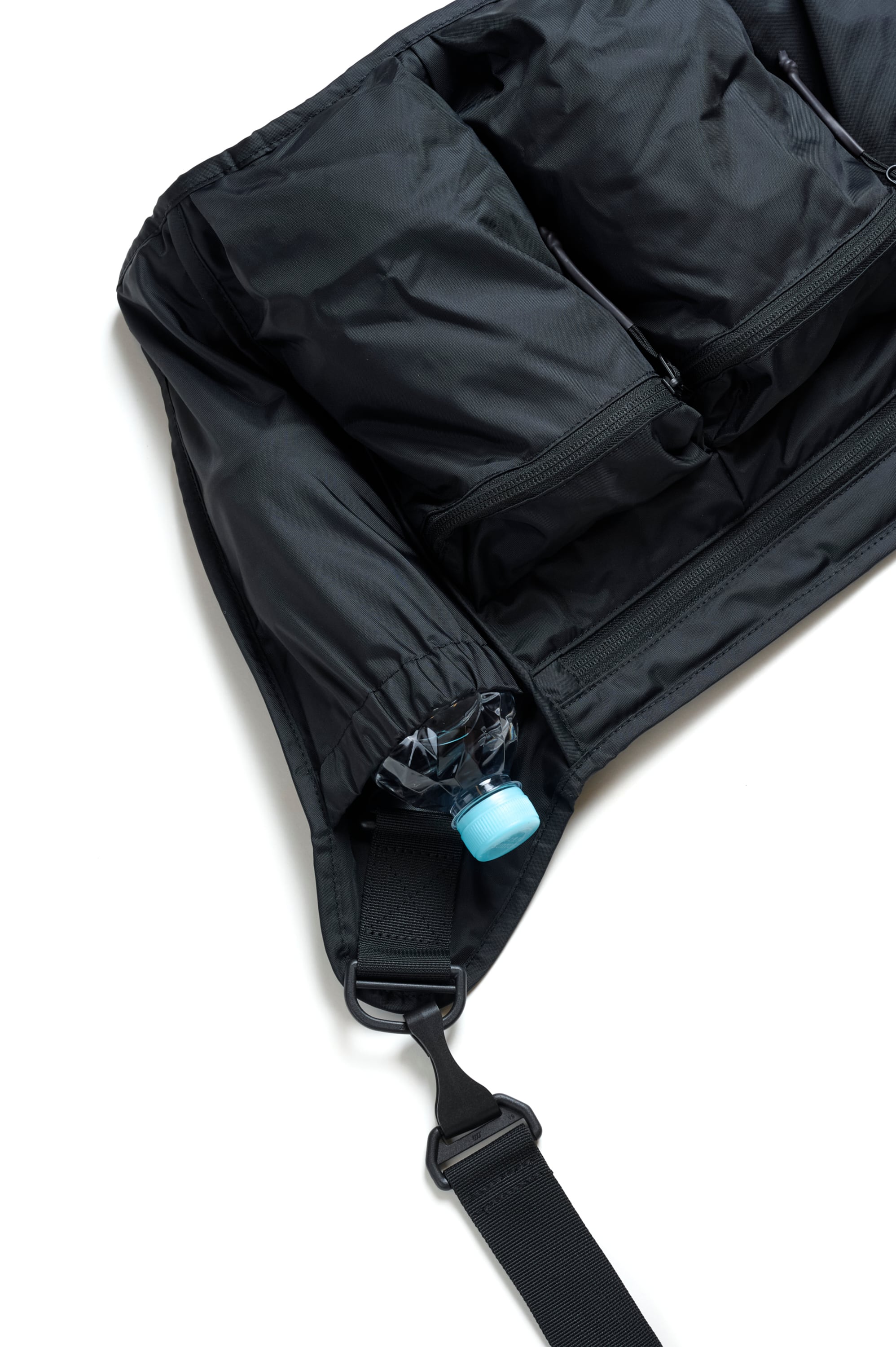 フロント部分には容量の多い筒状のZIPポケットを3つに、ペットボトルホルダーを取り付けております。