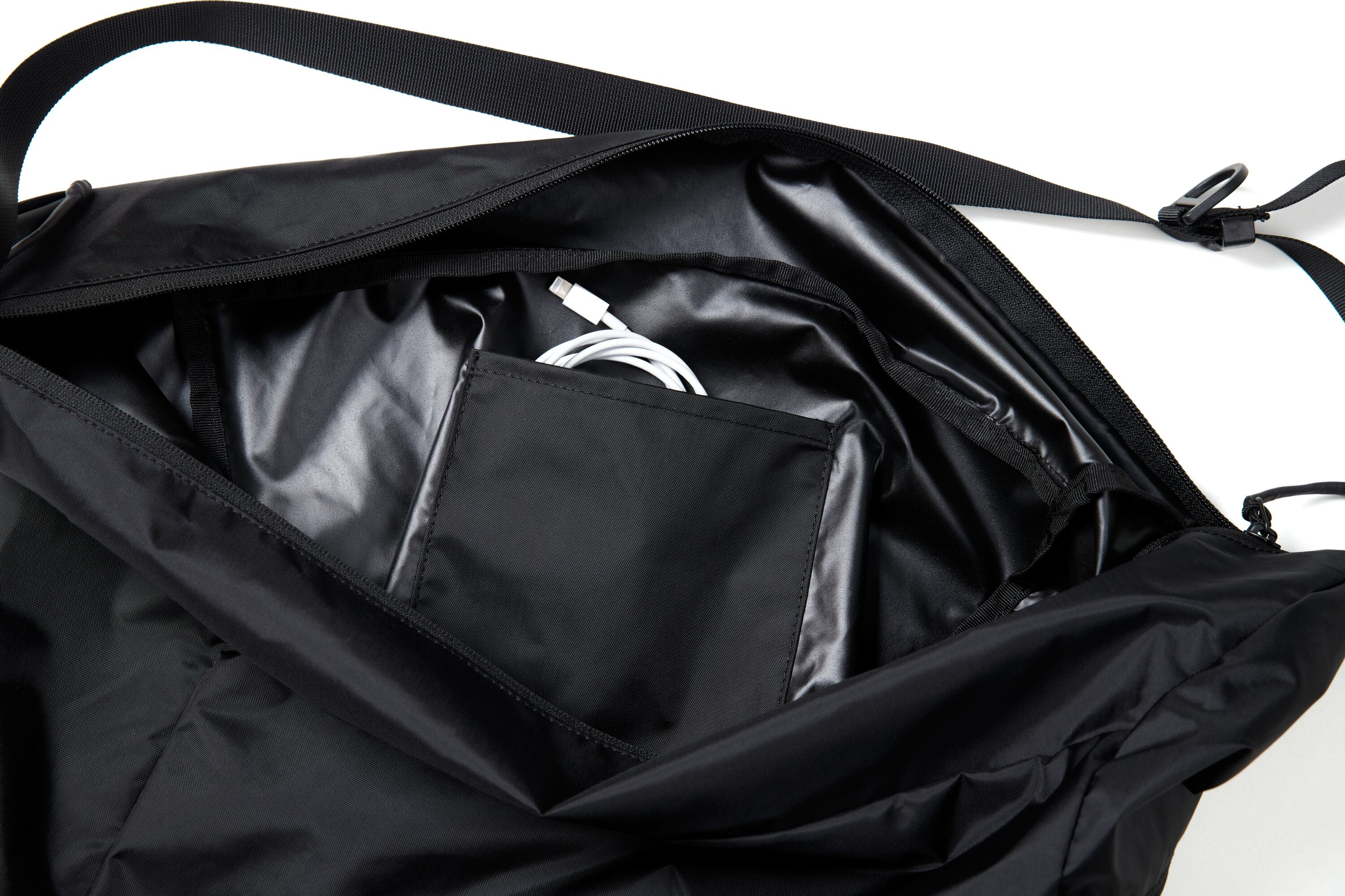 サイドにファスナーポケット、内側に小物用ポケット付き。