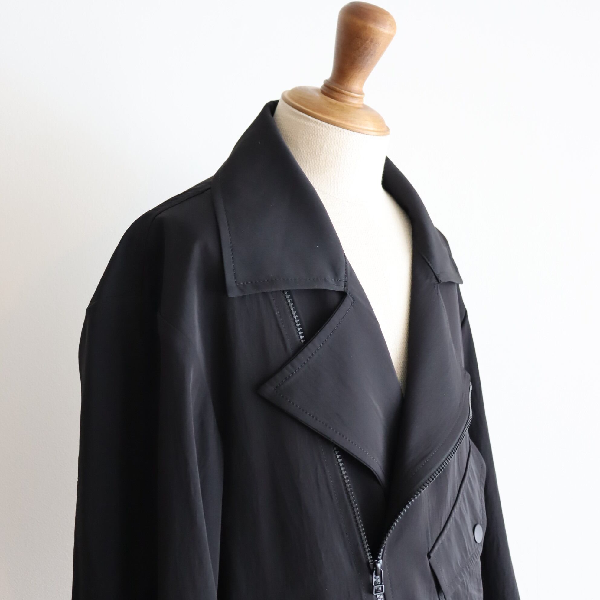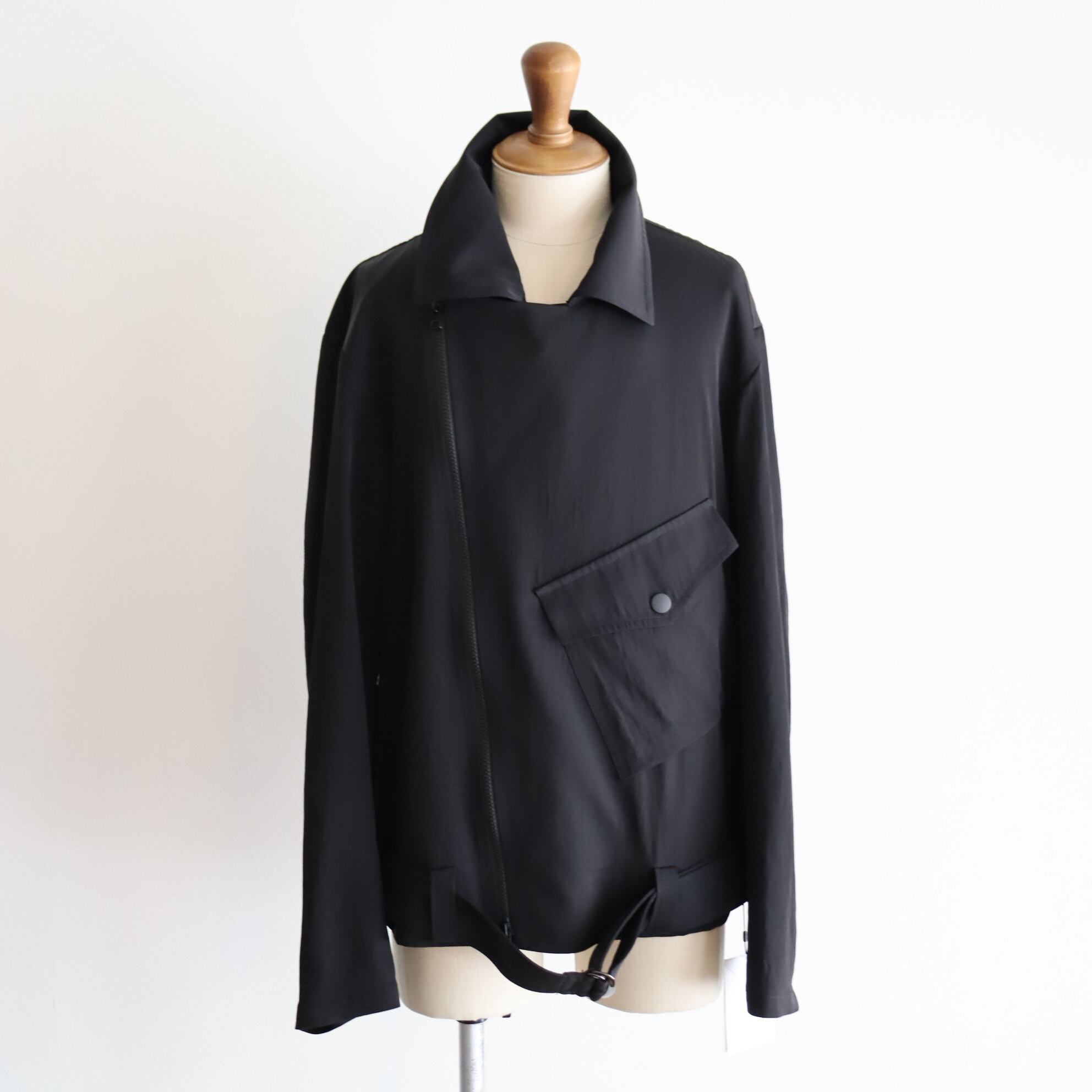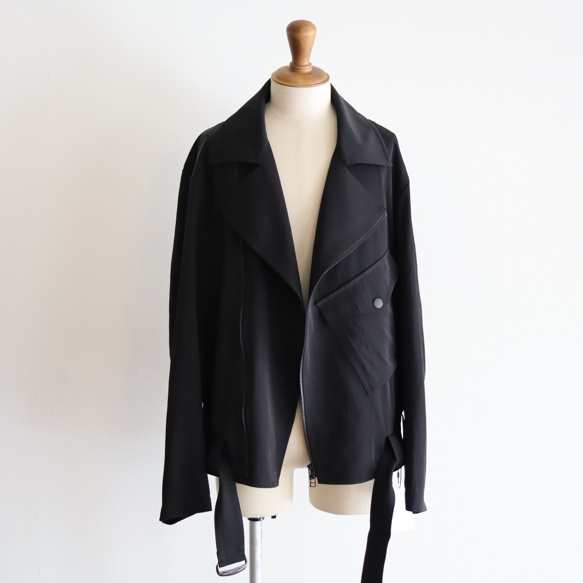 収縮率の異なる⽷を組み合わせることよって⽣まれるナチュラルなシワ感が特徴の⽣地を使用したライダースJKT。トリアセテートの上品な膨らみとドライタッチな⼿触りが魅⼒です。 ドロップショルダーから成る特徴的なシルエットに、リラックス感のあるサイズならではのスタイリッシュさを醸し出します。ライダースジャケットの雰囲気は残しつつ、ディテールを削ぎ落し、洗練された印象とミニマルさを追求しております。