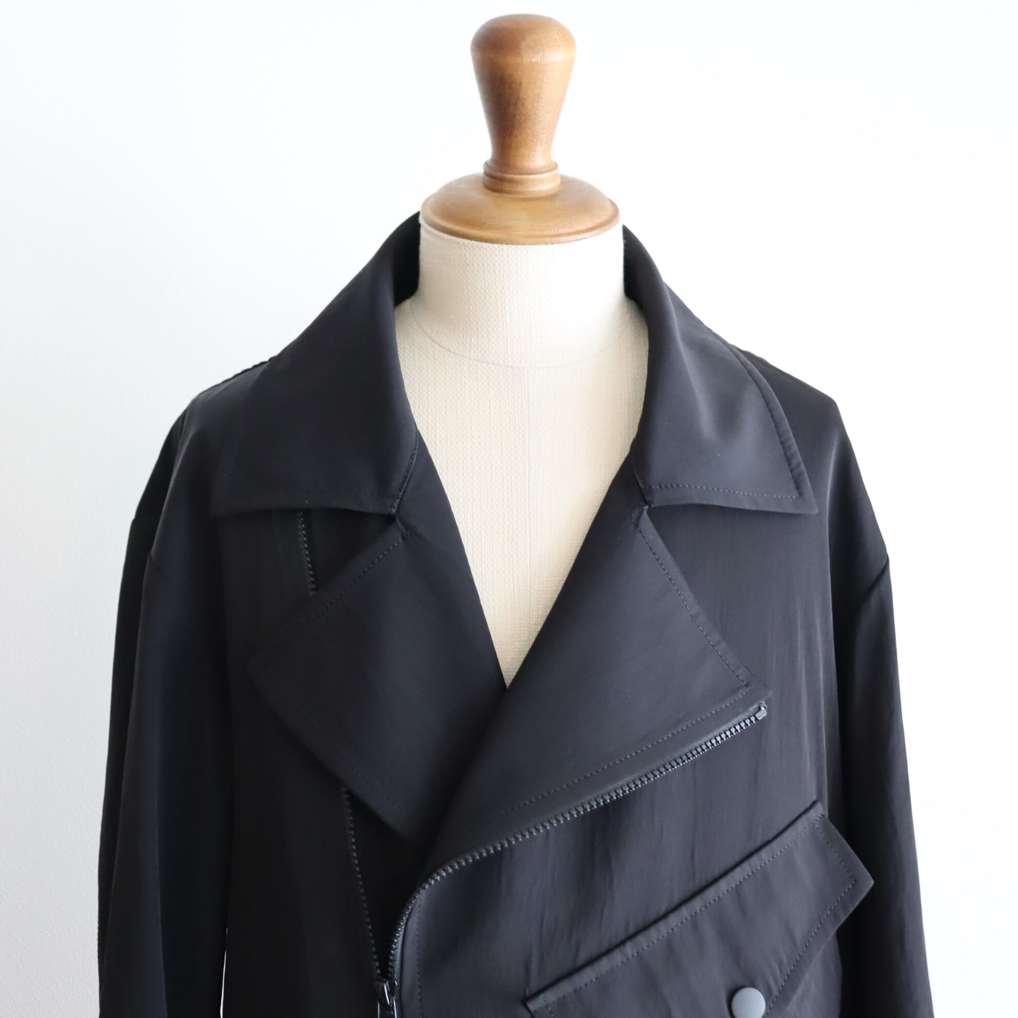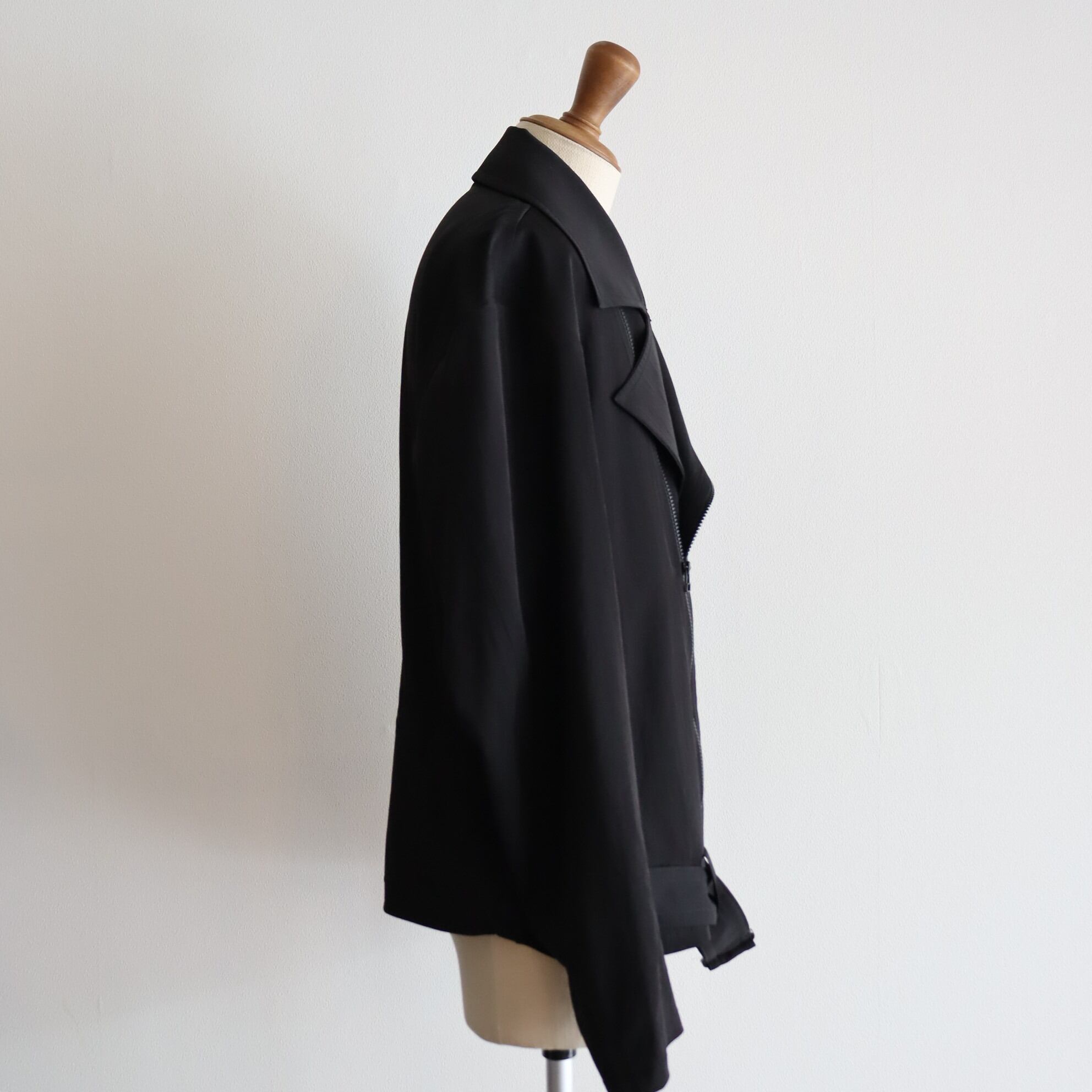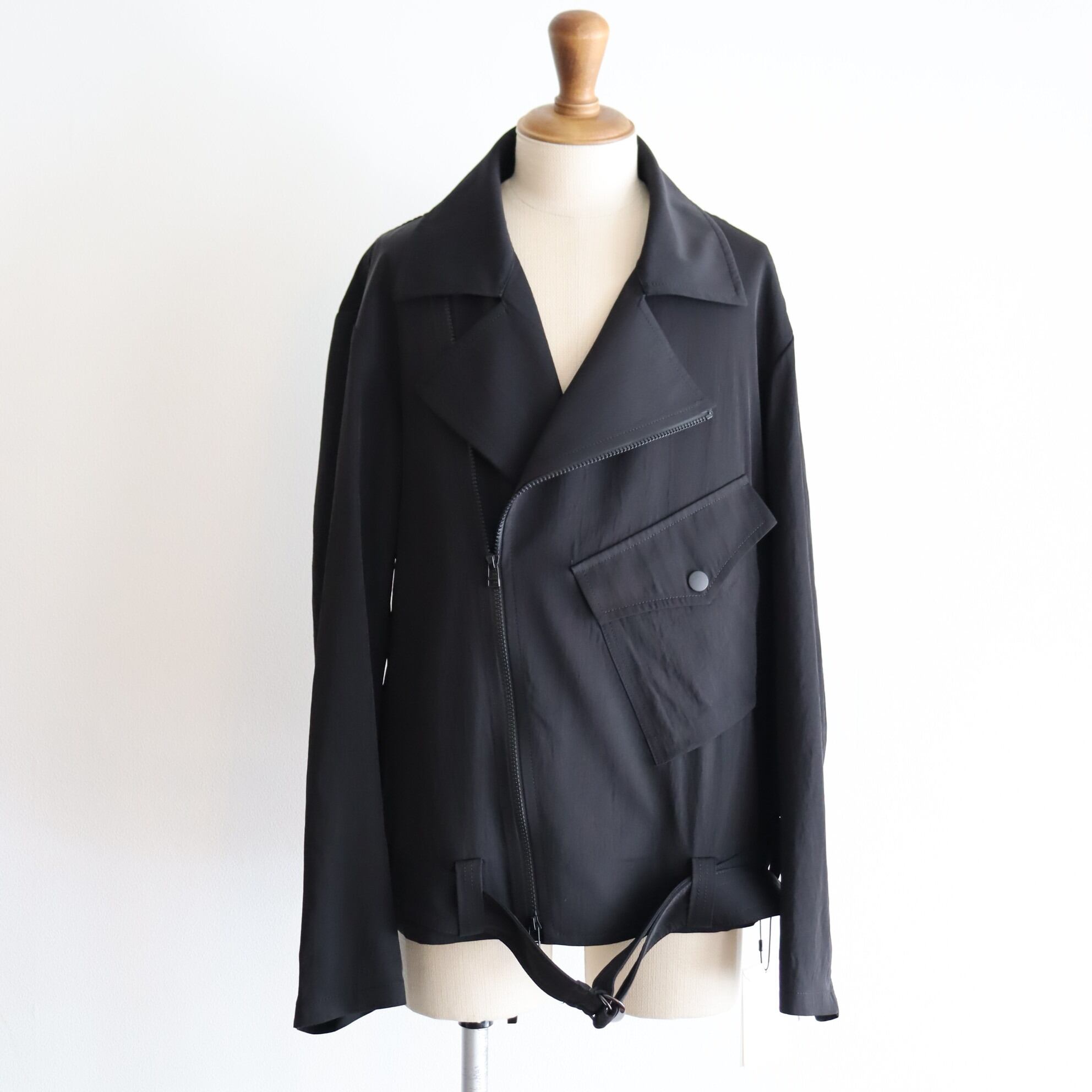 収縮率の異なる⽷を組み合わせることよって⽣まれるナチュラルなシワ感が特徴の⽣地を使用したライダースJKT。トリアセテートの上品な膨らみとドライタッチな⼿触りが魅⼒です。 ドロップショルダーから成る特徴的なシルエットに、リラックス感のあるサイズならではのスタイリッシュさを醸し出します。ライダースジャケットの雰囲気は残しつつ、ディテールを削ぎ落し、洗練された印象とミニマルさを追求しております。