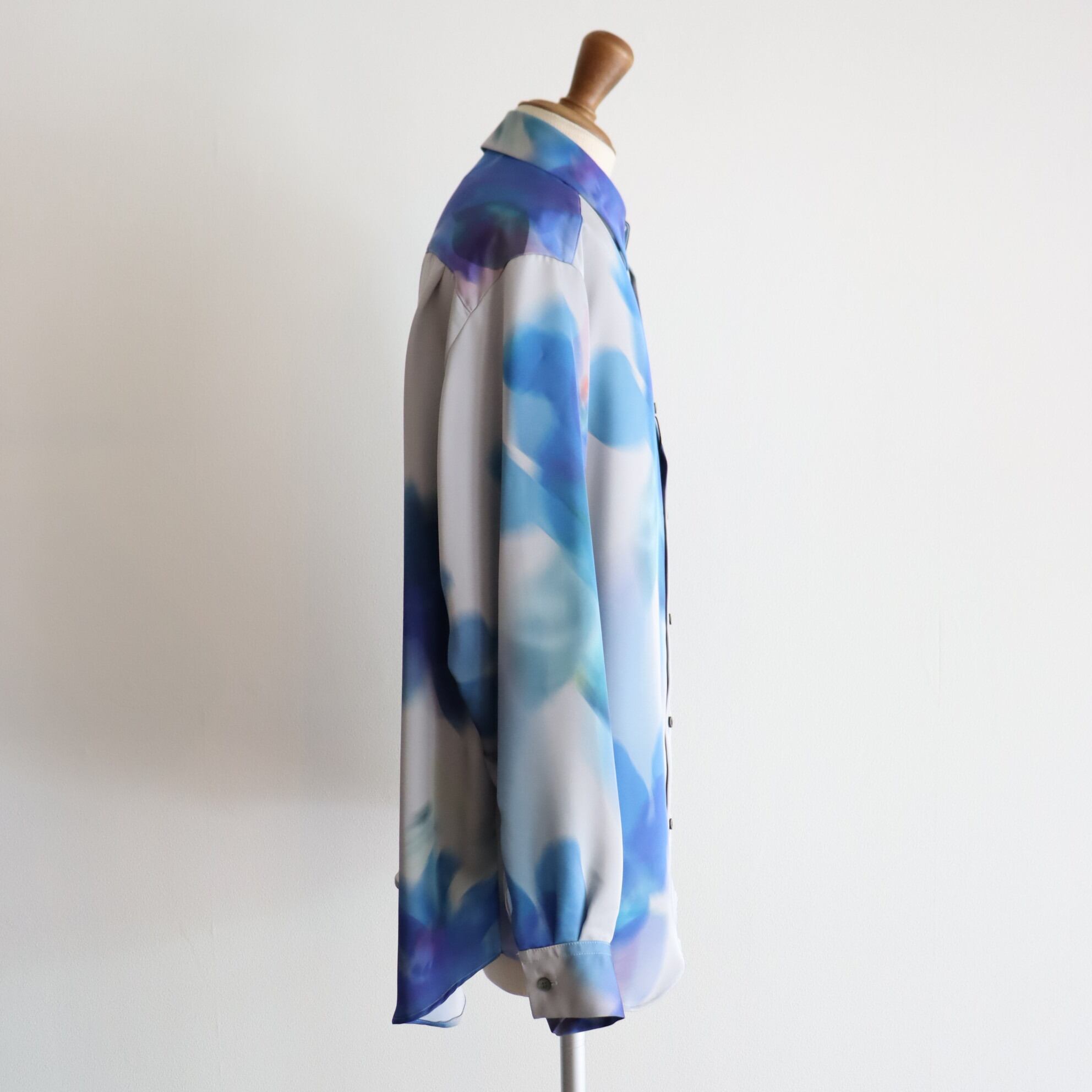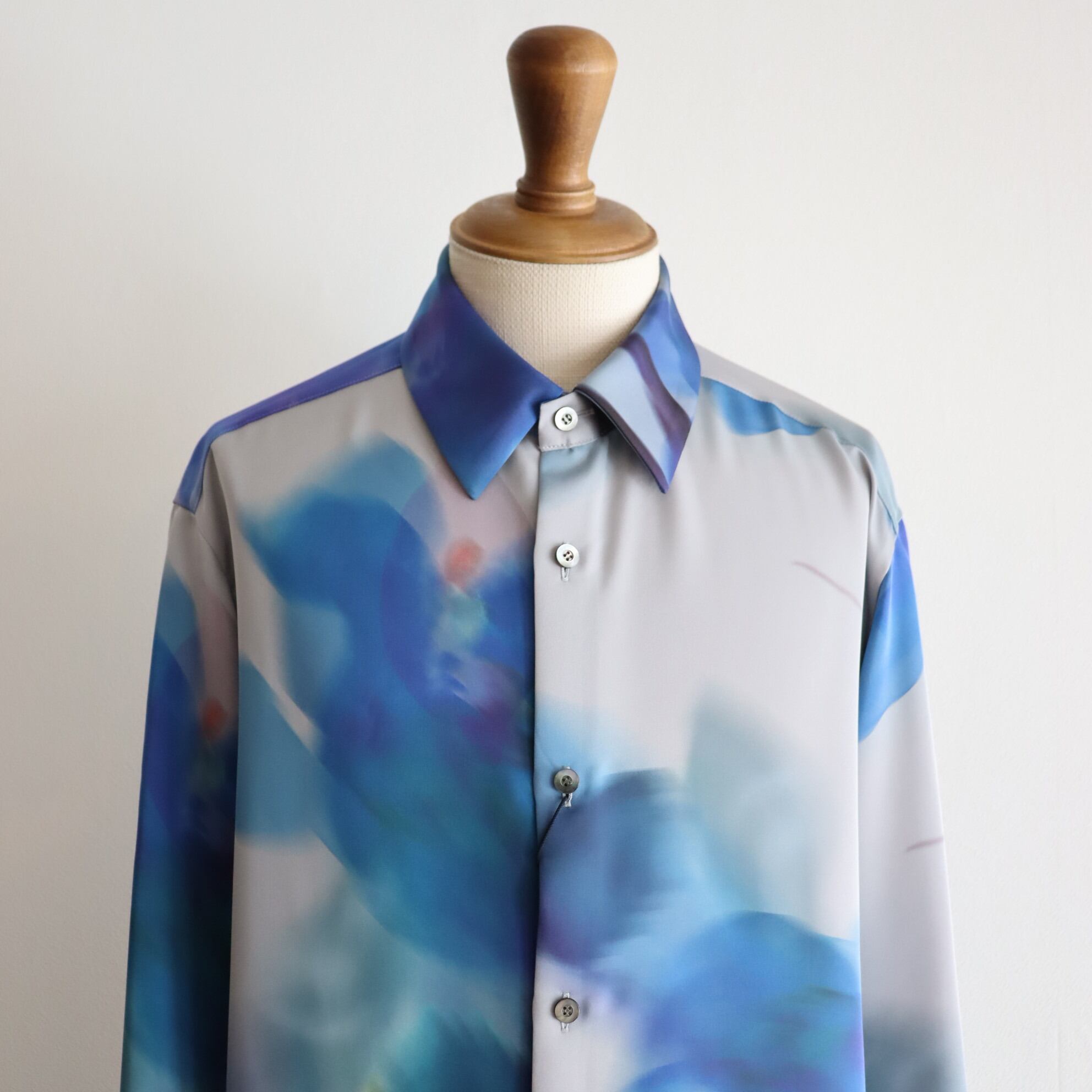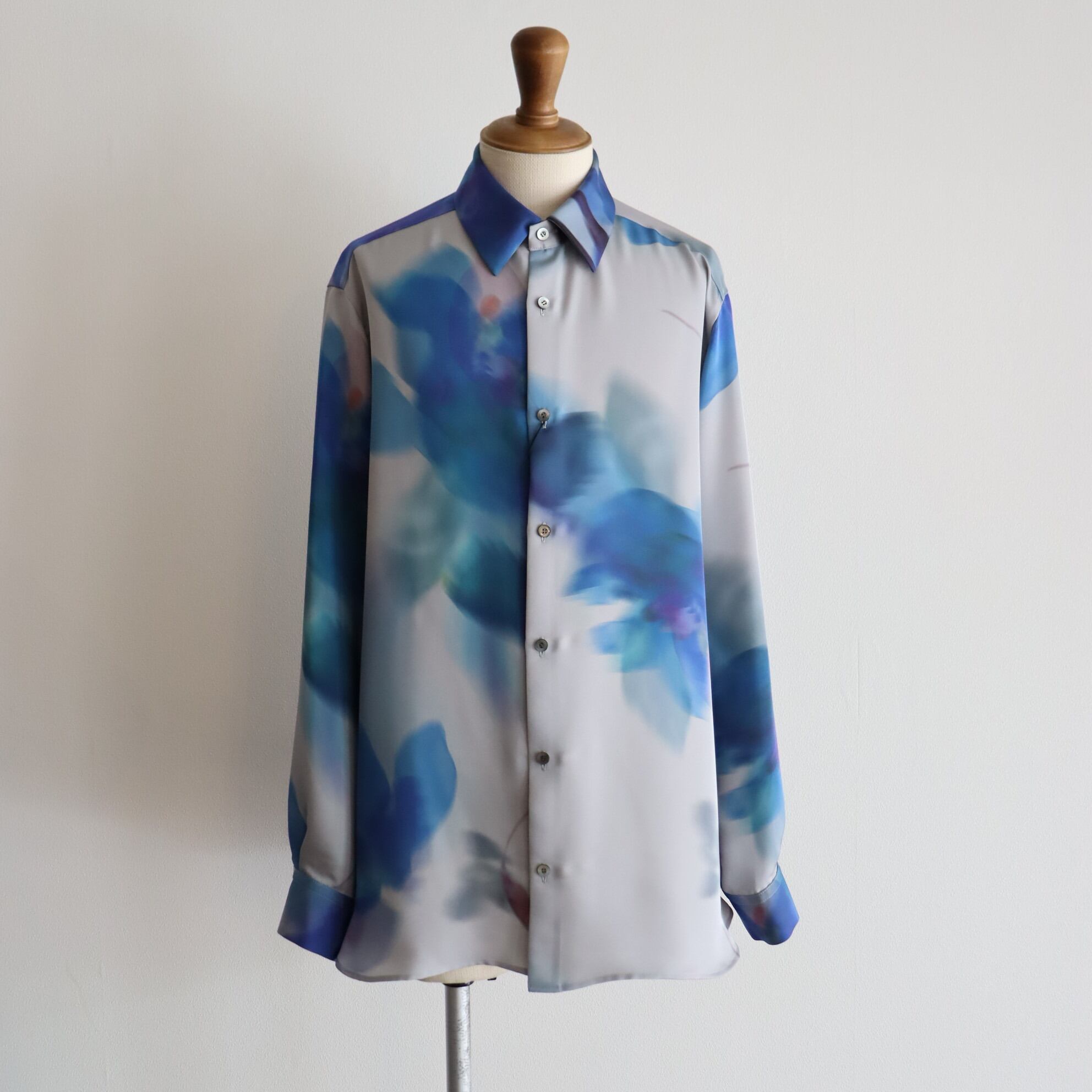 「⽬を閉じ、脳裏に浮かぶ儚く美しい記憶の情景を妄想によって⽣まれた植物で表現された図案」をコンセプトに、しなやかなサテンに儚くも⼤胆に配したフラワープリントが印象的な⽣地です。 ベーシックなデザインのレギュラーカラーシャツです。素材の揺らぎを楽しんで頂けるリラックス感のあるシルエットです。