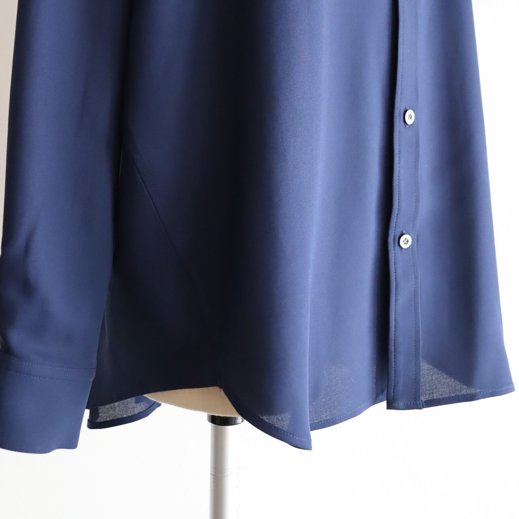 上質なコンパクト⽷を使⽤した⾼密度織による、上品な仕上がりの⽣地を使用したフルオープンシャツです。特殊な加⼯を掛け合わせることにより、独特な⼿触りと反発感が特徴です。 袖のタテハギや後中⼼が前⽴てのような仕様になっていて、開閉可能なデザインになっていす。前⾝頃や袖を開けた際のレイヤードのポイントになるスタイリングが可能です。