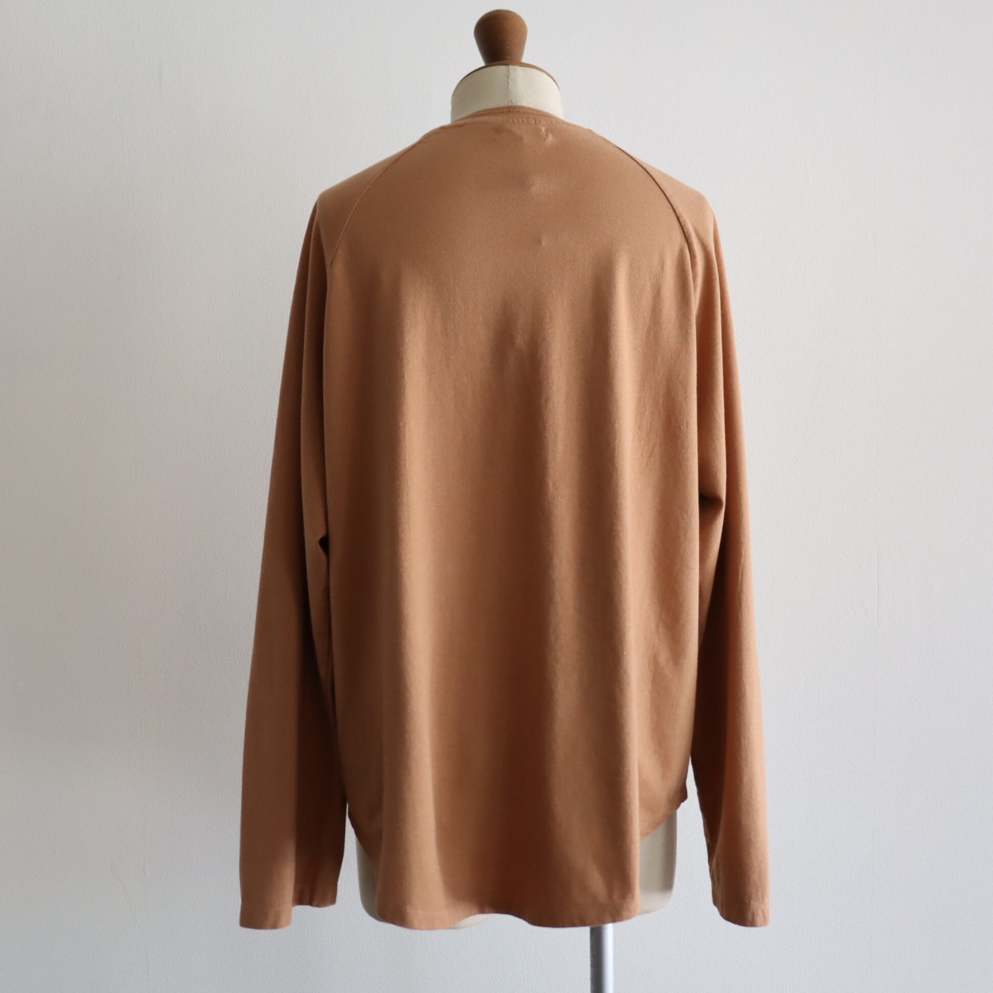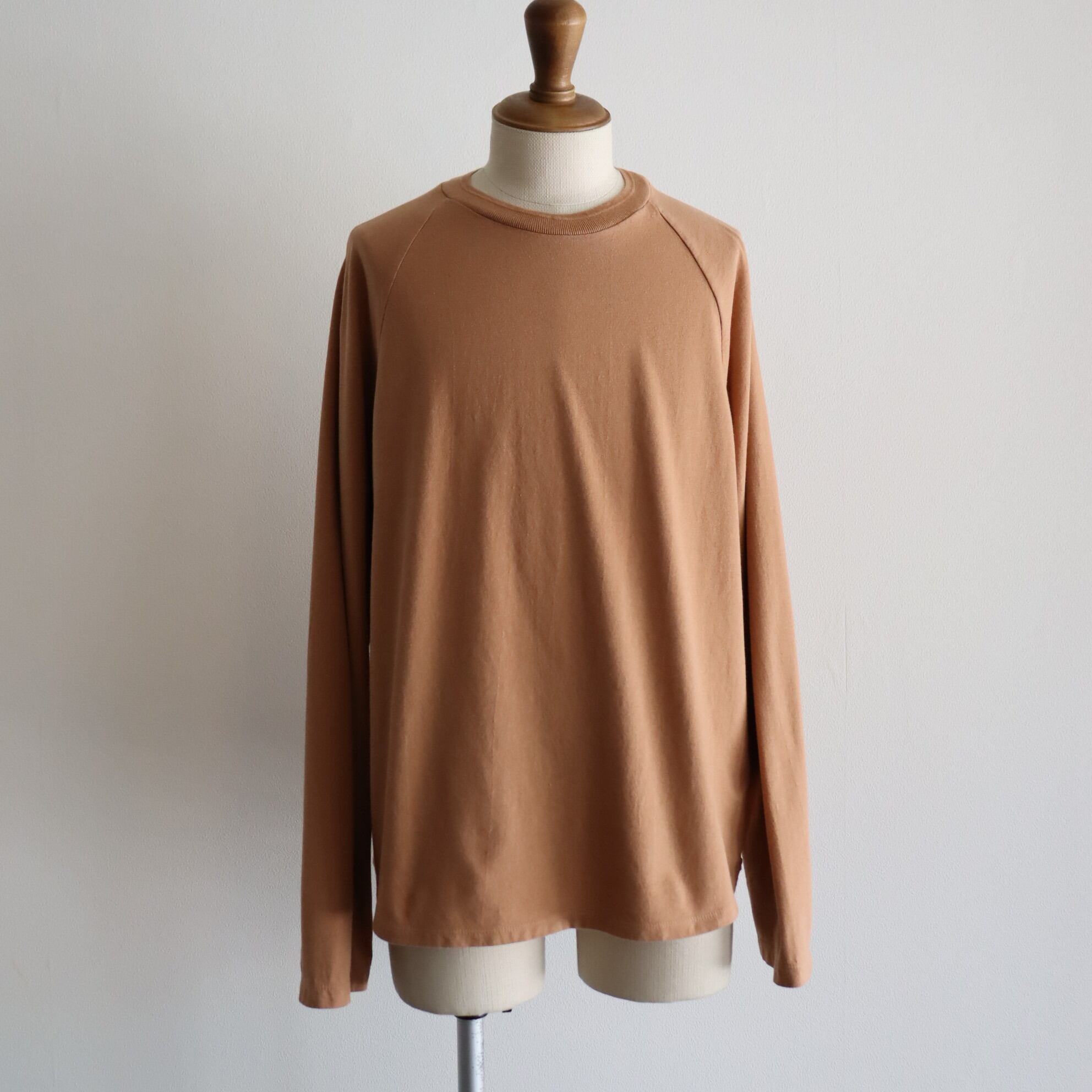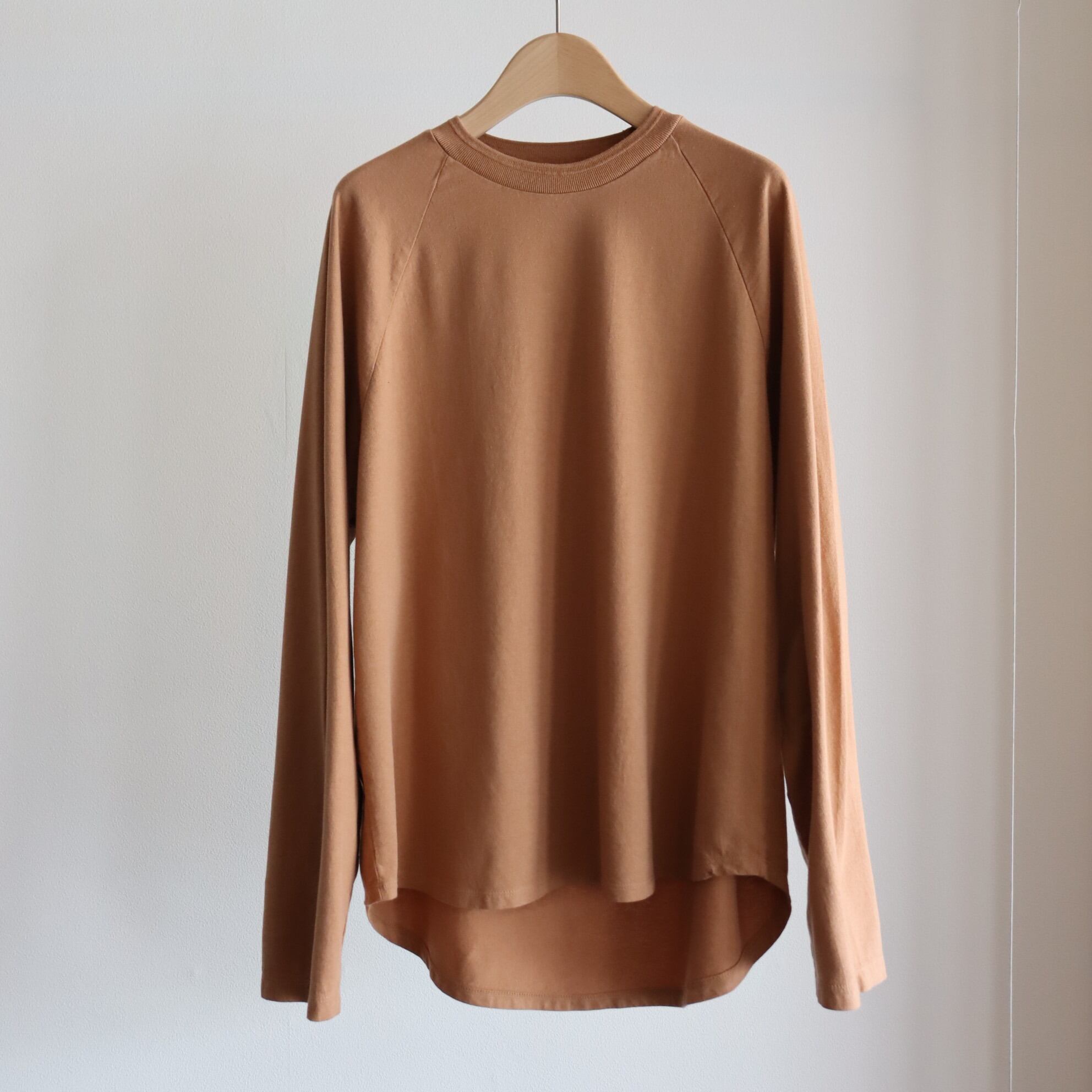 ラミーの持つ光沢感と表情のあるリネンを混紡することで独特の表情と光沢感のあるオリジナル生地を使用してシーズンカラーに製品染をしています。袖口までゆったりとしたサイジングにし、裾をラウンドさせたシンプルなBASEBALLTシャツ。襟ぐりのフライスにラインを入れアクセントに。ガバッと異素材のパンツに組み合わせて袖をためてきていただきたいです。