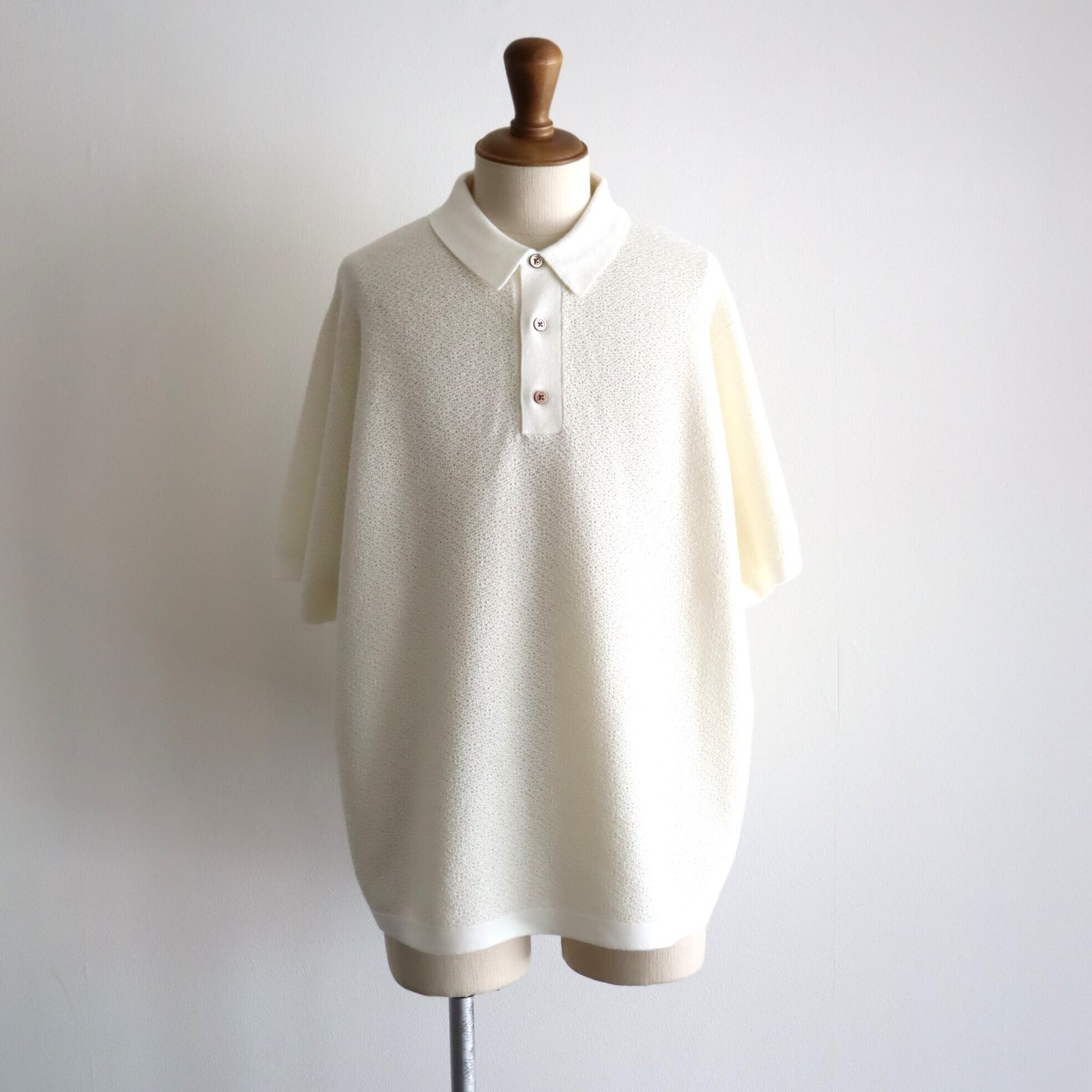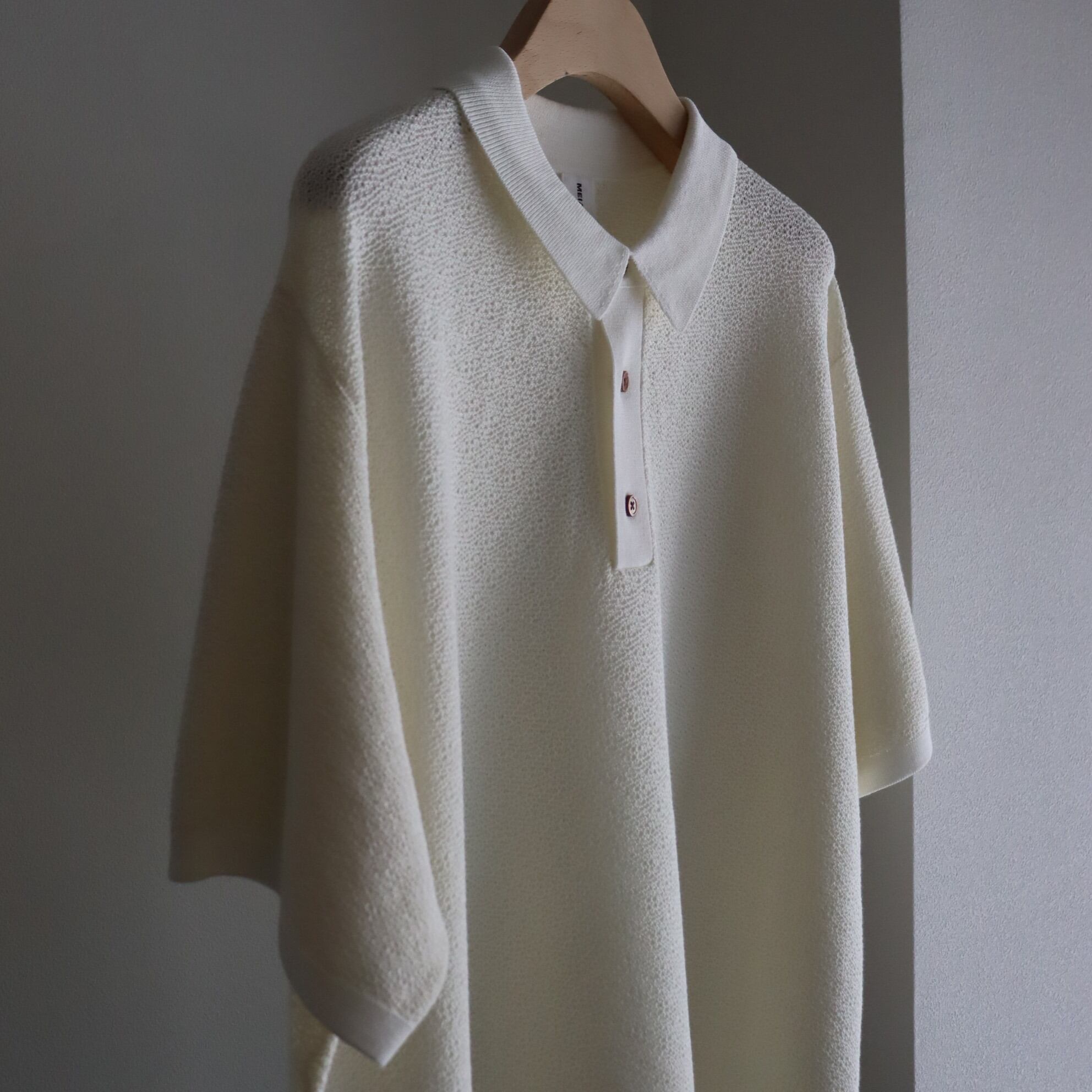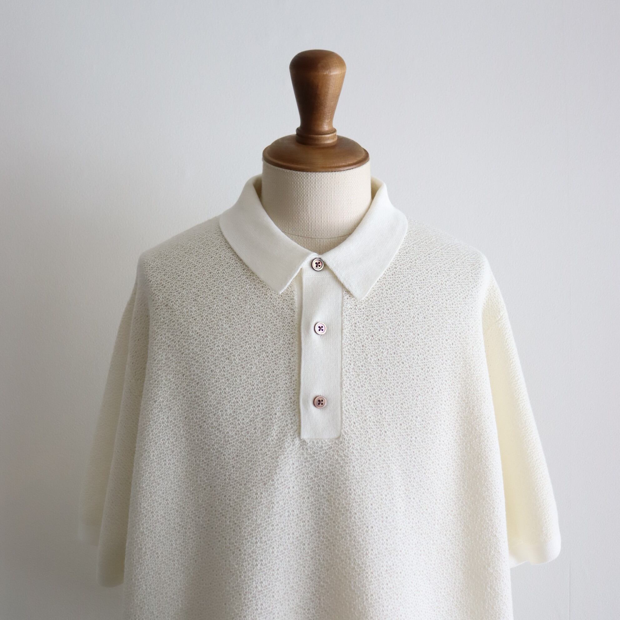 ギマ(擬麻)加工のコットン糸で凹凸のあるタック編みに編み立てることにより程よいハリ感と絶妙な透け感を作り、肌に貼りつかず、風を多く通す、清涼感のある着心地のニットポロ。