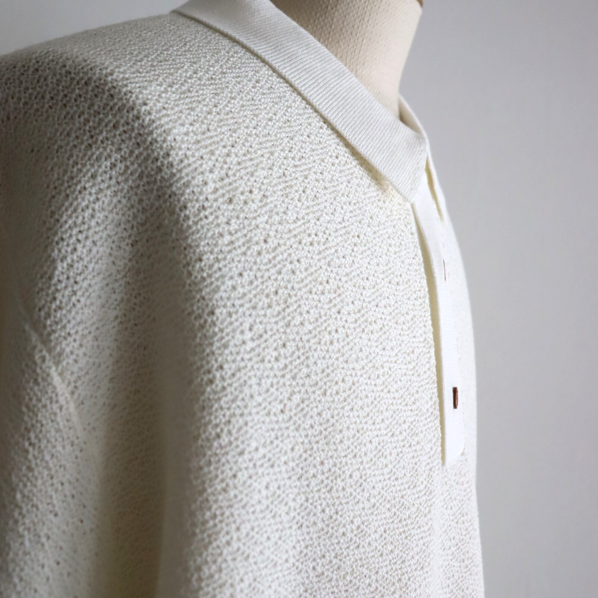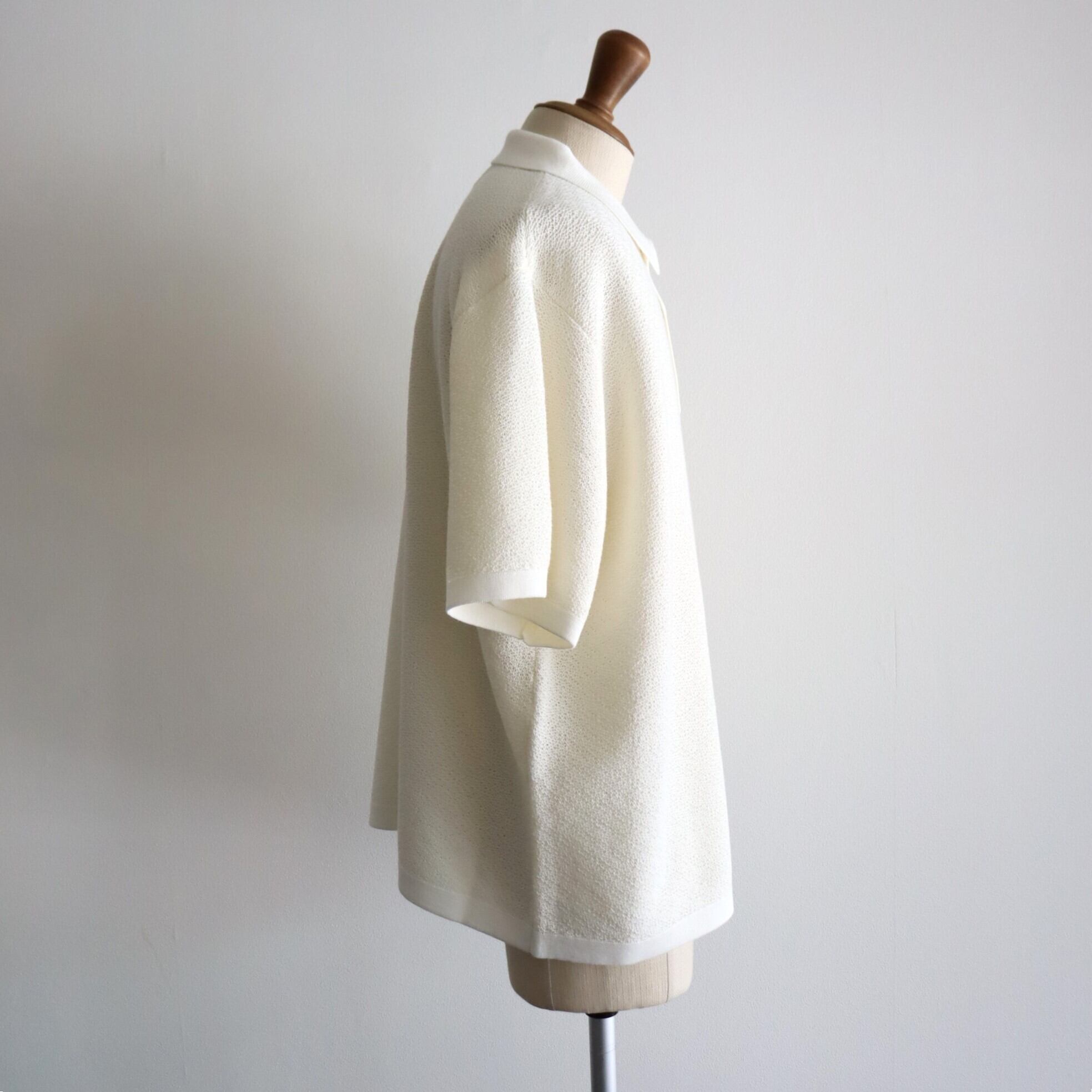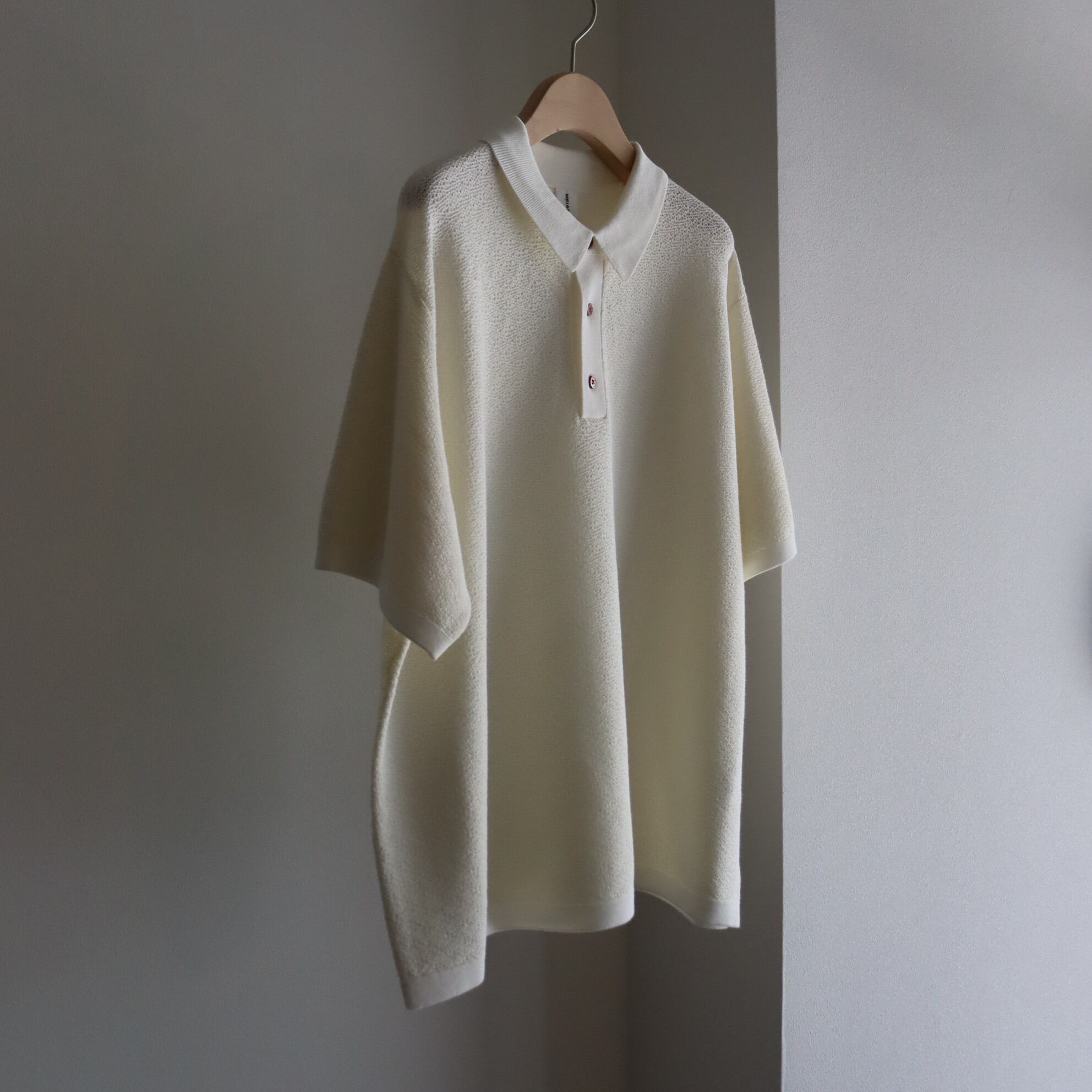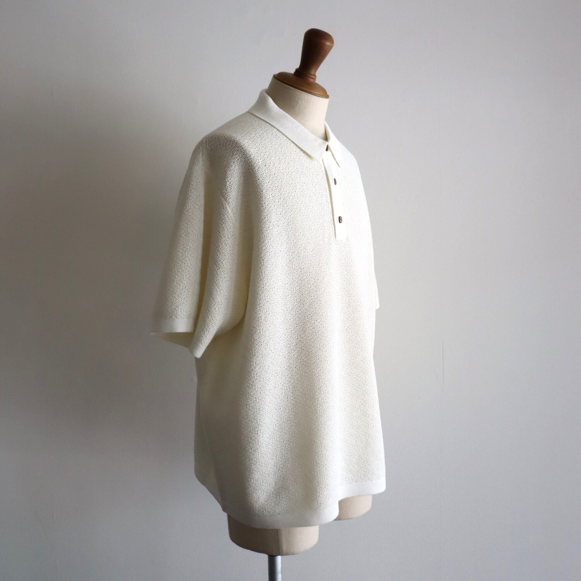 ギマ(擬麻)加工のコットン糸で凹凸のあるタック編みに編み立てることにより程よいハリ感と絶妙な透け感を作り、肌に貼りつかず、風を多く通す、清涼感のある着心地のニットポロ。