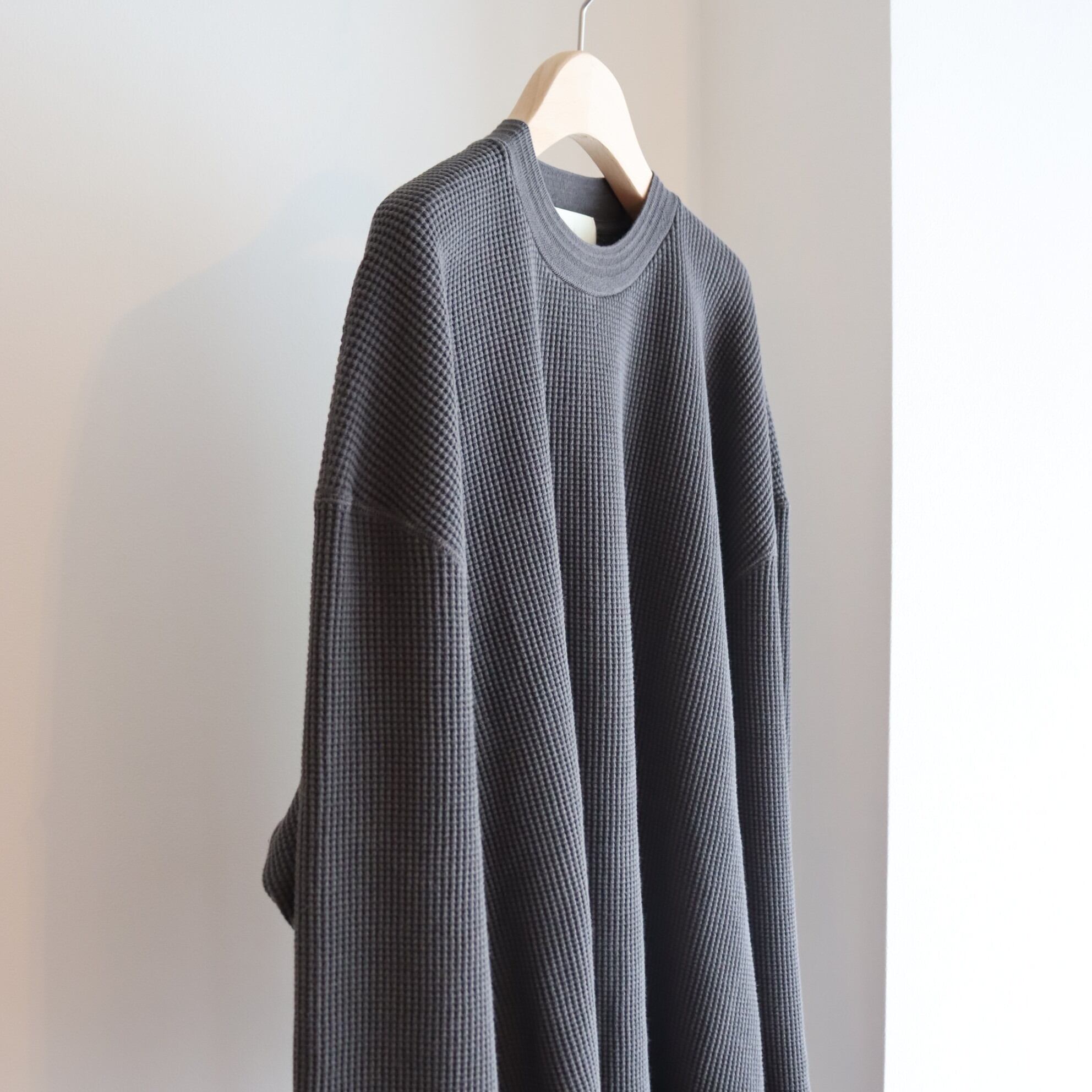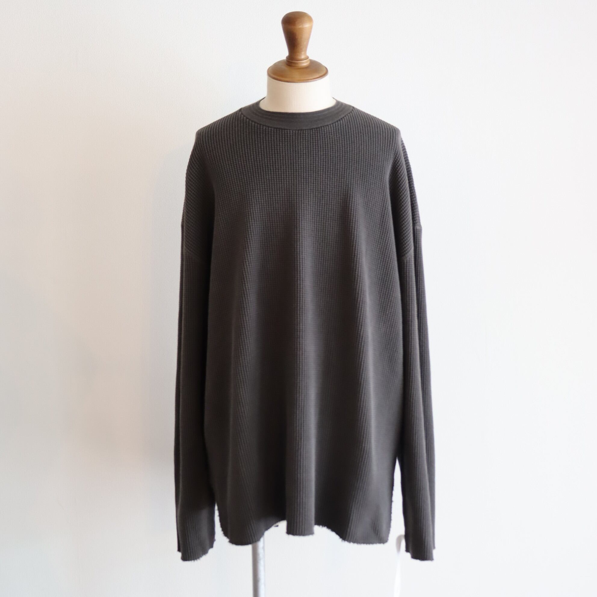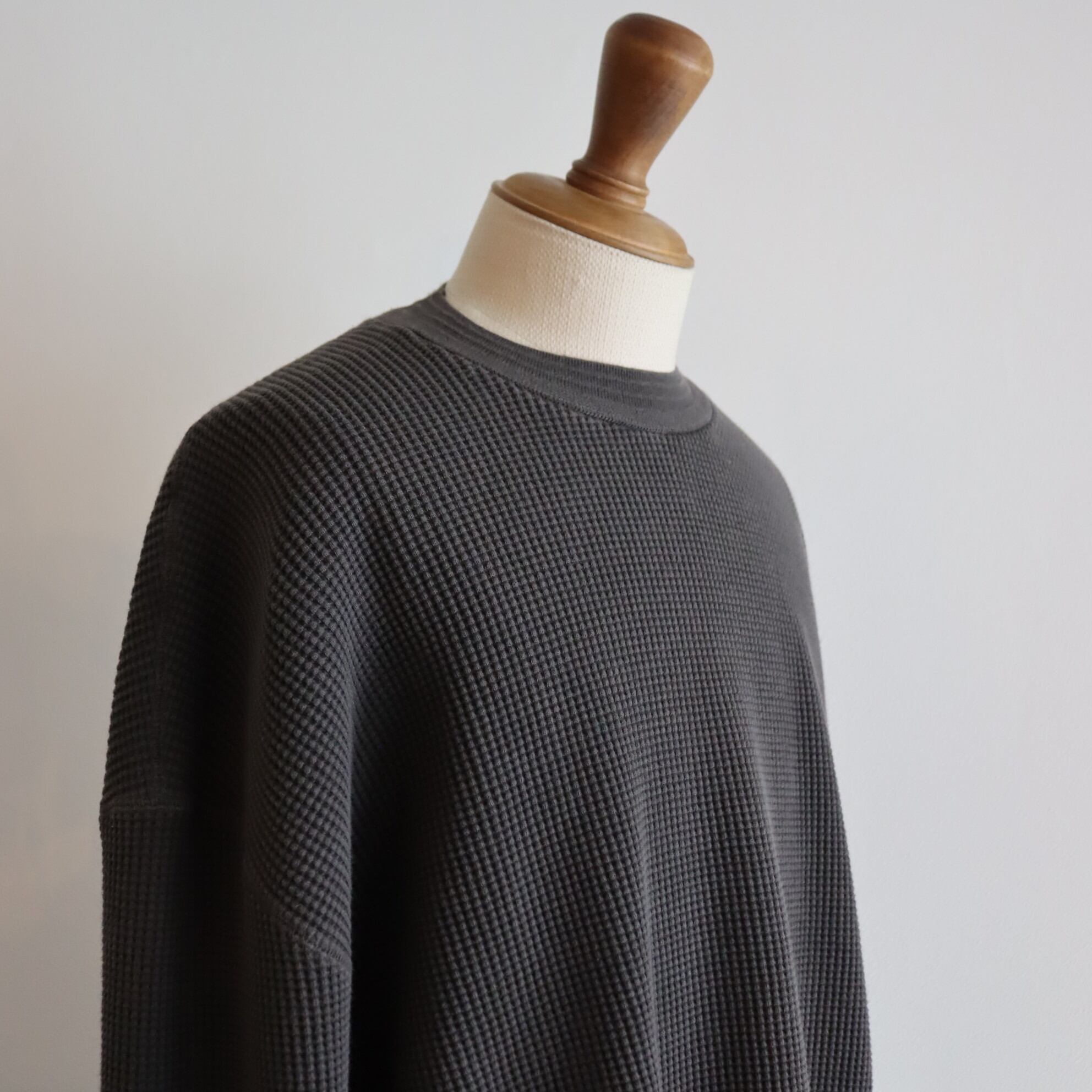 20番のコーマ⽷をローゲージの編み機で編み上げる事でワッフルの⽬を⼤きくしたビッグワッフル⽣地で作った WAFFLE LS TEE。