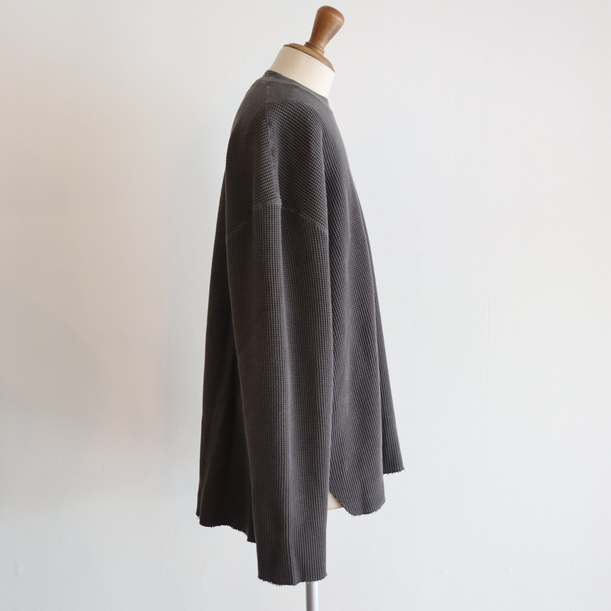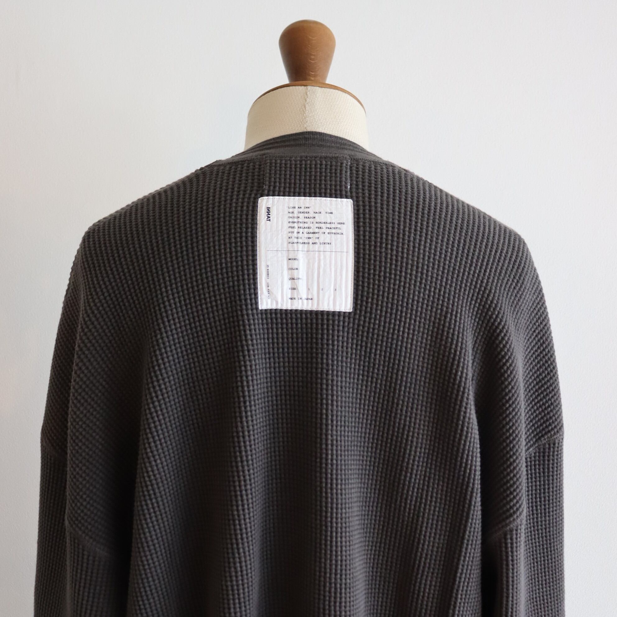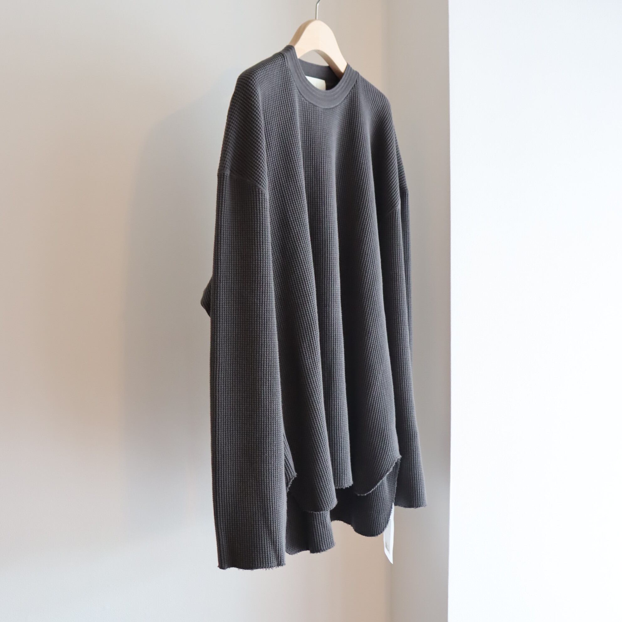 20番のコーマ⽷をローゲージの編み機で編み上げる事でワッフルの⽬を⼤きくしたビッグワッフル⽣地で作った WAFFLE LS TEE。