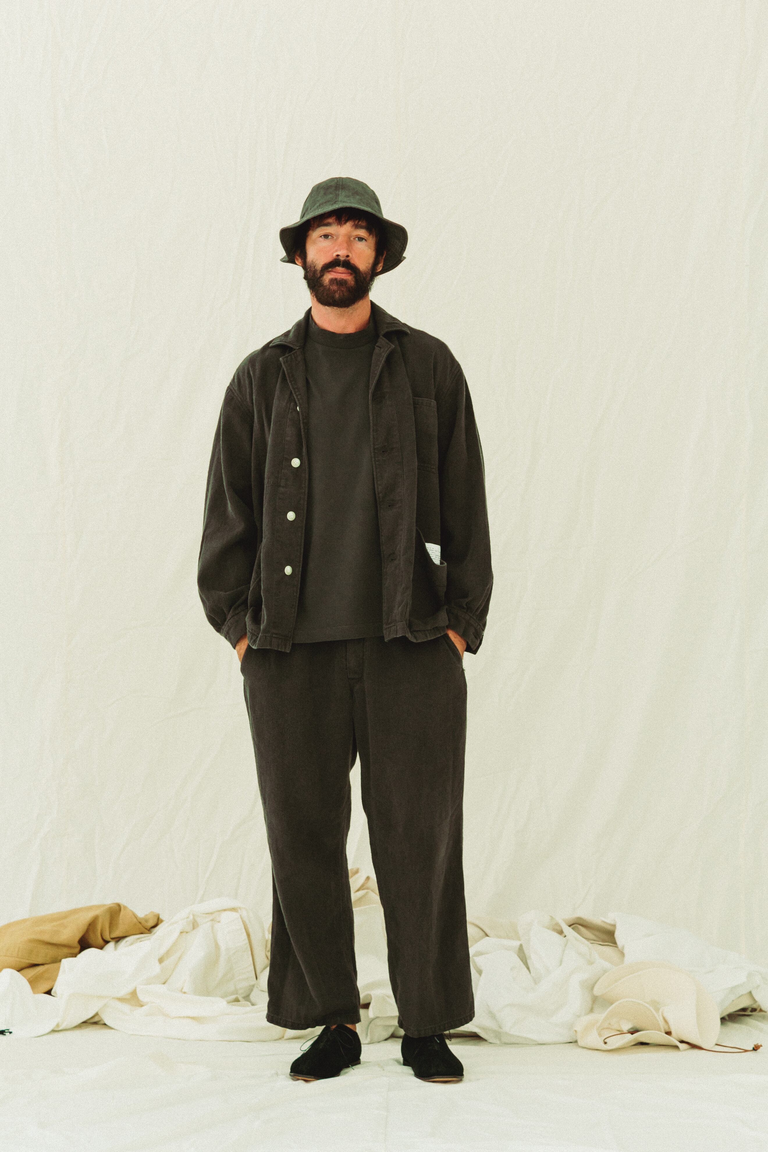 カットソー同様にVINTAGEのアンダーウエアなどで良く⾒られる畦編みのオリジナルで編み⽴てたリブを襟に採⽤しています。衿の少し太⽬の編⽴リブは後ろの肩線から⾸に沿って接ぎにする事により、⾸に吸い付くパターンにしています。袖、裾⼝は、カットオフにロック始し、裾は前後差をつけてラウンドカットしています。軽くてリラックス感ある仕様になっていす。ボタニカルのハイブリッドの後染加⼯を施しています。