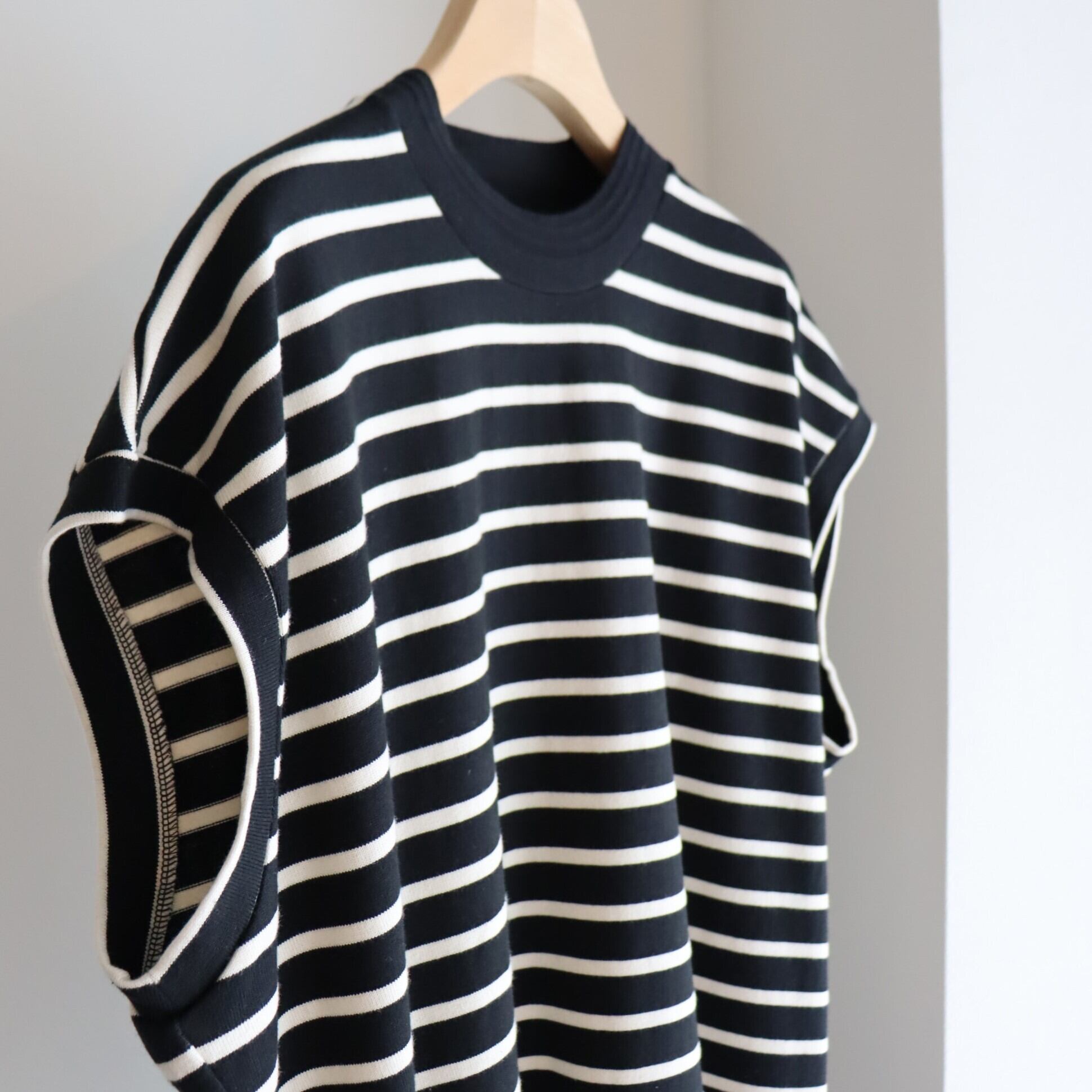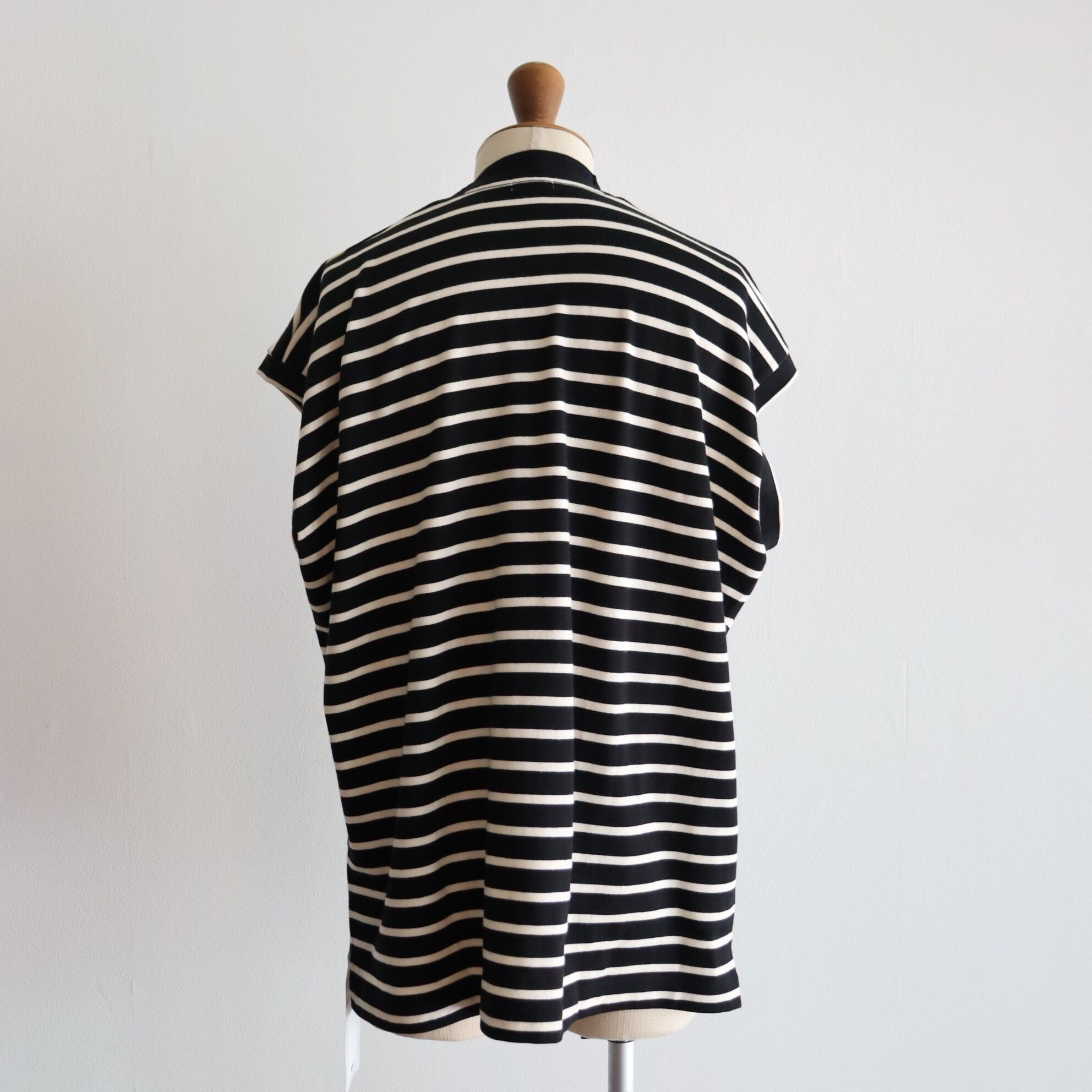 VINTAGEのアンダーウエアなどで良く⾒られる畦編みのオリジナル編⽴リブを襟に採⽤しています。衿の少し太⽬の編⽴リブは後ろの肩線から⾸に沿って接ぎにする事により、⾸に吸い付くパターンにしています。