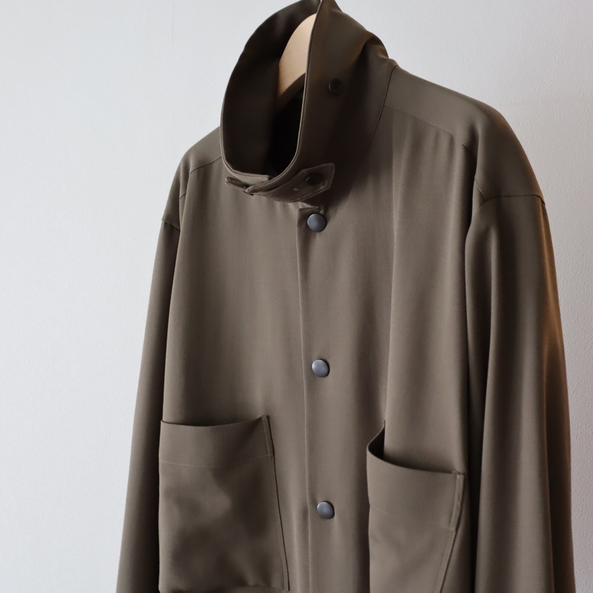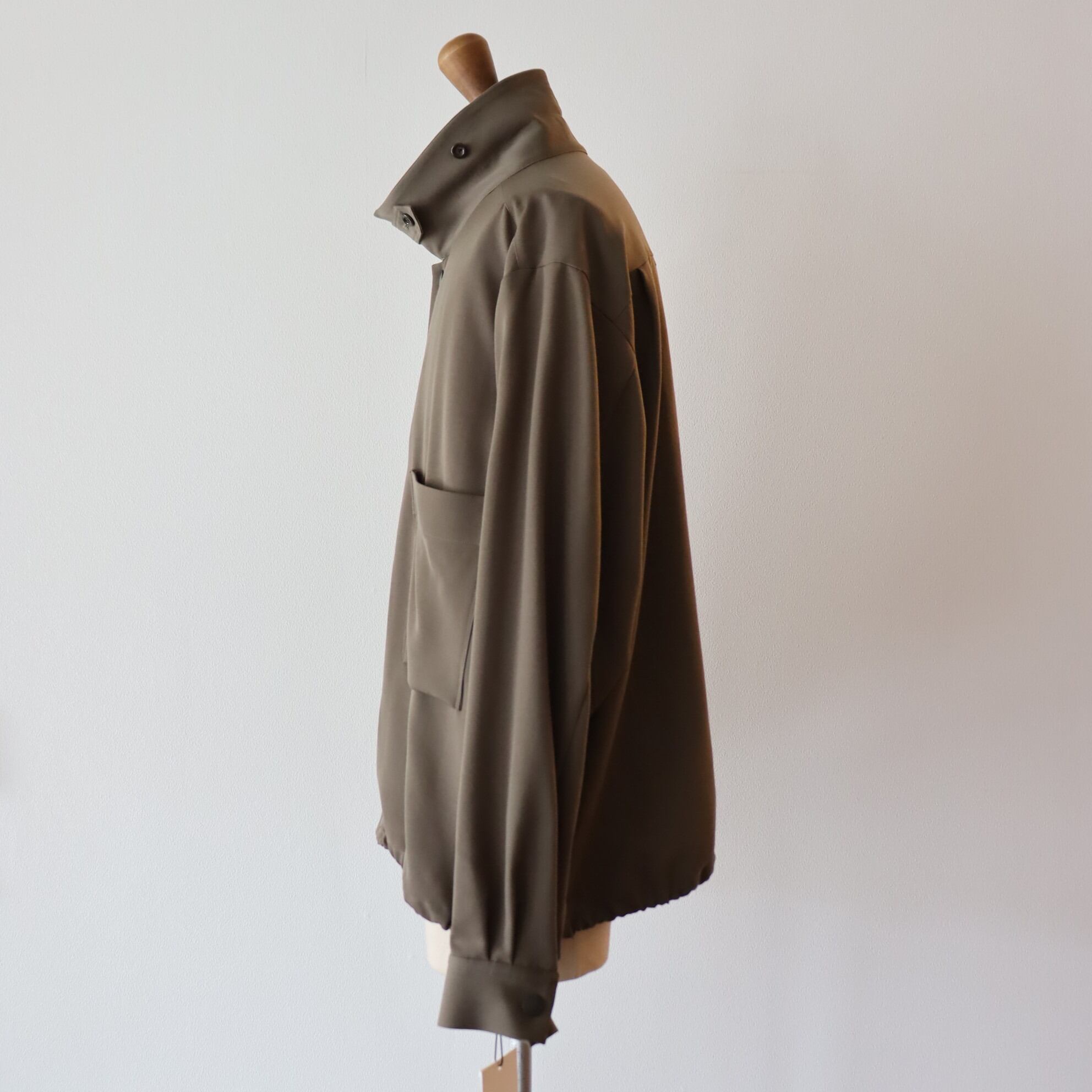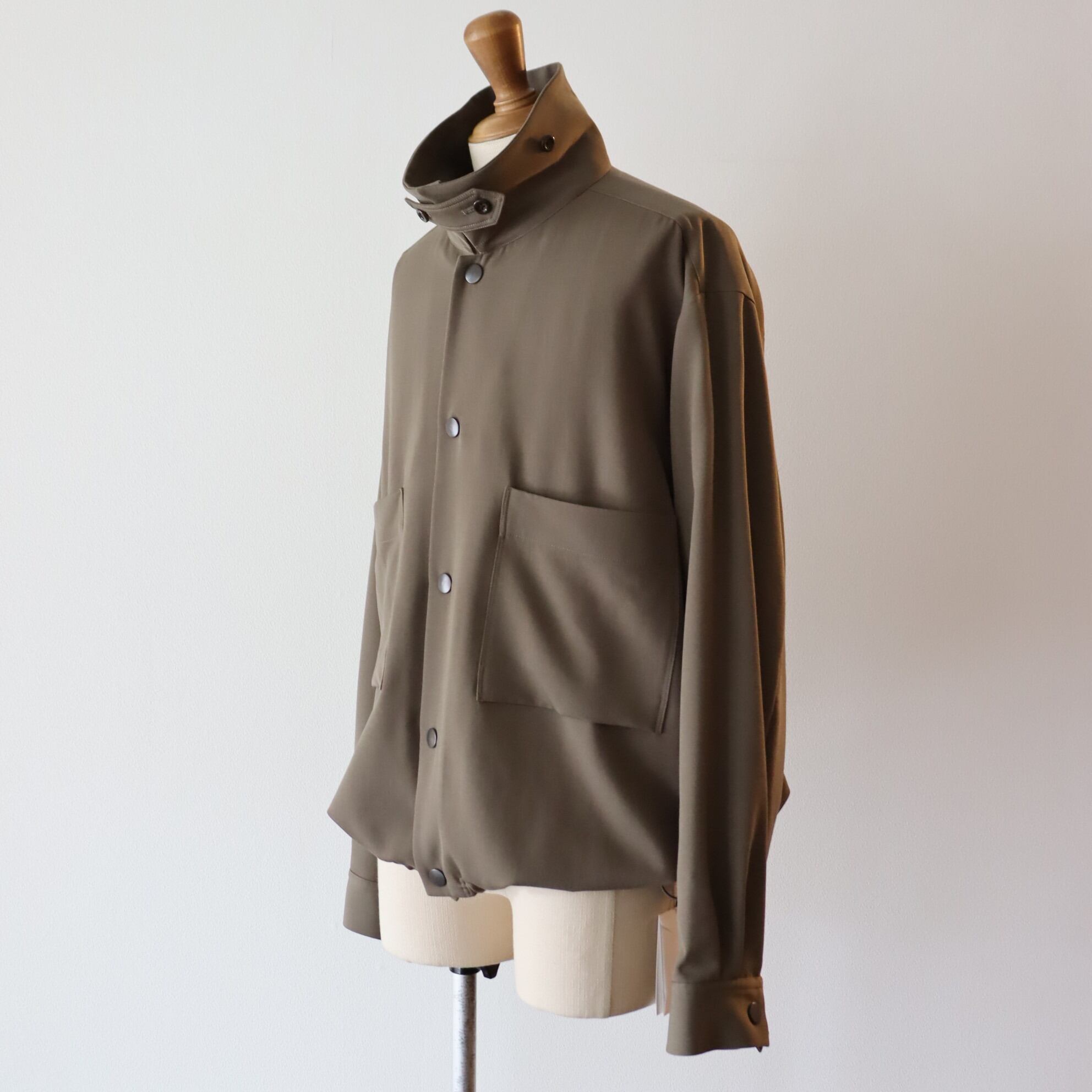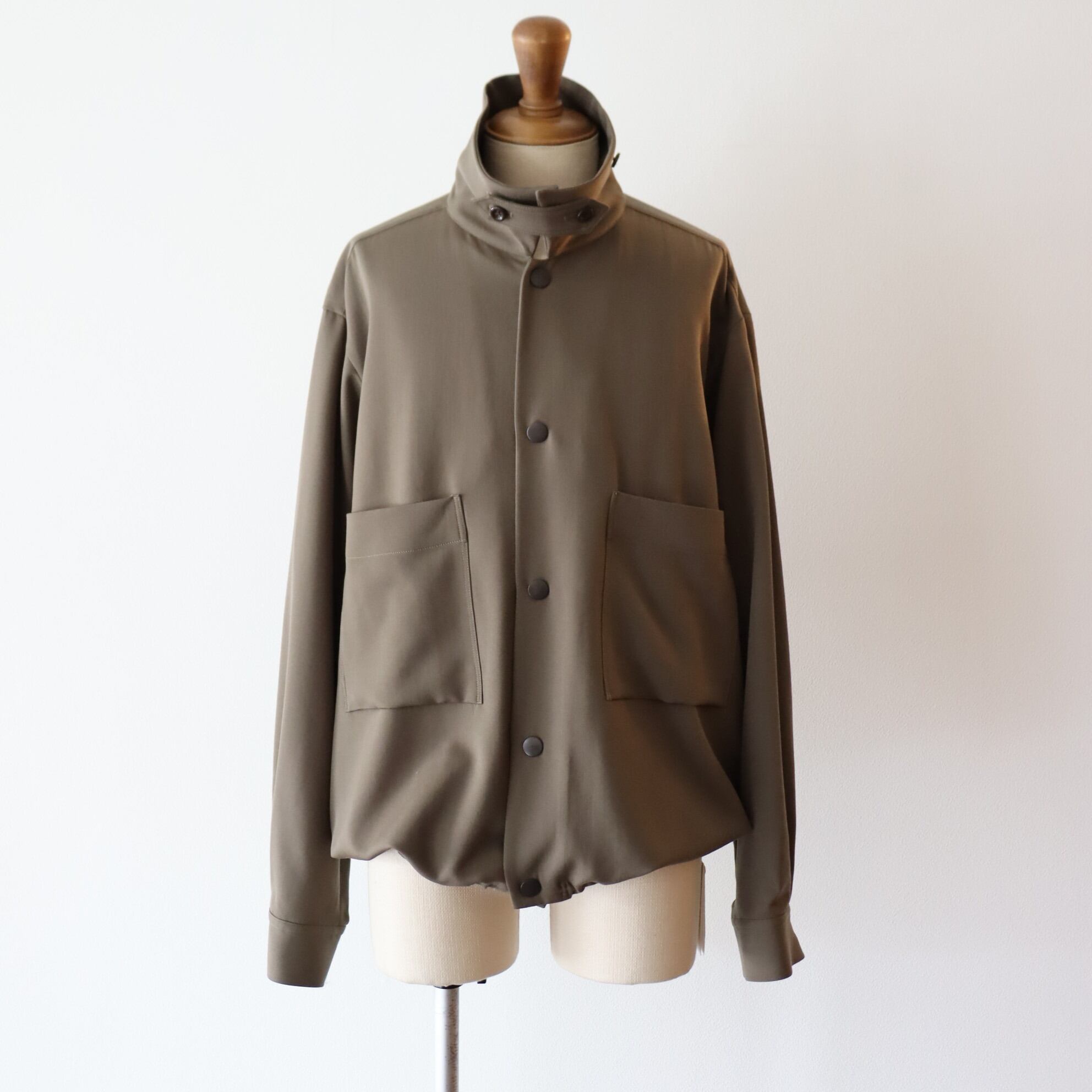ショート丈とルーズフィットなBOXシルエットが特徴のブルゾン型のシャツ。裾をコードで絞って、シルエットを変化させたスタイリングが可能です。ドット釦を配置しミニマルな印象に仕立てています。衿裏にタブをデザインし、衿を立てたスタイリングも可能です。