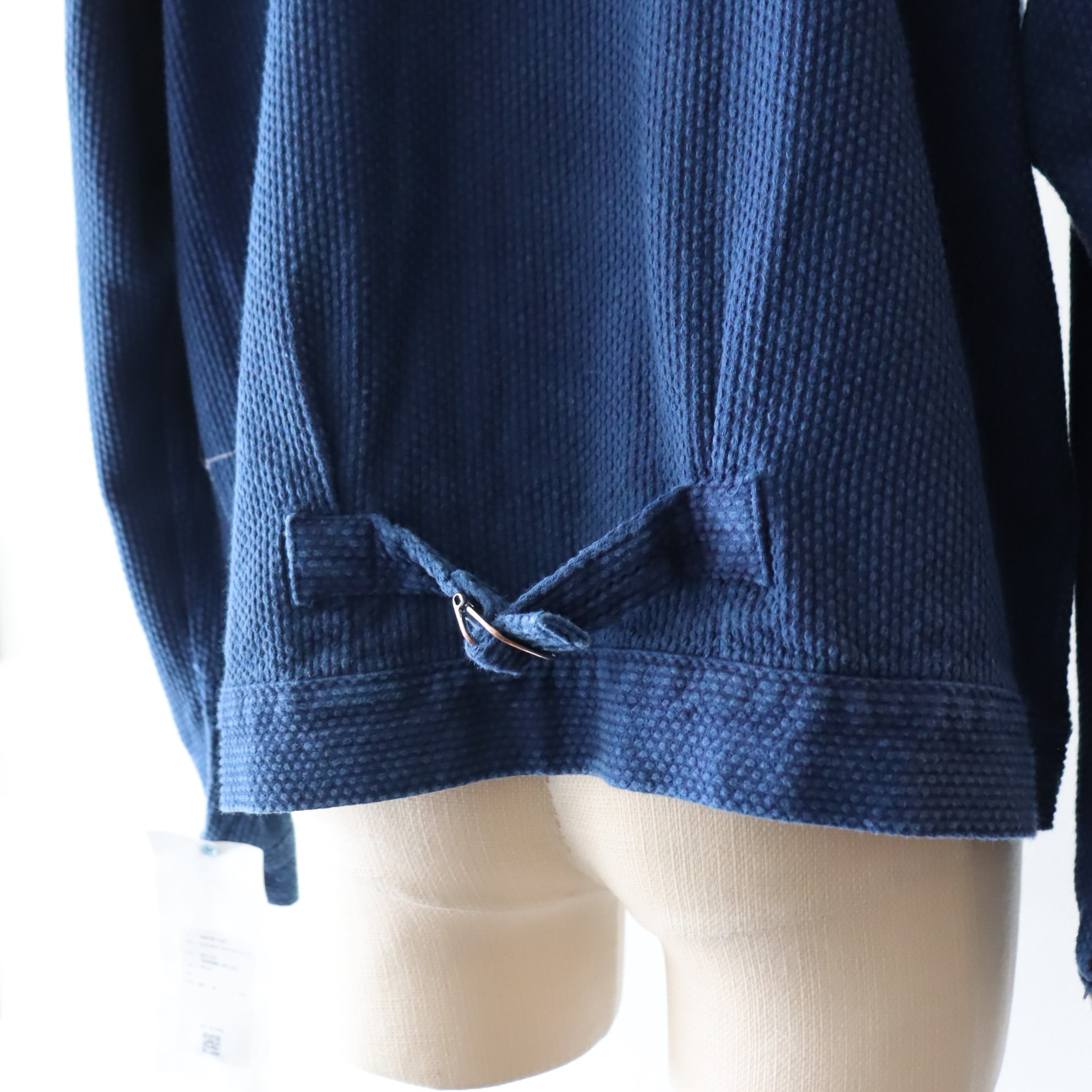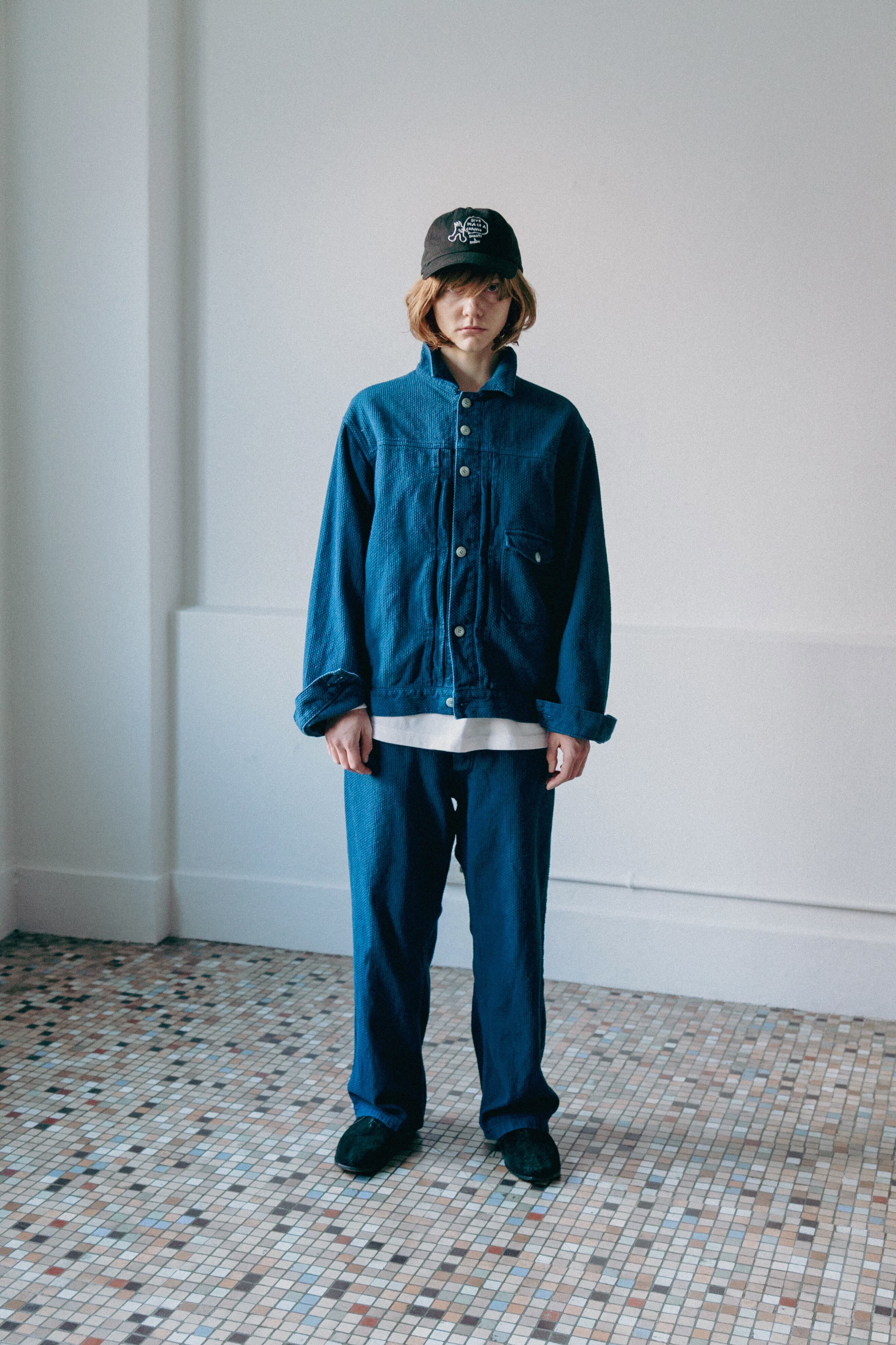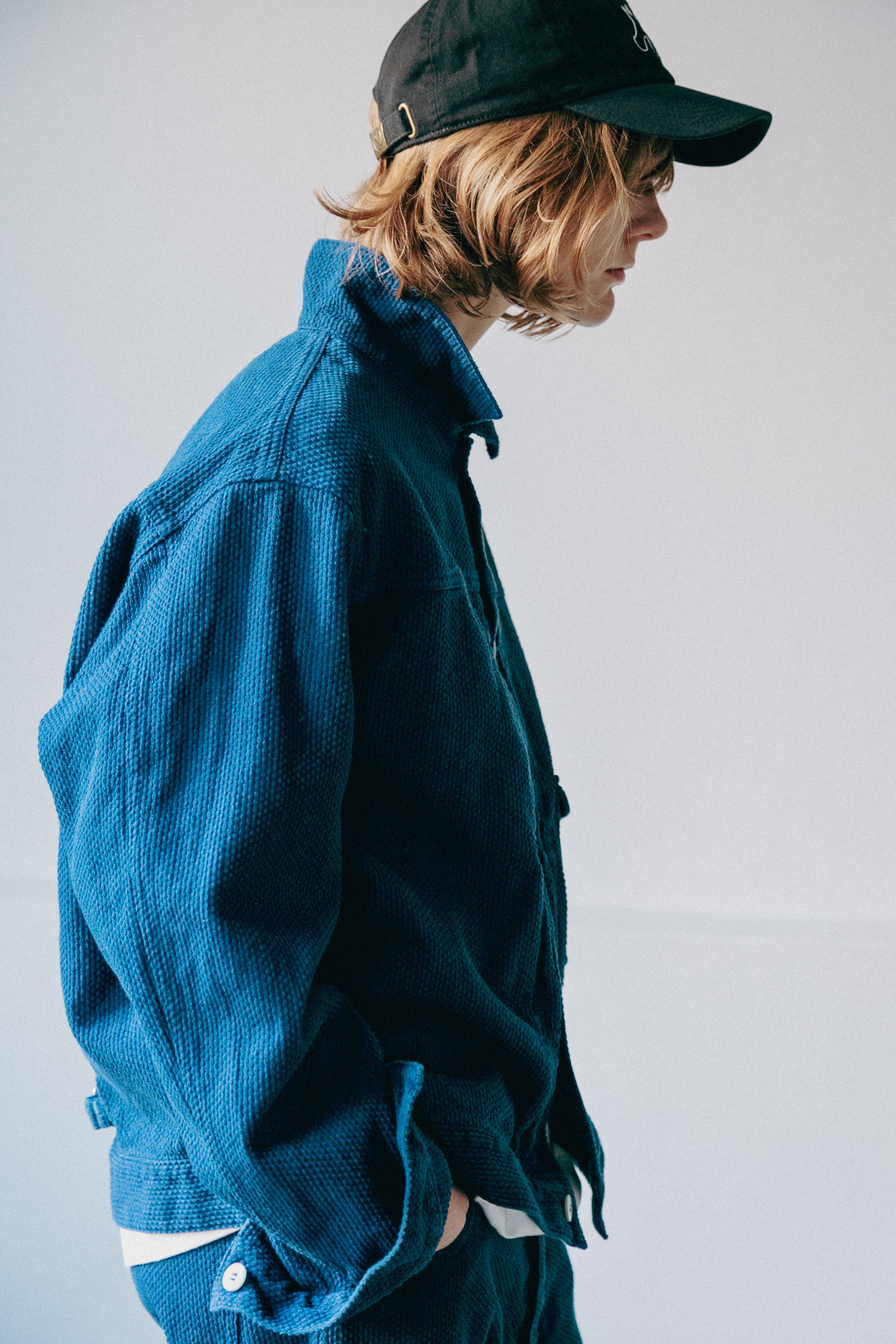 加⼯はインディゴの⼿染を採⽤。刺し⼦織は凹凸のある素材の為、染まり具合に抑揚が出て、奥⾏きのある佇まいに仕上がる事をターゲットとしました。柔道着や剣道着、⾜袋などにも使⽤される素材でもあり、耐久性、保温性や吸湿性にも優れている⽇本独⾃の素材です。古くから伝わる⽇本の技術表現した⽣地と⻄洋のワークウエアの型をボタニカルダイ加⼯を施すことにより調和させ、経年変化したような雰囲気と、こなれ感ある表情を表現しています。
