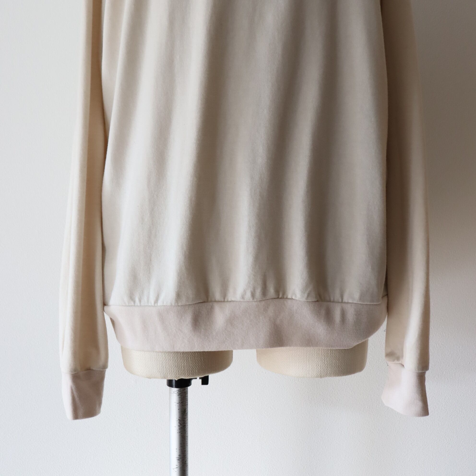 表にウォッシャブルウール、裏がコットンのプレーティングに編み立てたオリジナル生地を使用。スウェット未満カットソー以上の着用感を目指したシーズン通して便利なアイテム。肉感はさほどないですが、ウールを使用していることもあり、暖かさもあります。スウェットのようにガシガシ着ていくとさらに風合いが良くなっていきます。マシンウォッシャブルも可能となっております。