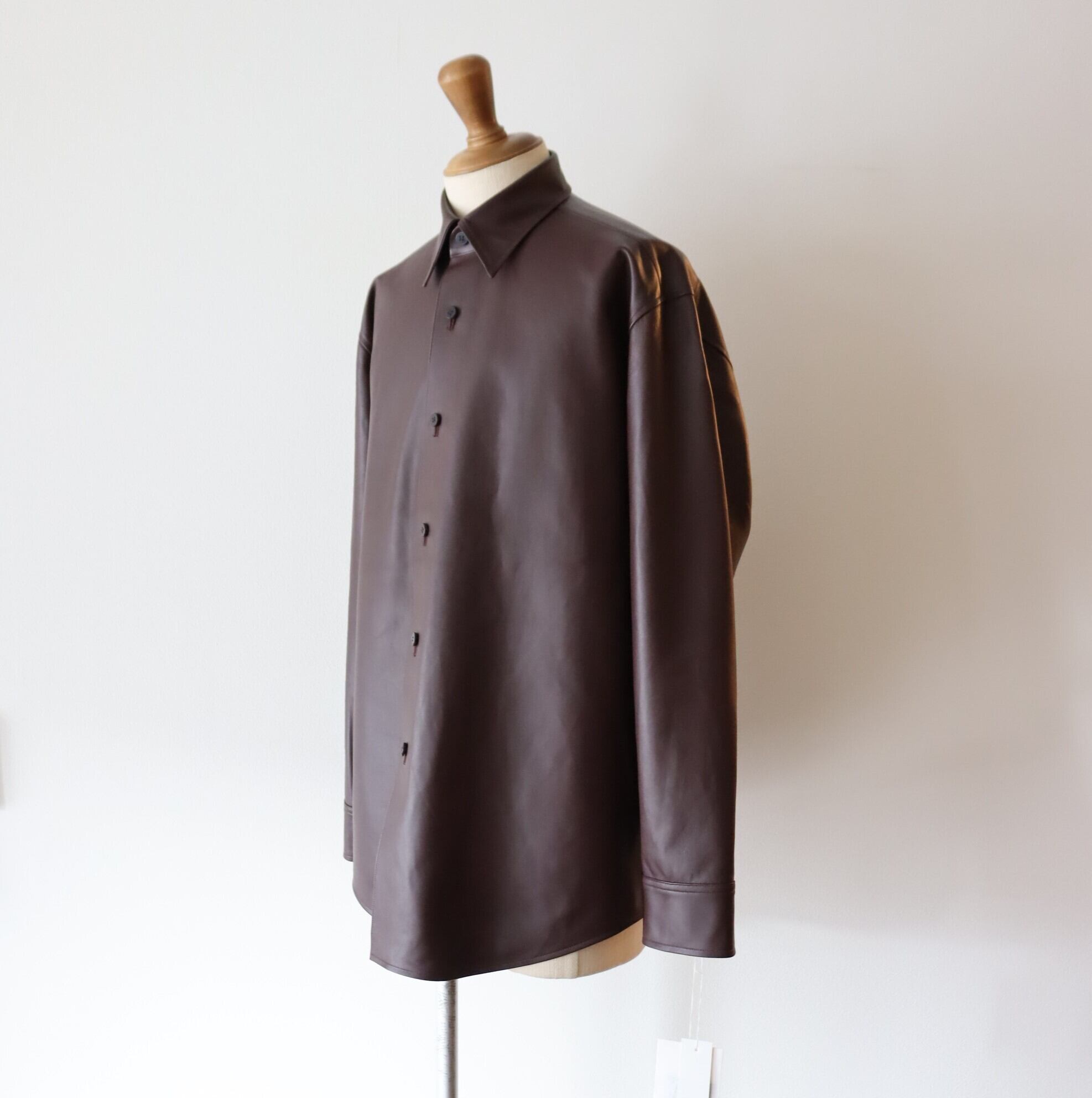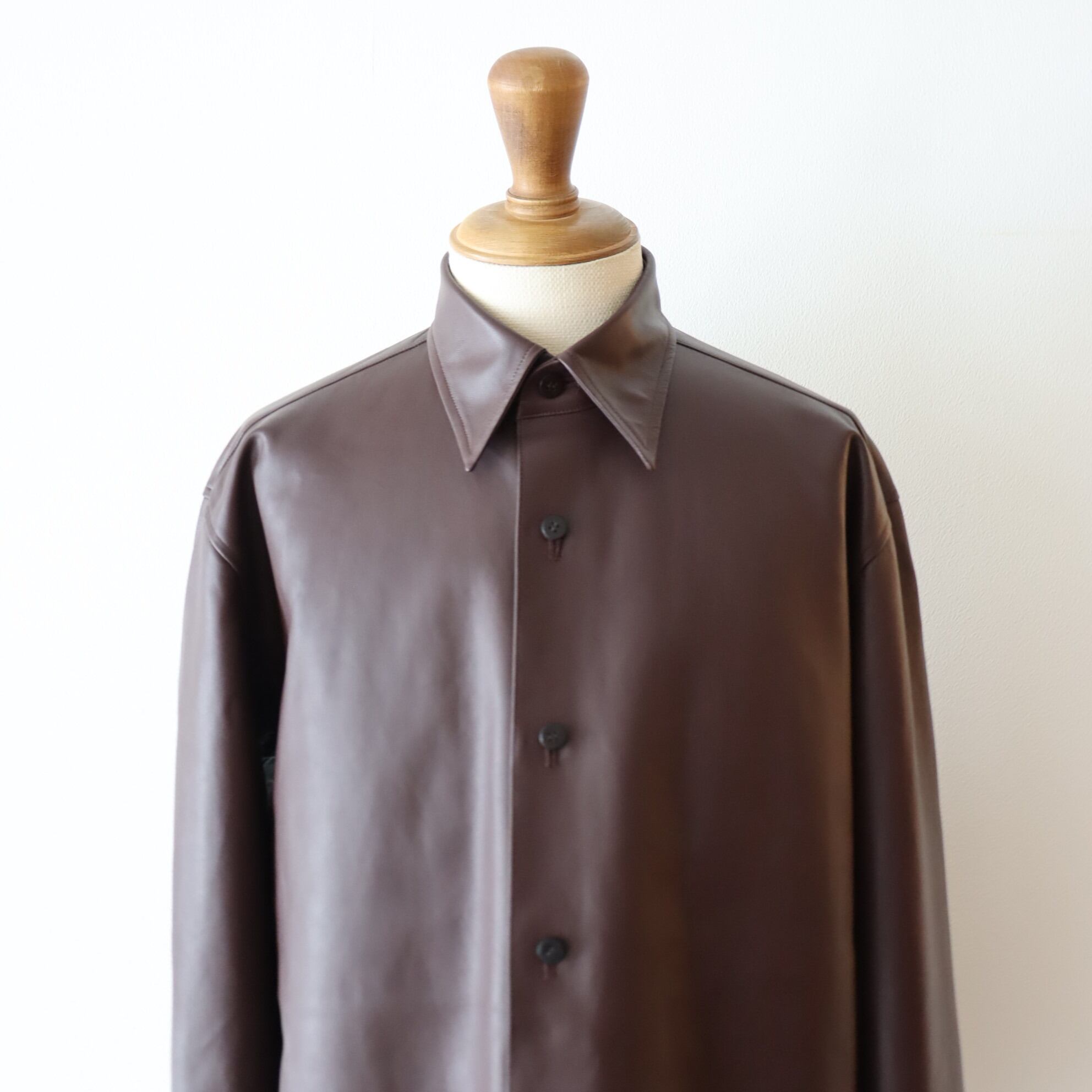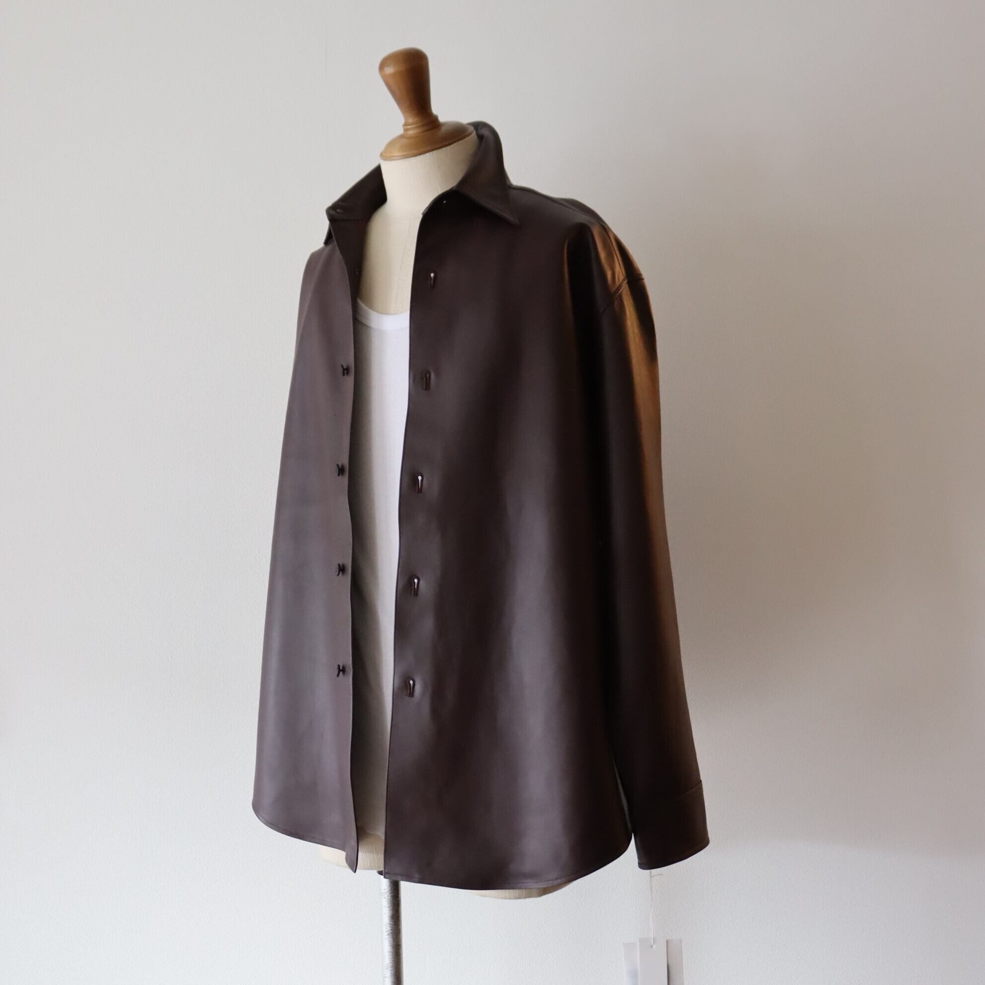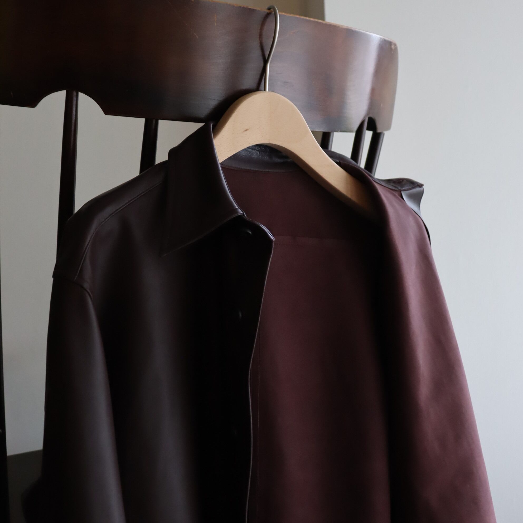 今回は、以前展開していたものよりさらに薄くする事でCaleが得意とするシャツにより近づけるよう改良されパワーアップした、デザイナー自身が理想とするレザーシャツの最終形態となりました。 裏地は付けずにナッパラン加工を施し裏銀面にする事で、よりその薄さを体現して頂けるものとなっております。一枚での着用の存在感はもちろんの事、その薄さから、インナー使いとしても大活躍してくれ、夏以外の3シーズンにて活躍してくれるアイテムとなっております。