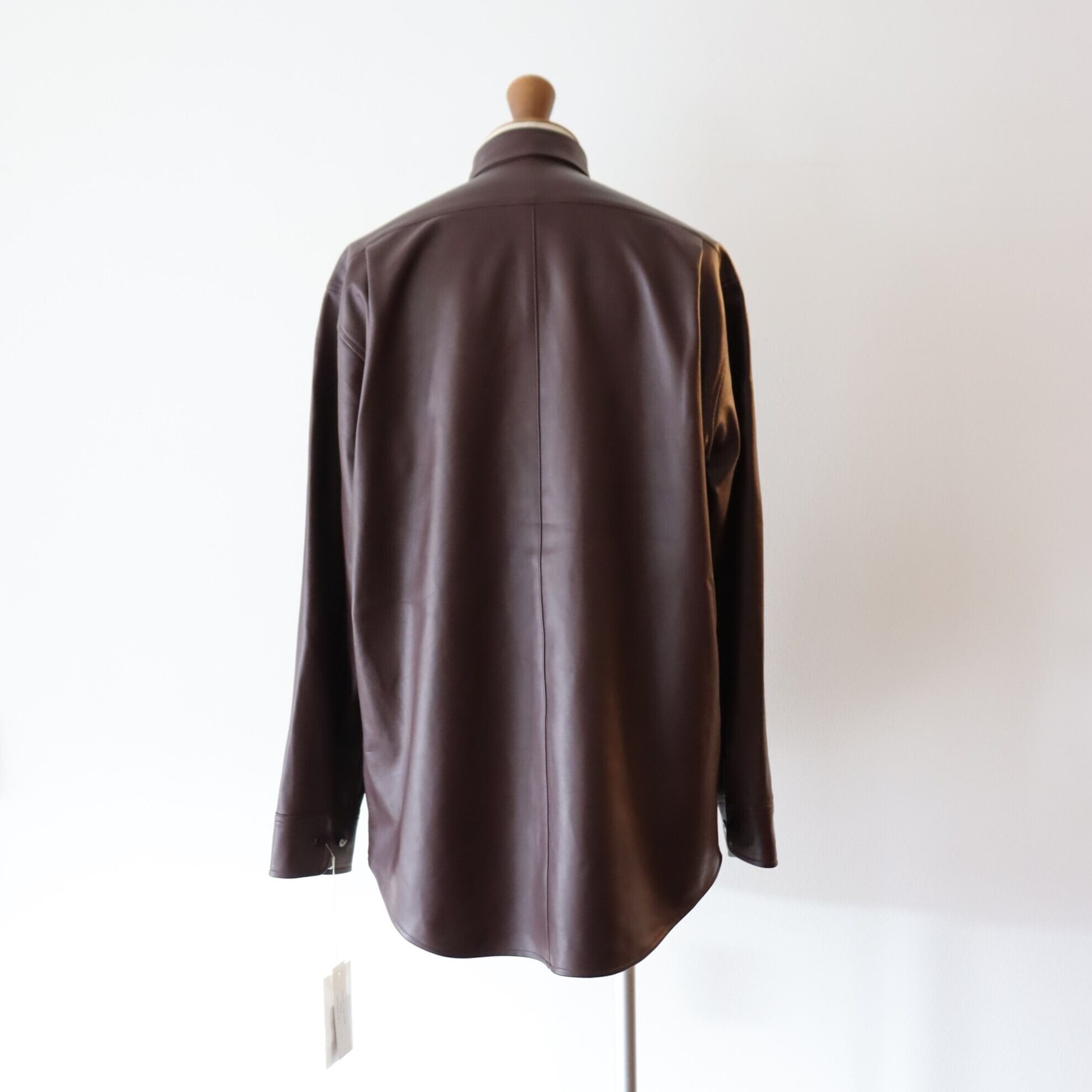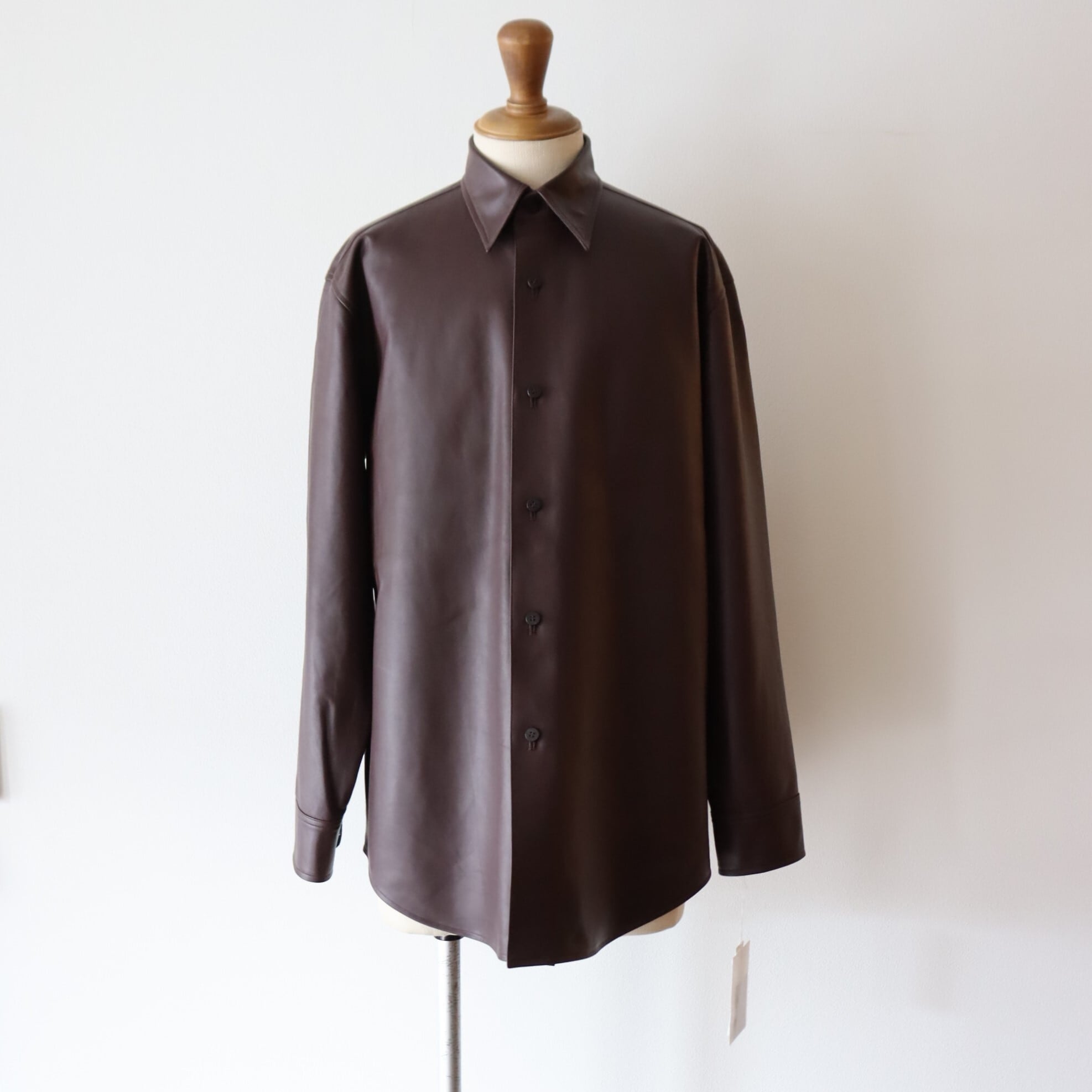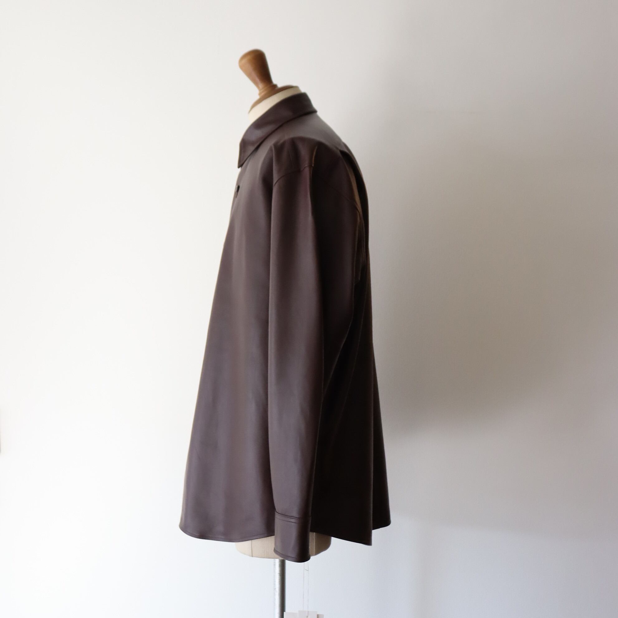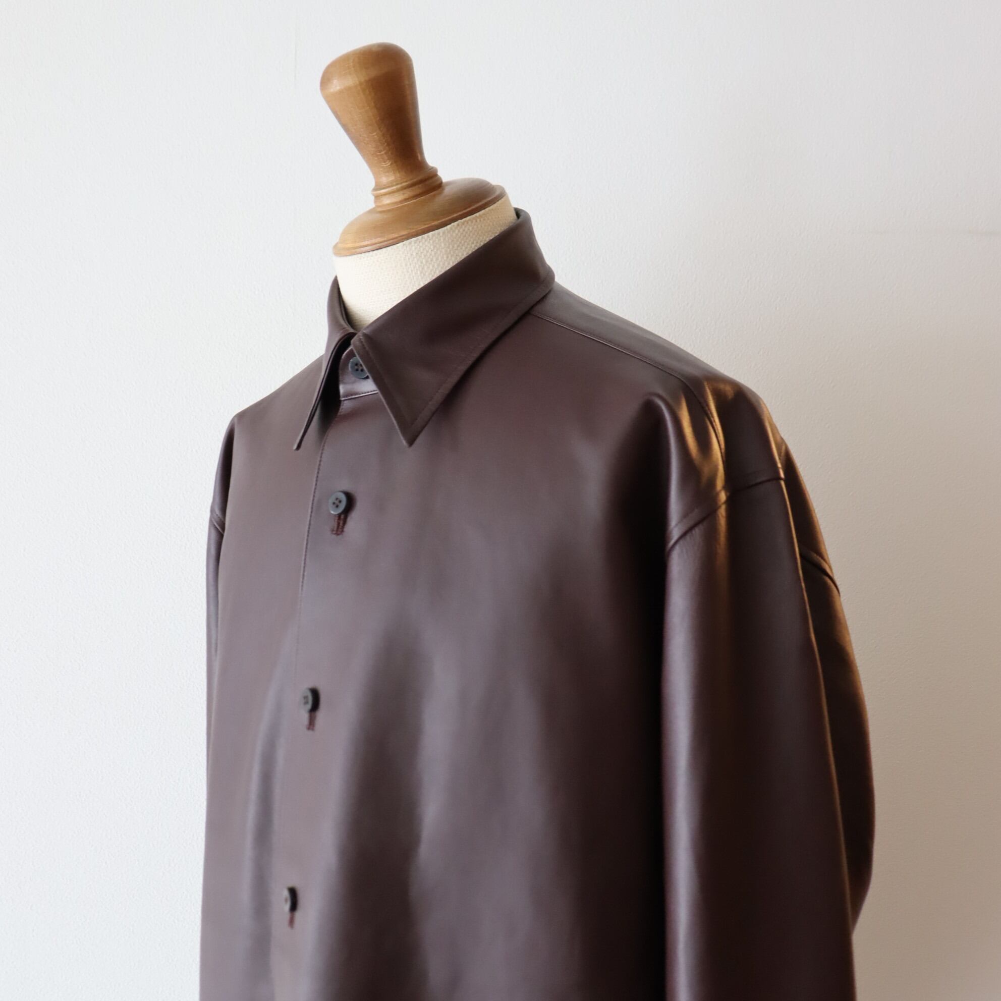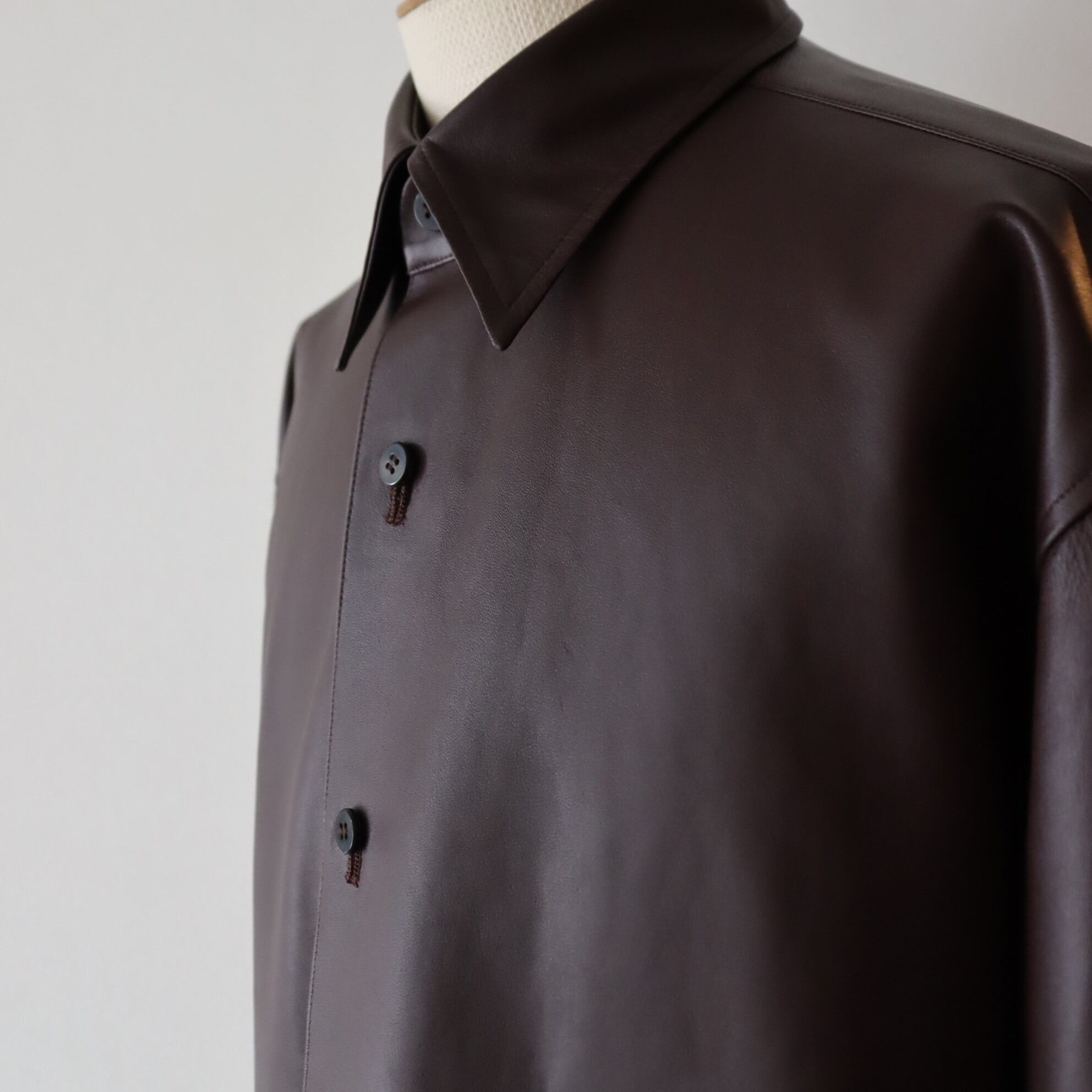 今回は、以前展開していたものよりさらに薄くする事でCaleが得意とするシャツにより近づけるよう改良されパワーアップした、デザイナー自身が理想とするレザーシャツの最終形態となりました。 裏地は付けずにナッパラン加工を施し裏銀面にする事で、よりその薄さを体現して頂けるものとなっております。一枚での着用の存在感はもちろんの事、その薄さから、インナー使いとしても大活躍してくれ、夏以外の3シーズンにて活躍してくれるアイテムとなっております。