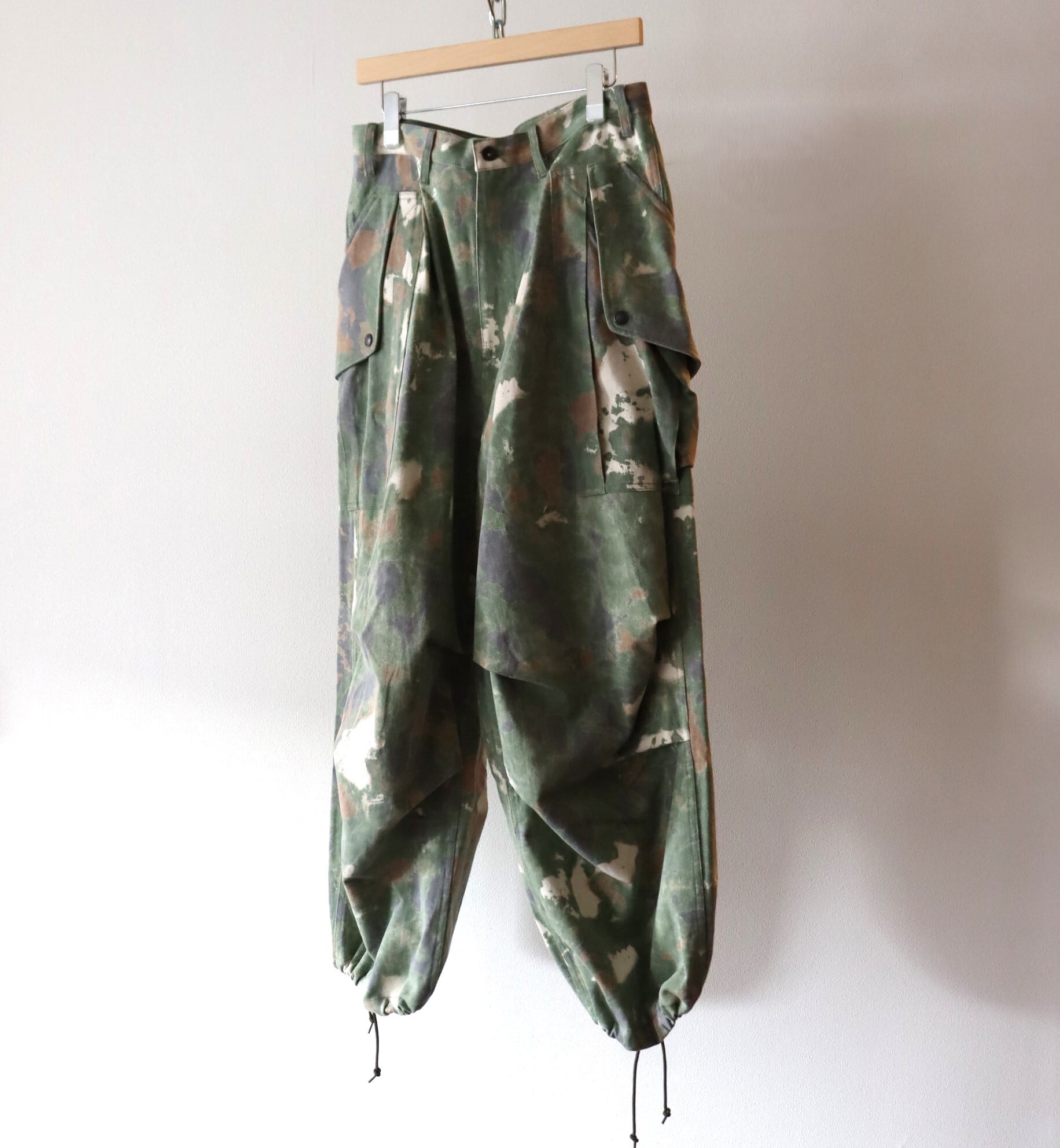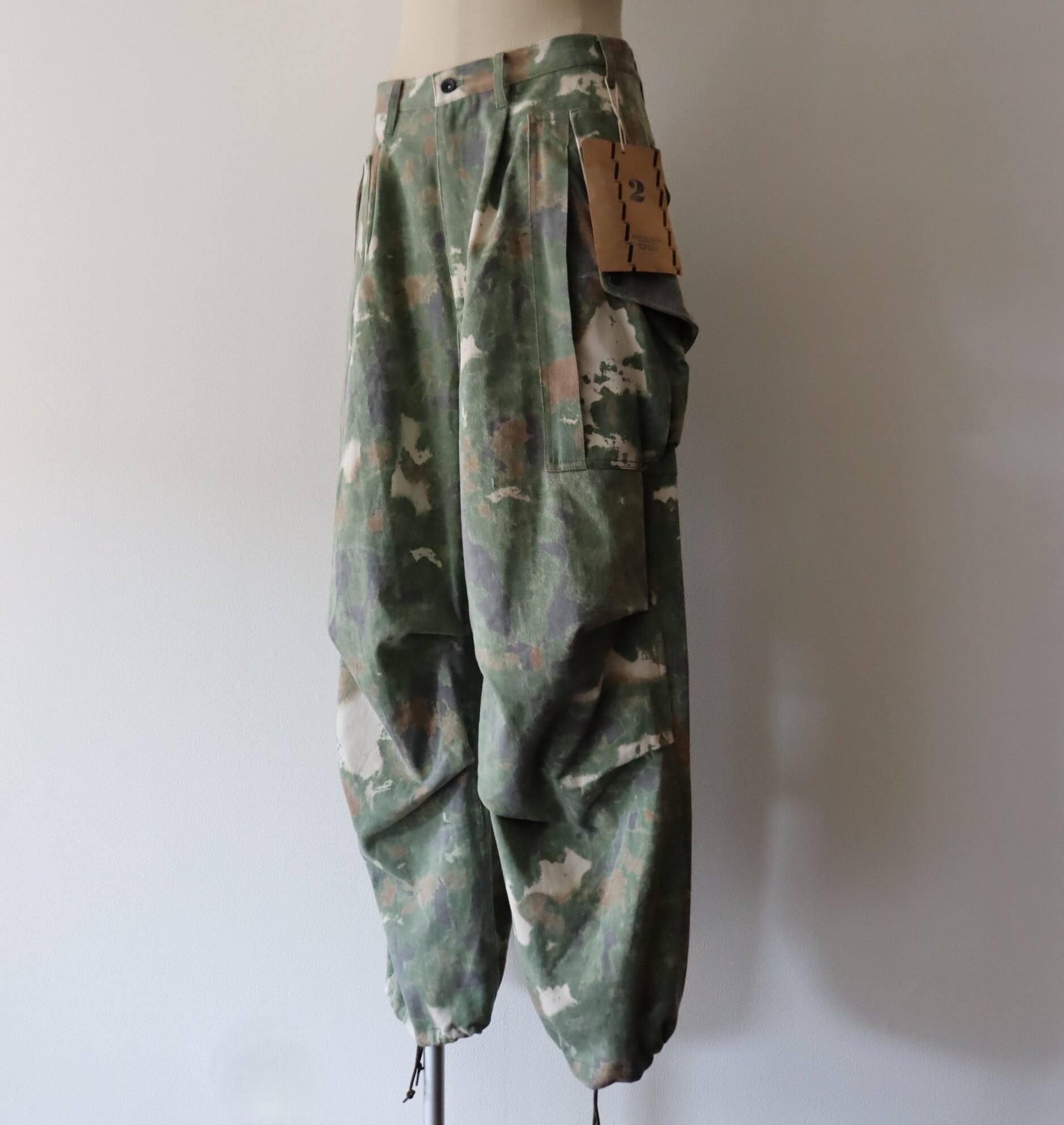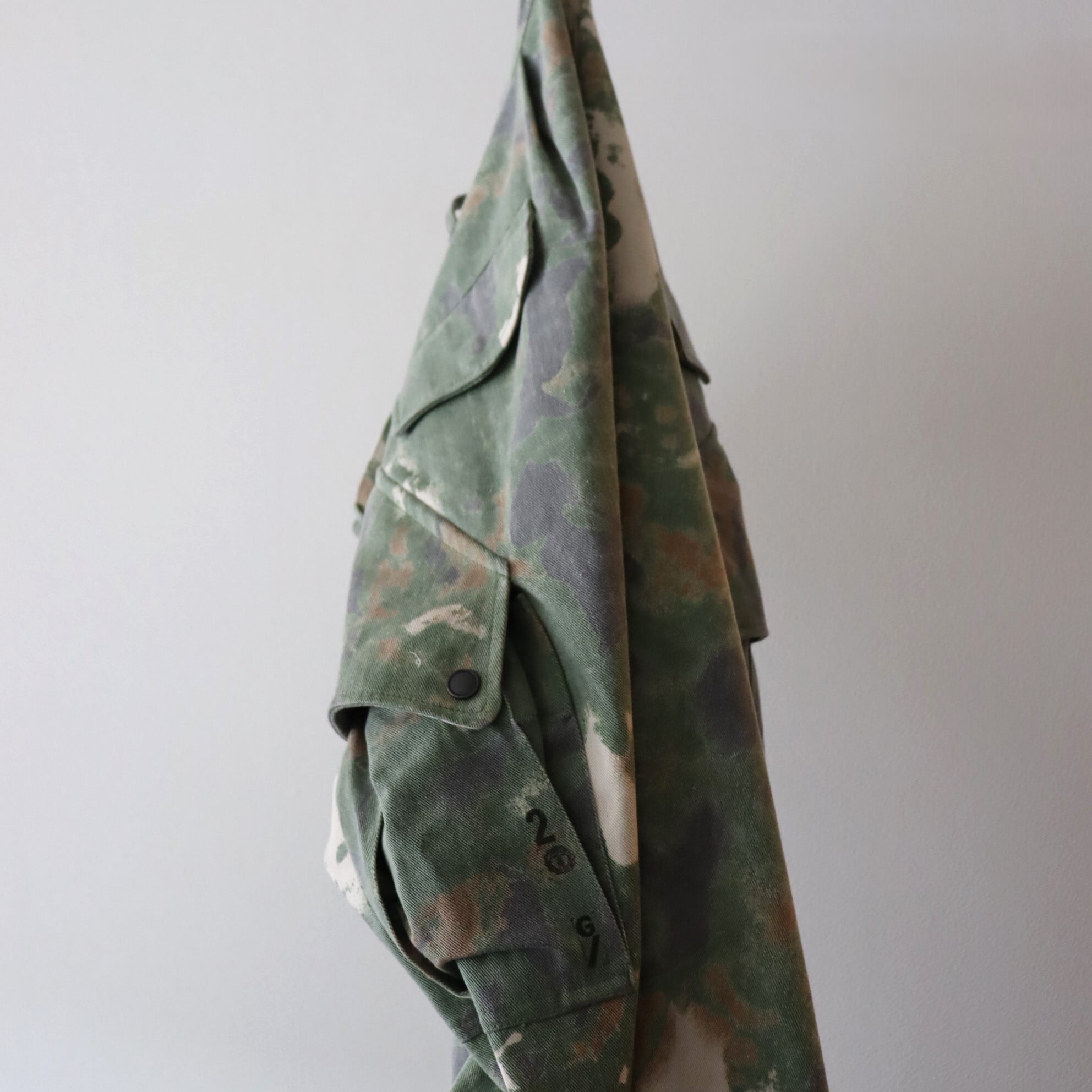 偶然から生まれた独特な配色のオリジナルカモフラージュ。独特な発色になるように拘ったプリントを施し、その後加工を加えた出来上がった、他には無い独特なカモフラとなっております。