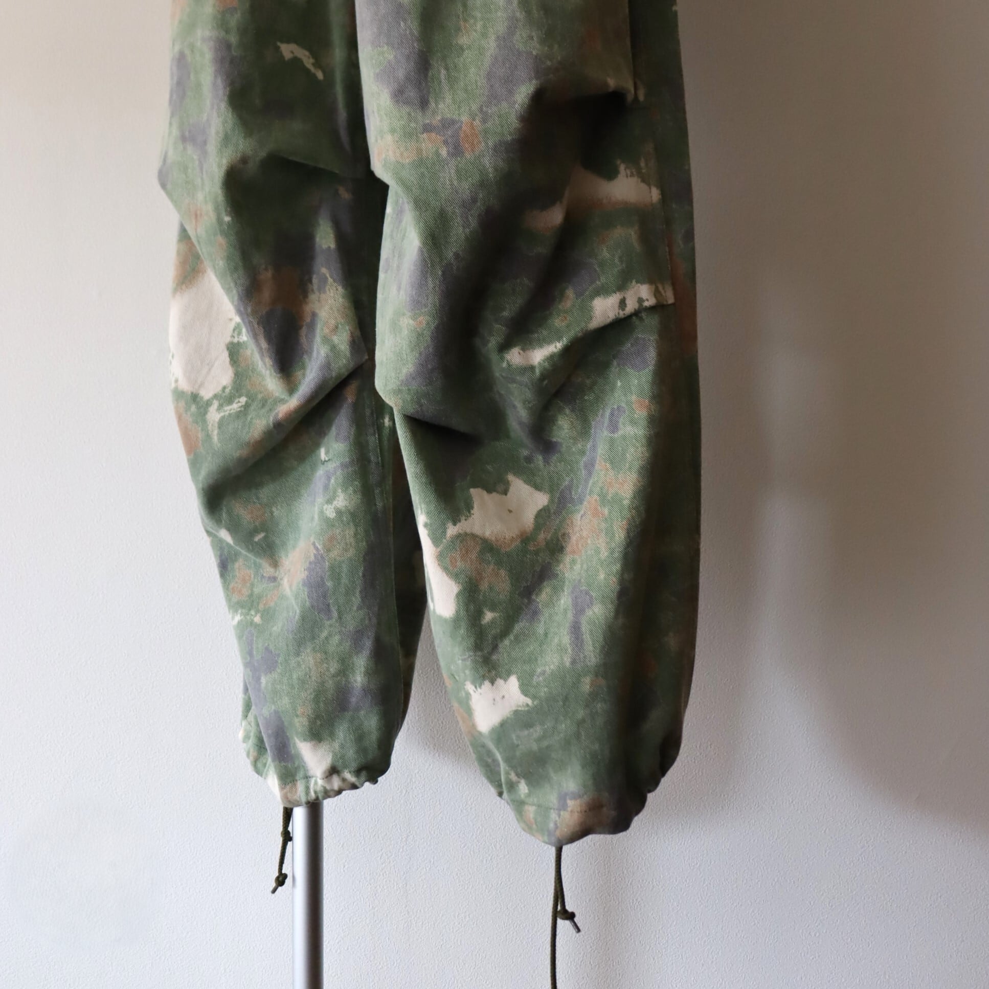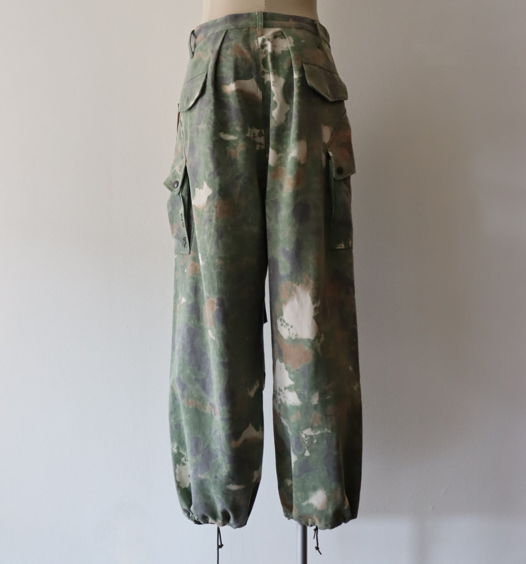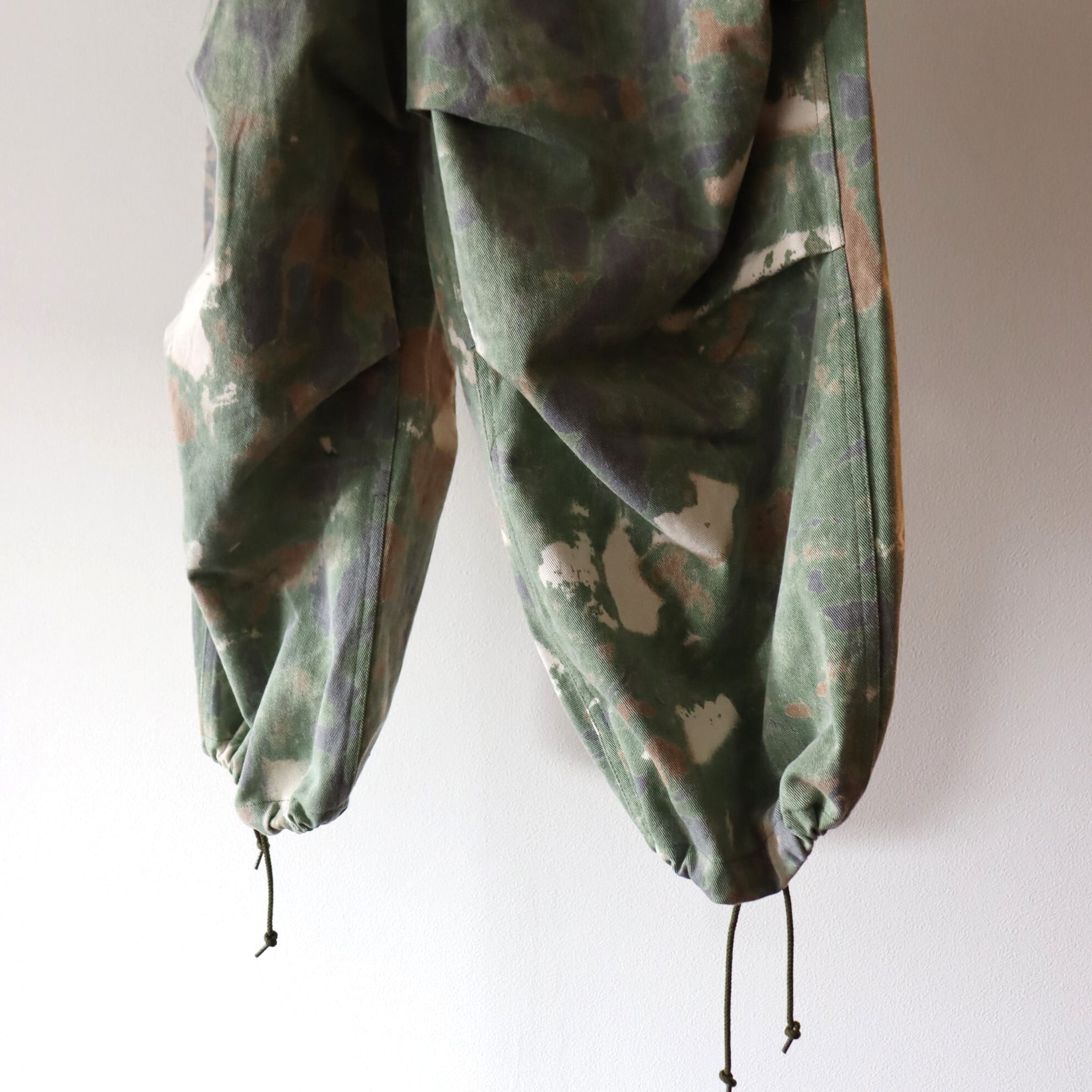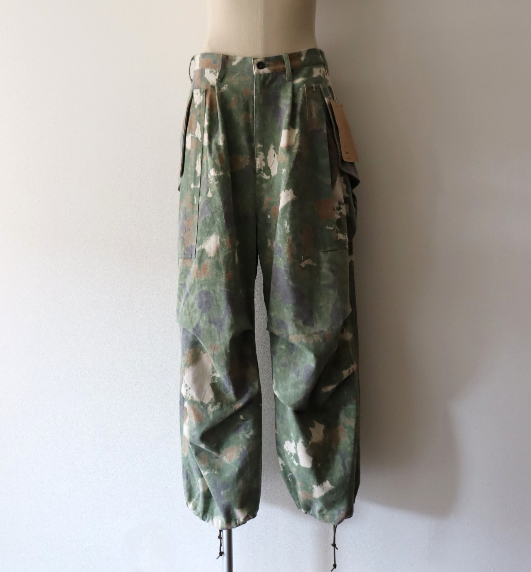 偶然から生まれた独特な配色のオリジナルカモフラージュ。独特な発色になるように拘ったプリントを施し、その後加工を加えた出来上がった、他には無い独特なカモフラとなっております。