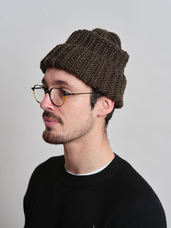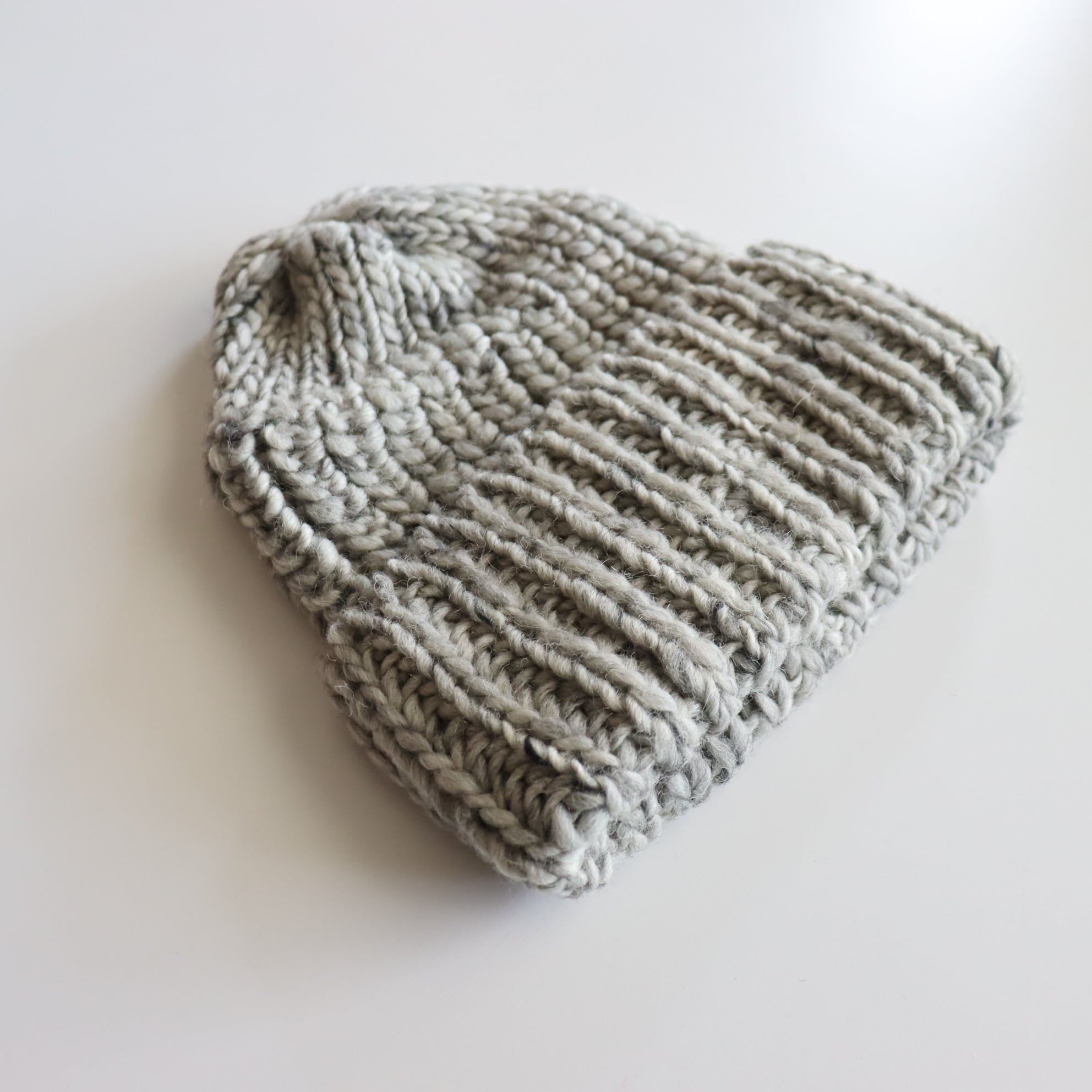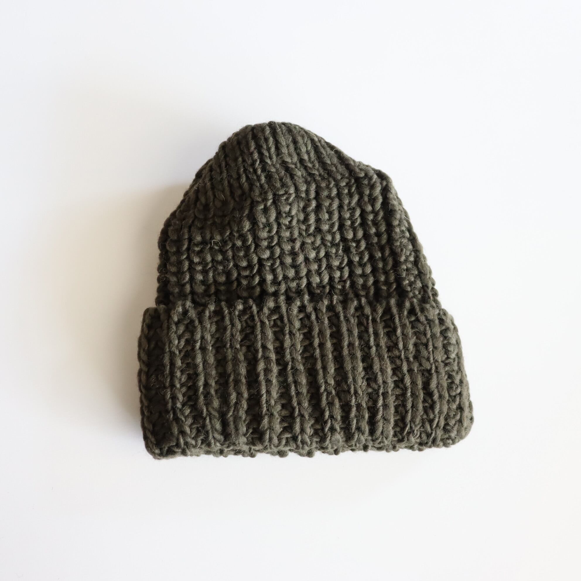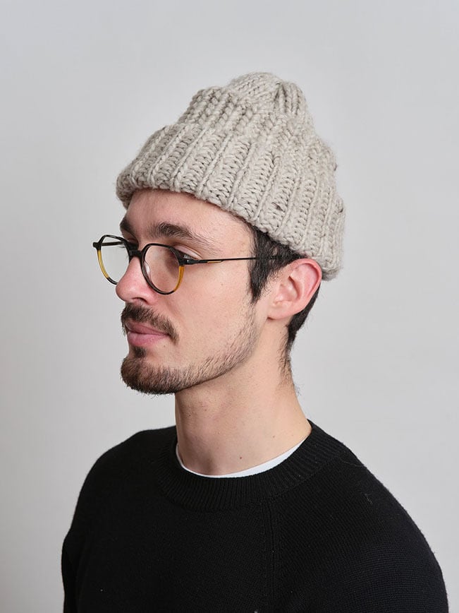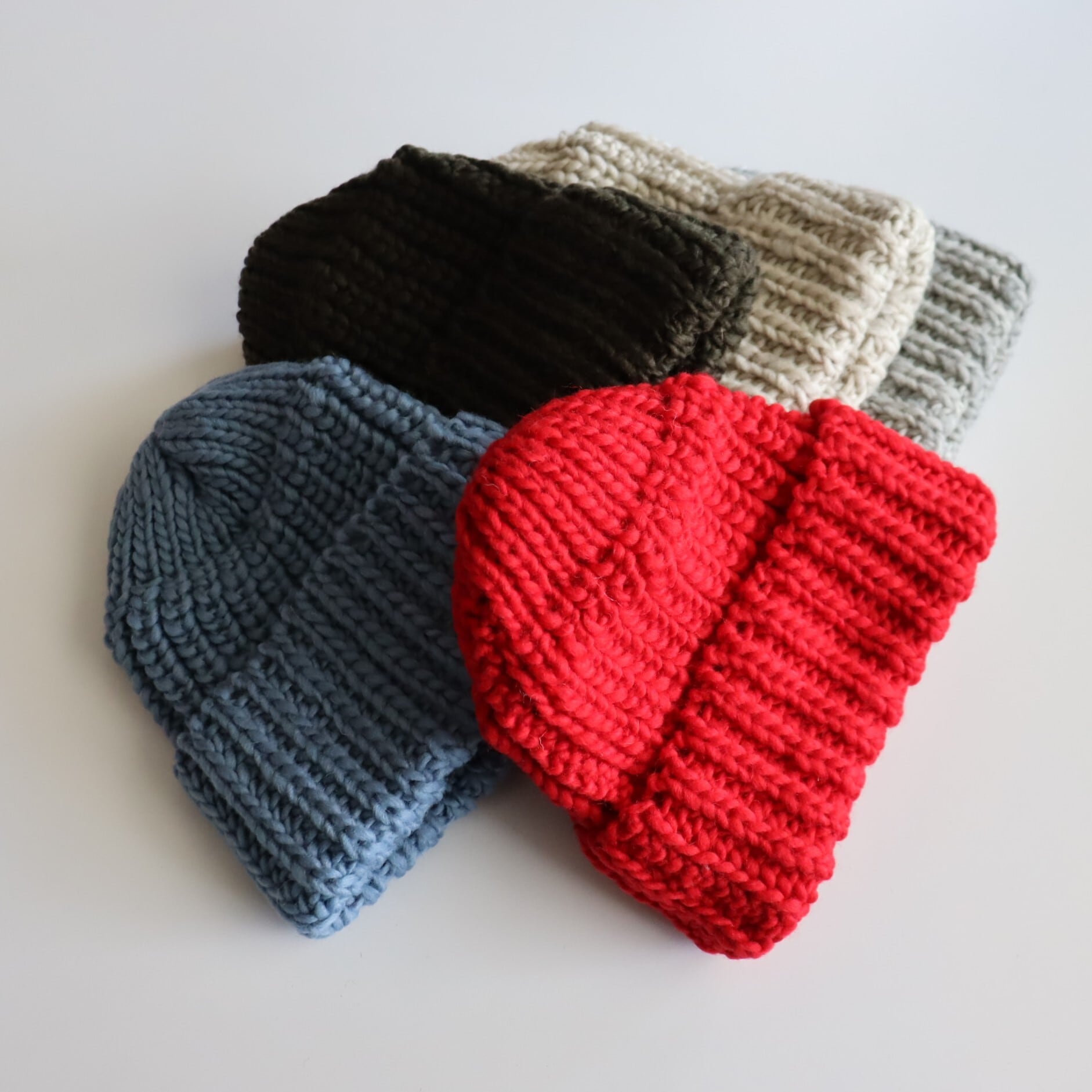 英国羊毛をブレンドし、もっちりした弾力とふわっとしたボリュームのニット帽。均一でない太さの糸が暖かな印象を引き立てています。トップ部分に傾斜をつけるよう編みを切り替えニット特有のもたつき感のないスッキリとしたシルエットで仕上げました。