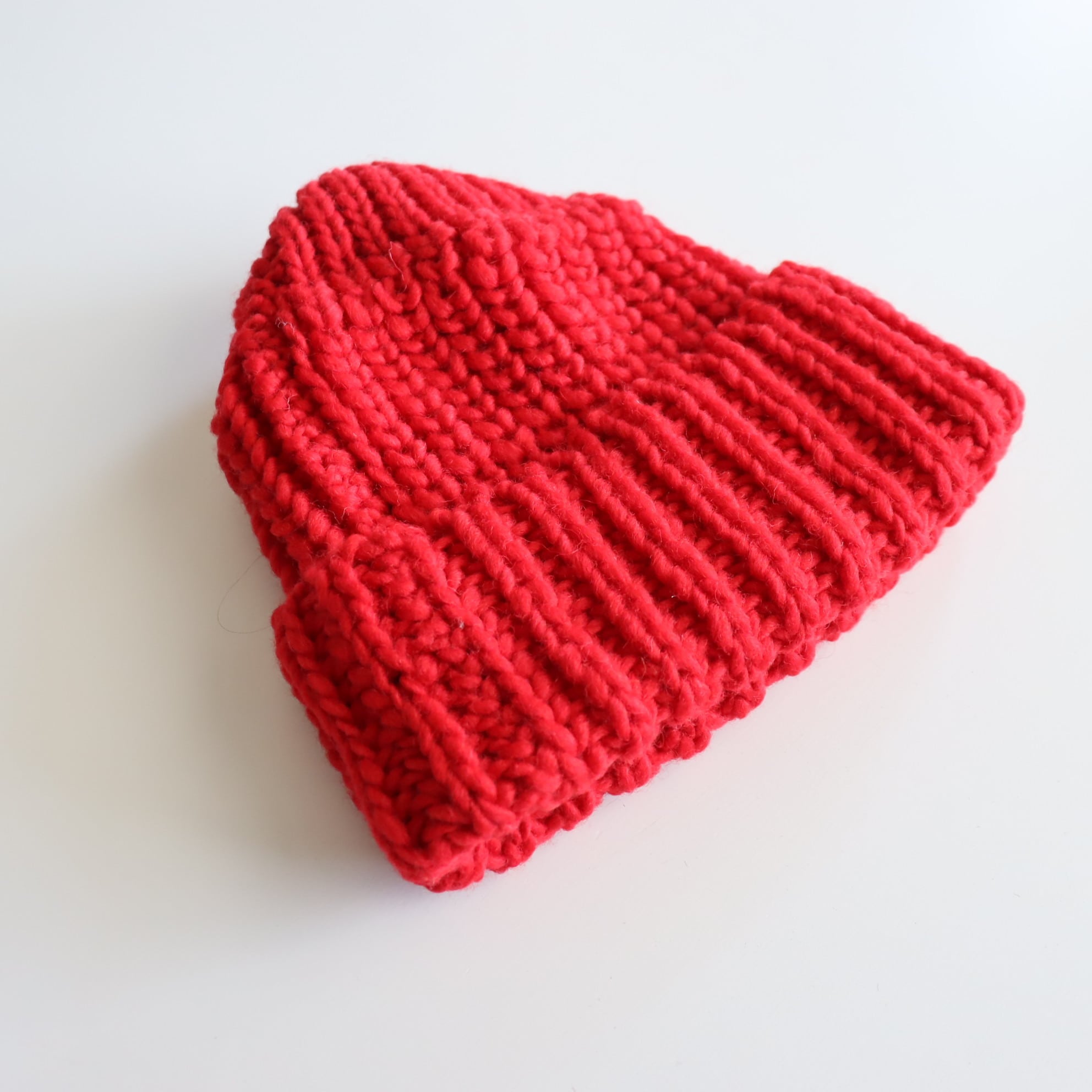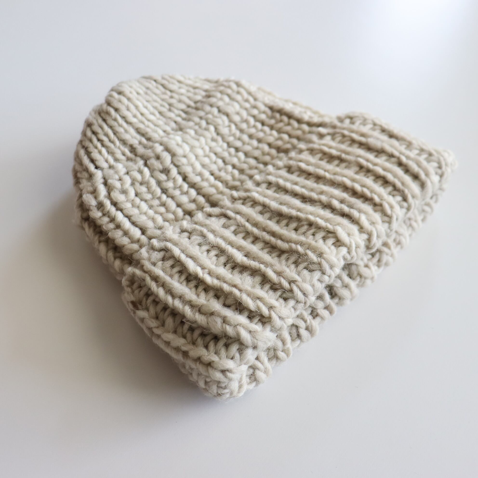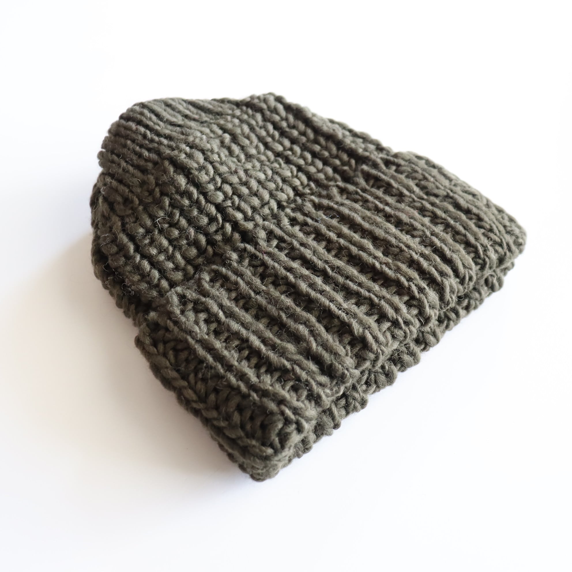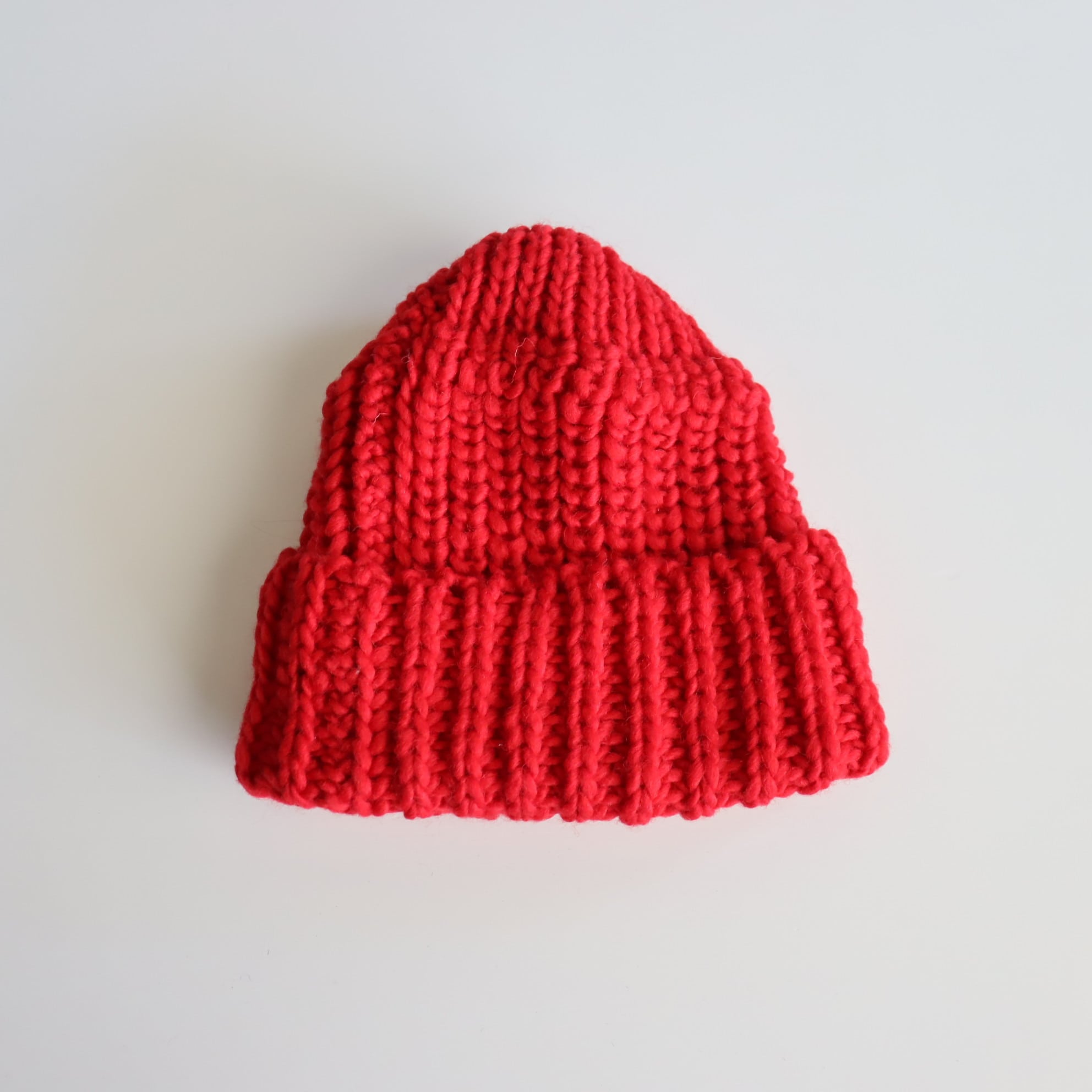 英国羊毛をブレンドし、もっちりした弾力とふわっとしたボリュームのニット帽。均一でない太さの糸が暖かな印象を引き立てています。トップ部分に傾斜をつけるよう編みを切り替えニット特有のもたつき感のないスッキリとしたシルエットで仕上げました。