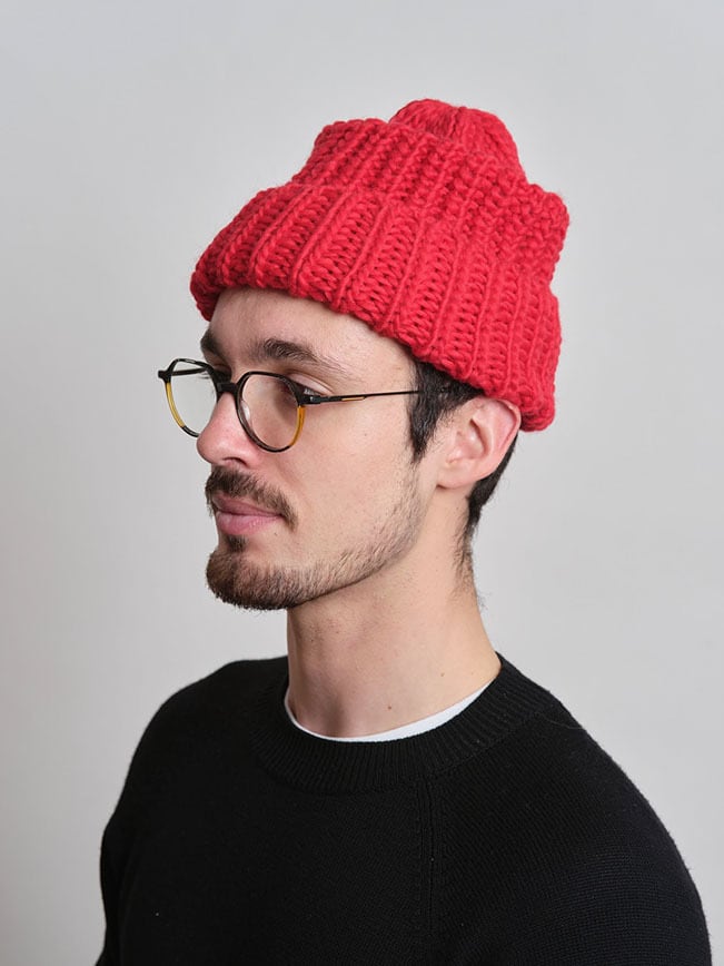 Blended with English wool, this knit cap has elasticity and soft texture. The uneven yarn gives it a warm look. To create a clean outline and give it a little angle, top part is knitted differently.