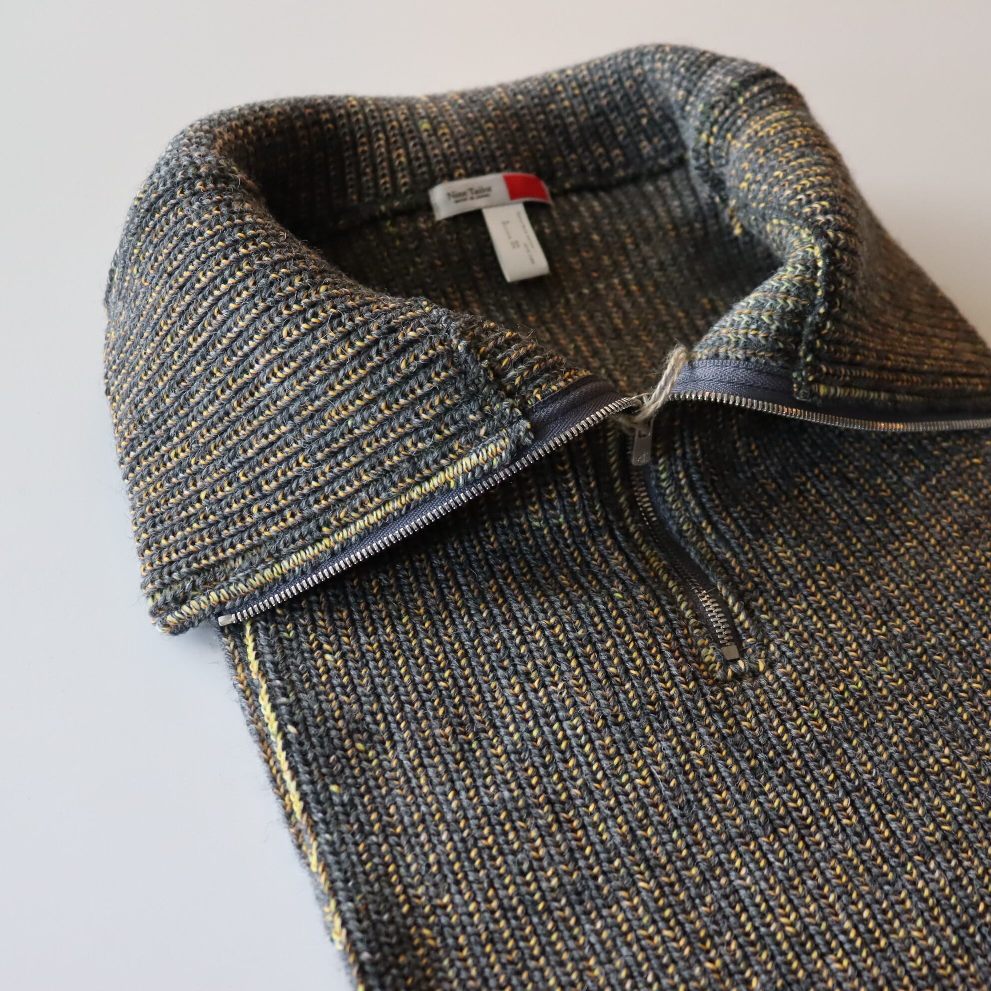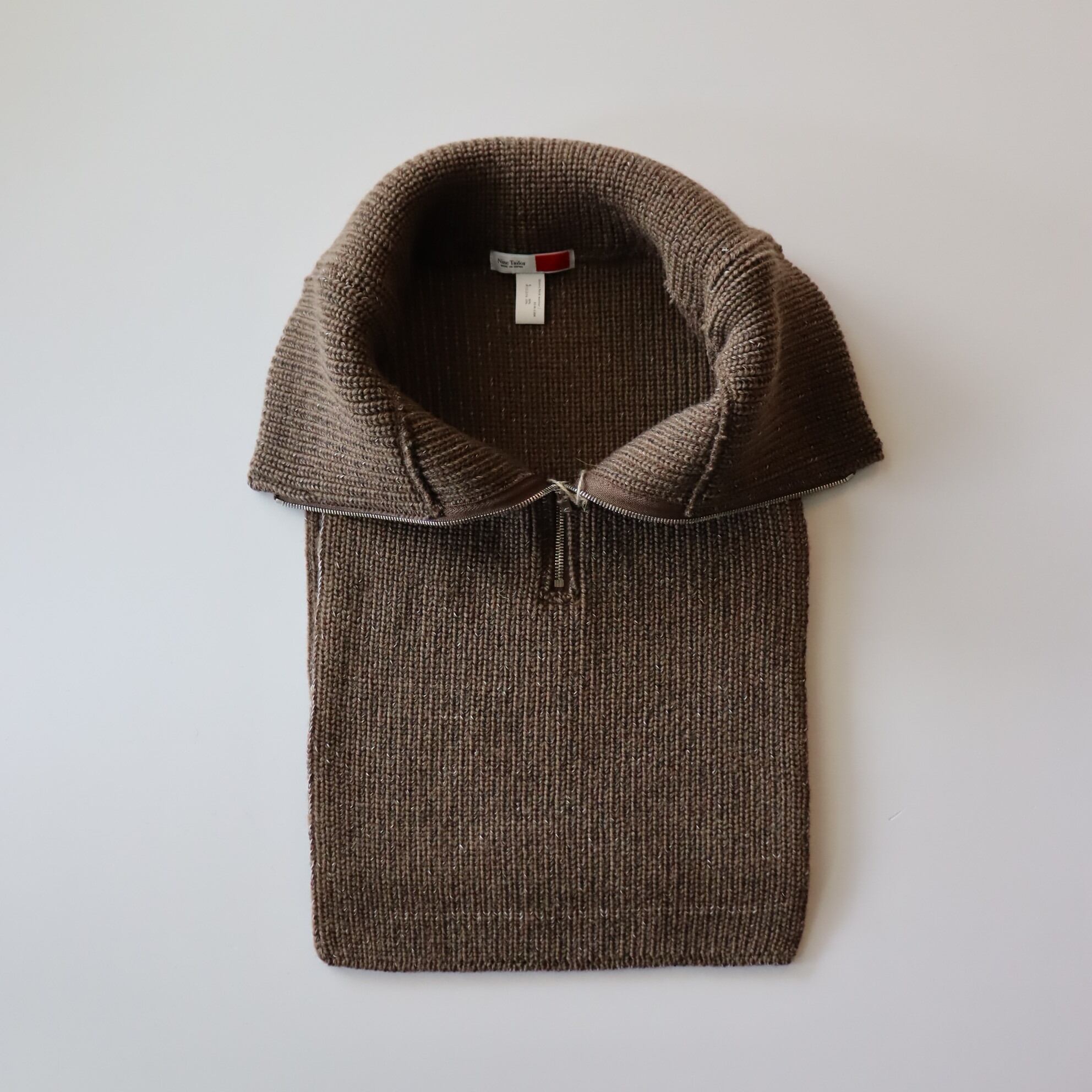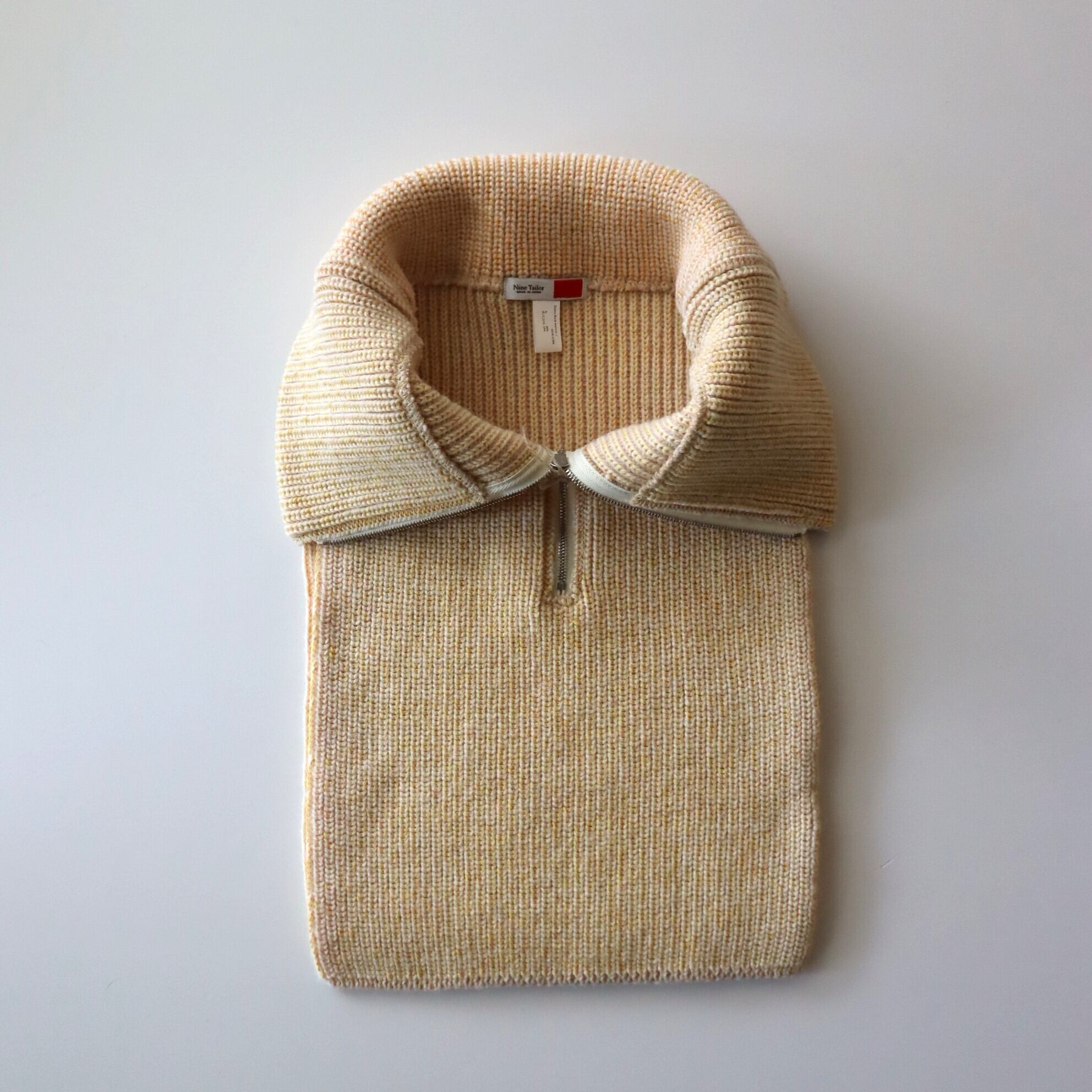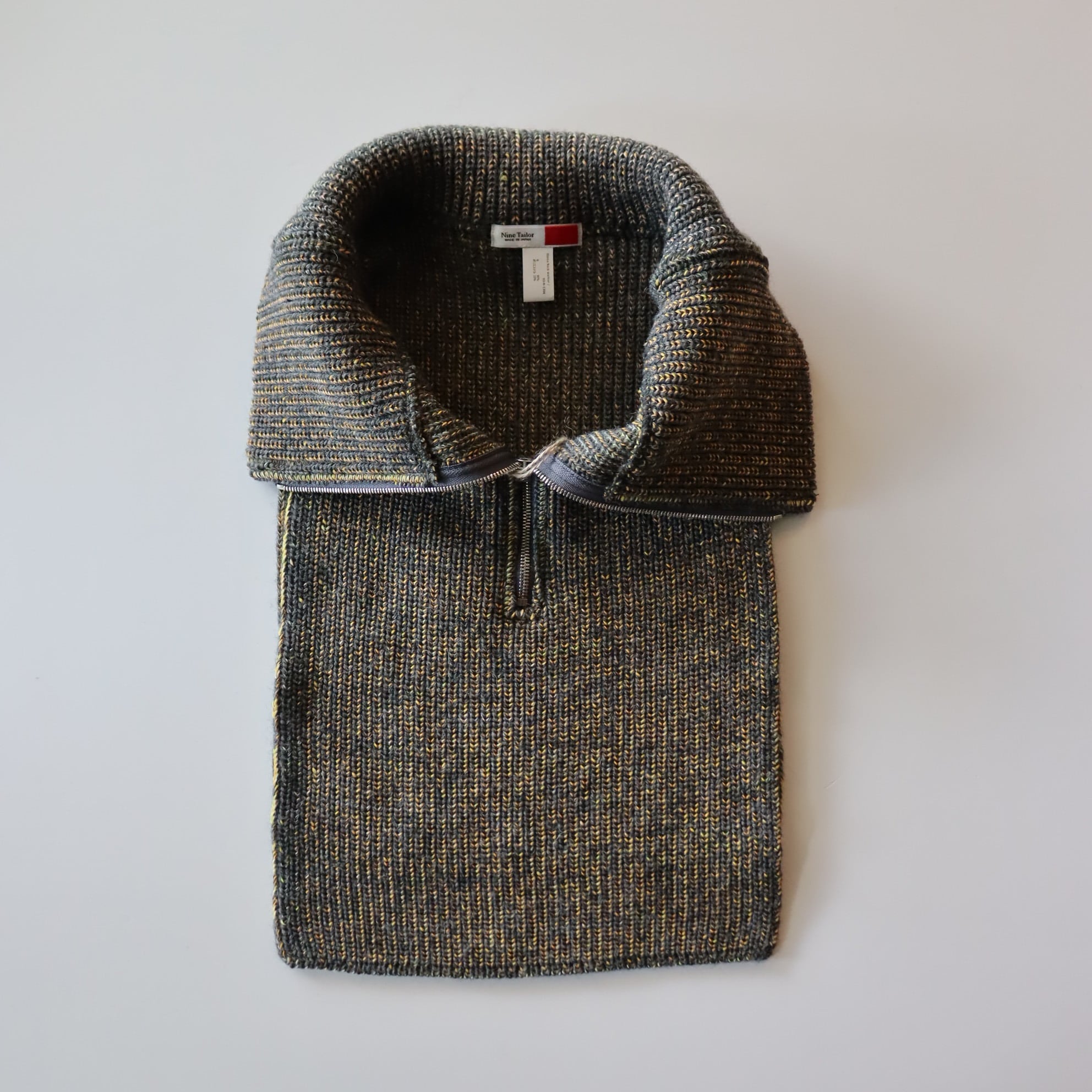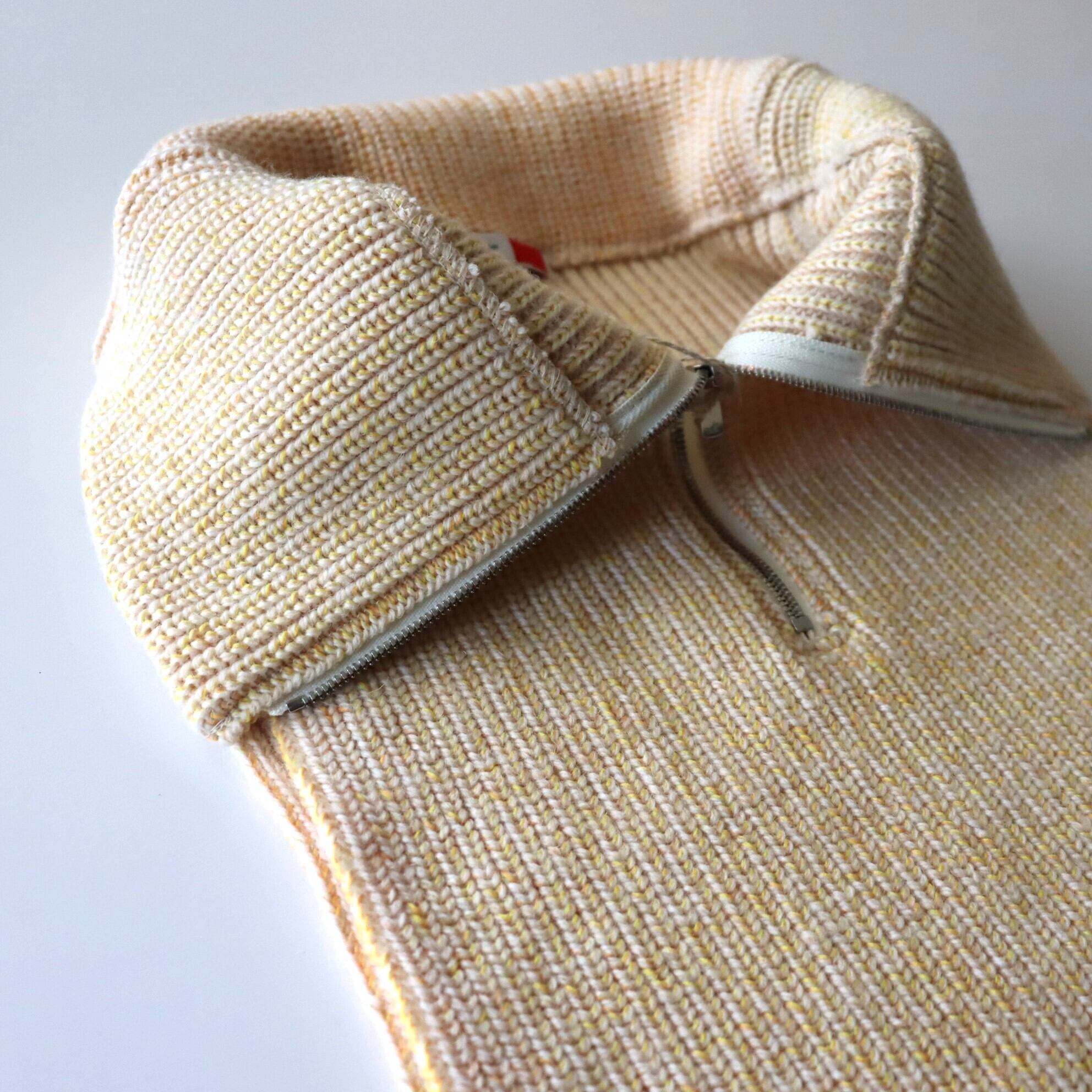 This wool neck warmer features elasticity. You can also wear like a layered half-zip knit by tucking the knit part hanging from the front and back into a coat or shirt. To make a melange look Tricolor acrylic yarns are twisted..