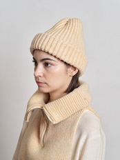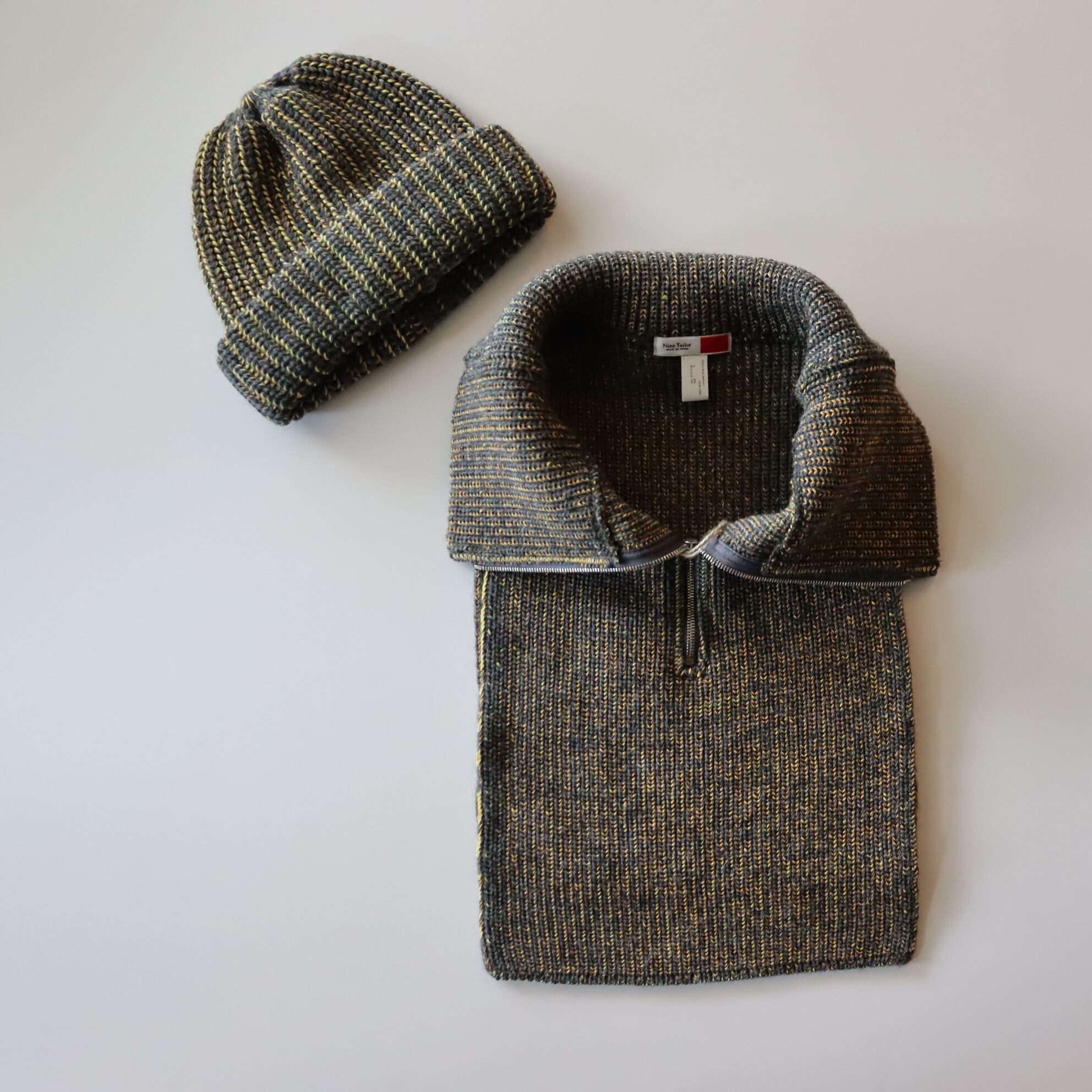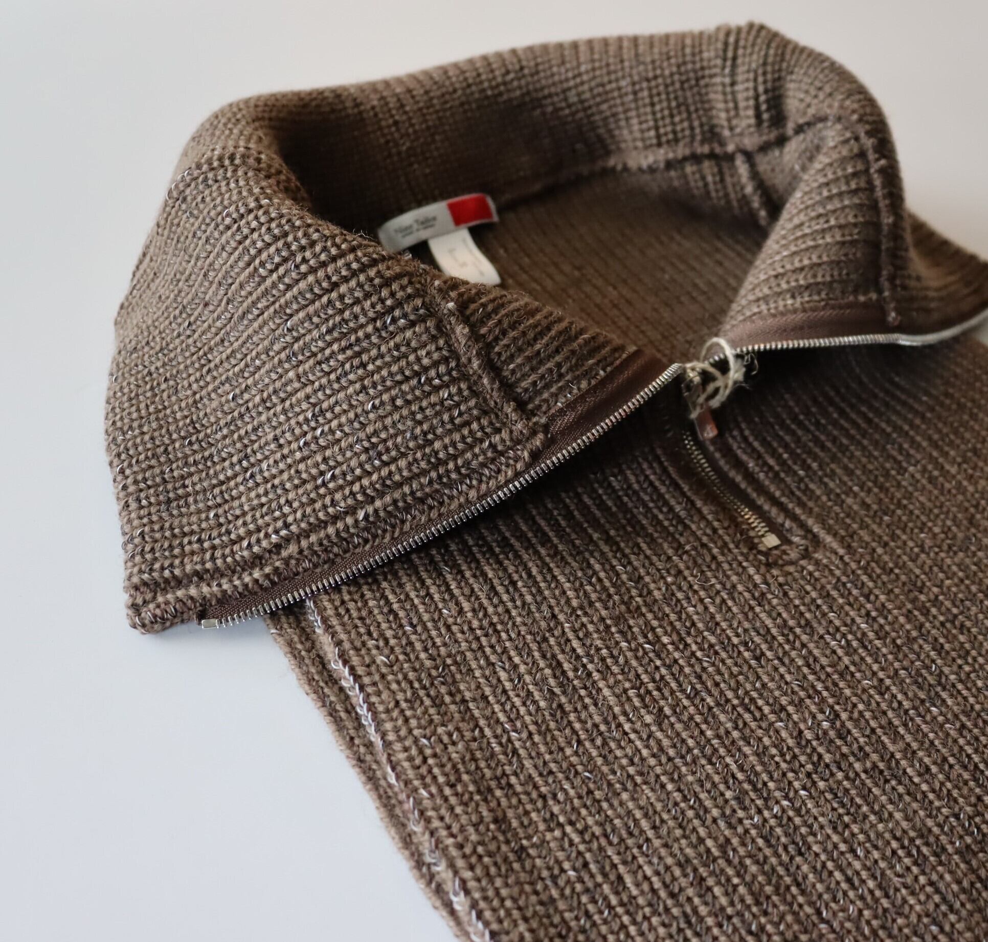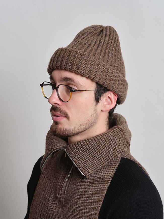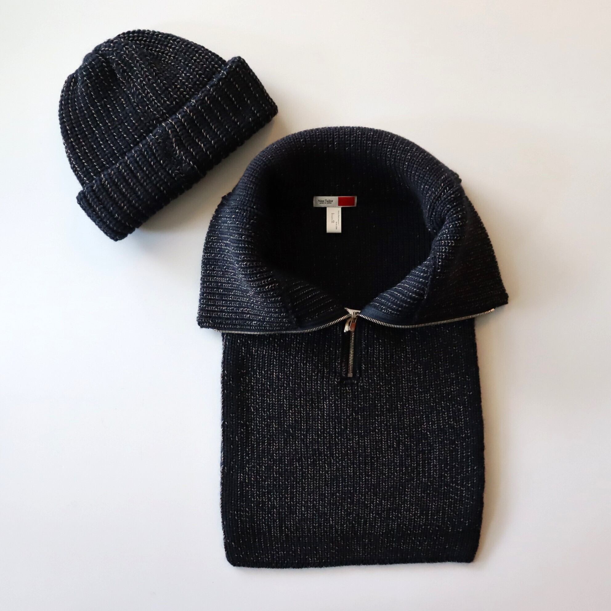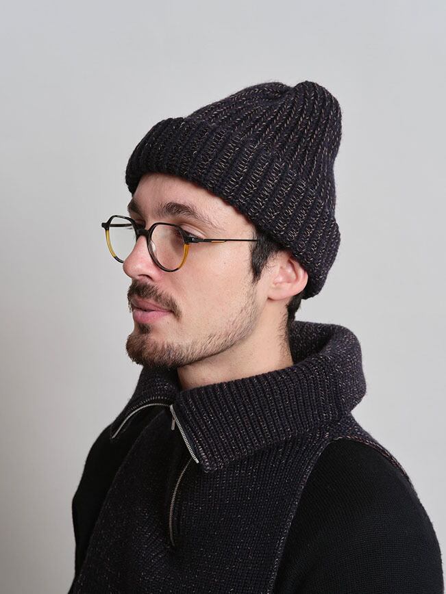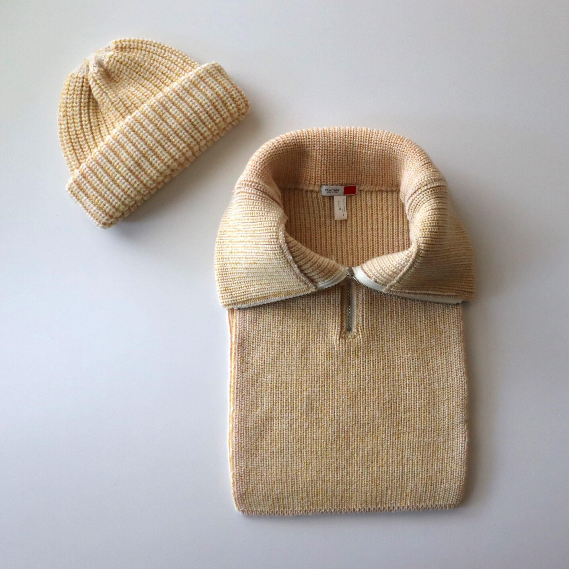 コシのある弾力が特徴のウール糸で仕立てたネックウォーマー。前後に垂らしたニット部分をコートやシャツの中にしまい、ハーフジップニットをレイヤードしたように見せることもできます。3色のアクリル糸をミックスすることで浮き上がったメランジ感のある表情がポイントです。同素材のニット帽と合わせての着用もお勧めです。