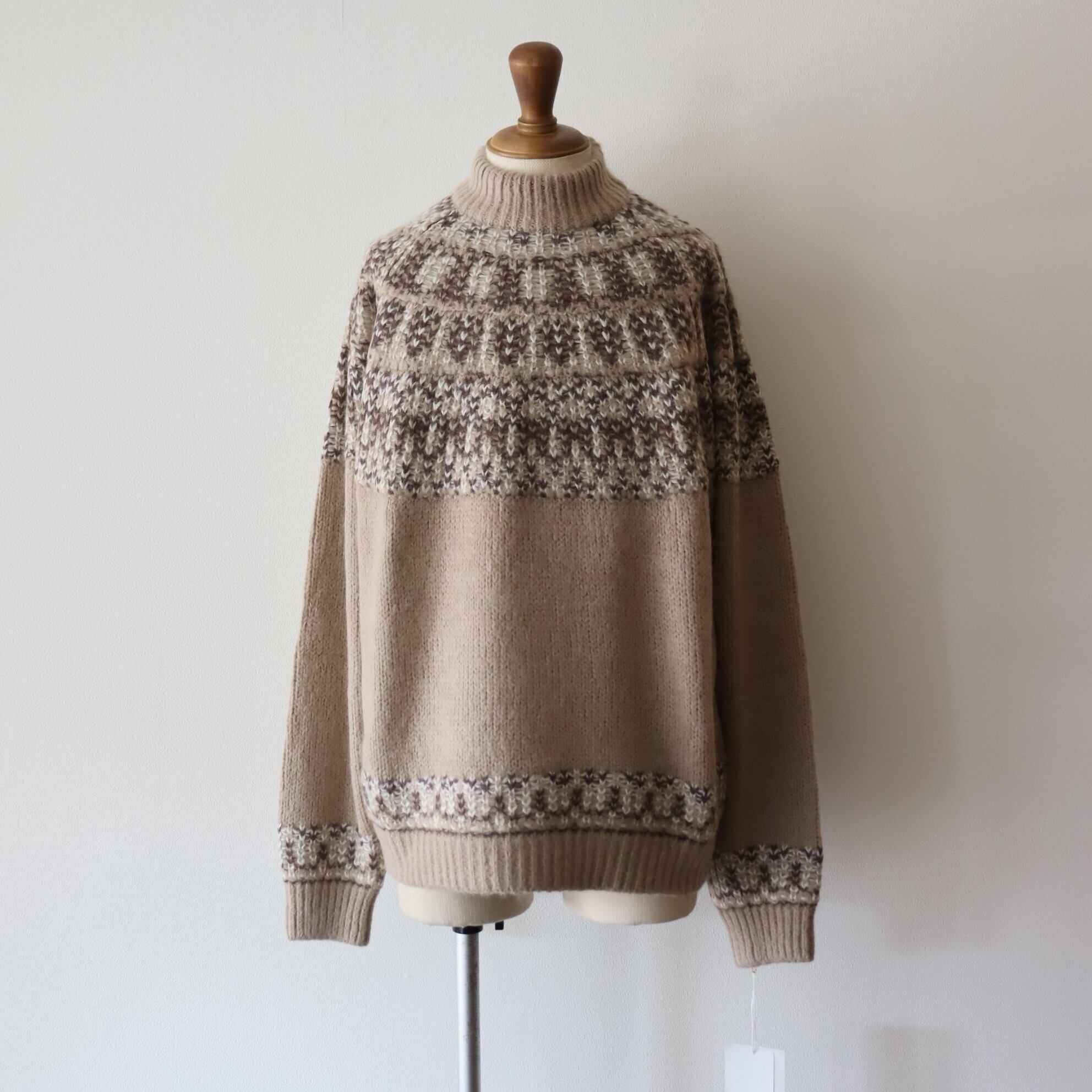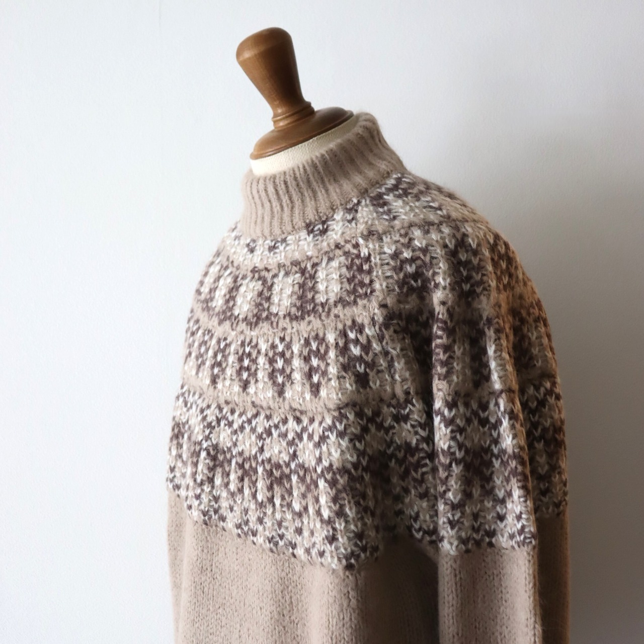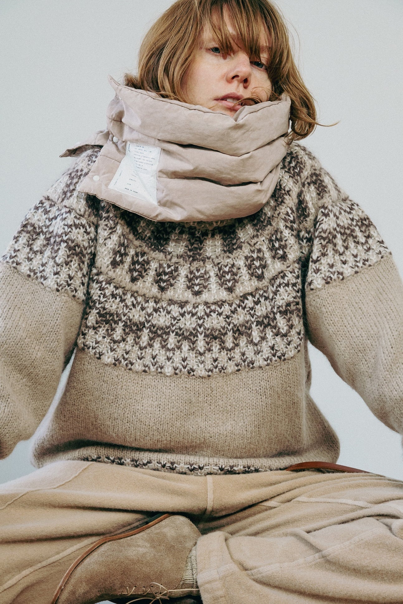型はビンテージのノルディックセーターからインスピレーションを受け、元々⾷⽤の⽺の⽑を原料につくられているチクチクする原料を、ベビースーリーアルパカに置き換えてつくっています。スーリーアルパカはペルーの標⾼4000Mを超えるアンデス⼭脈に⽣息するアルパカの中でもスーリー種という極めて細い繊維で、アルパカ全体の3%しか⽣息していない希少原料になります。