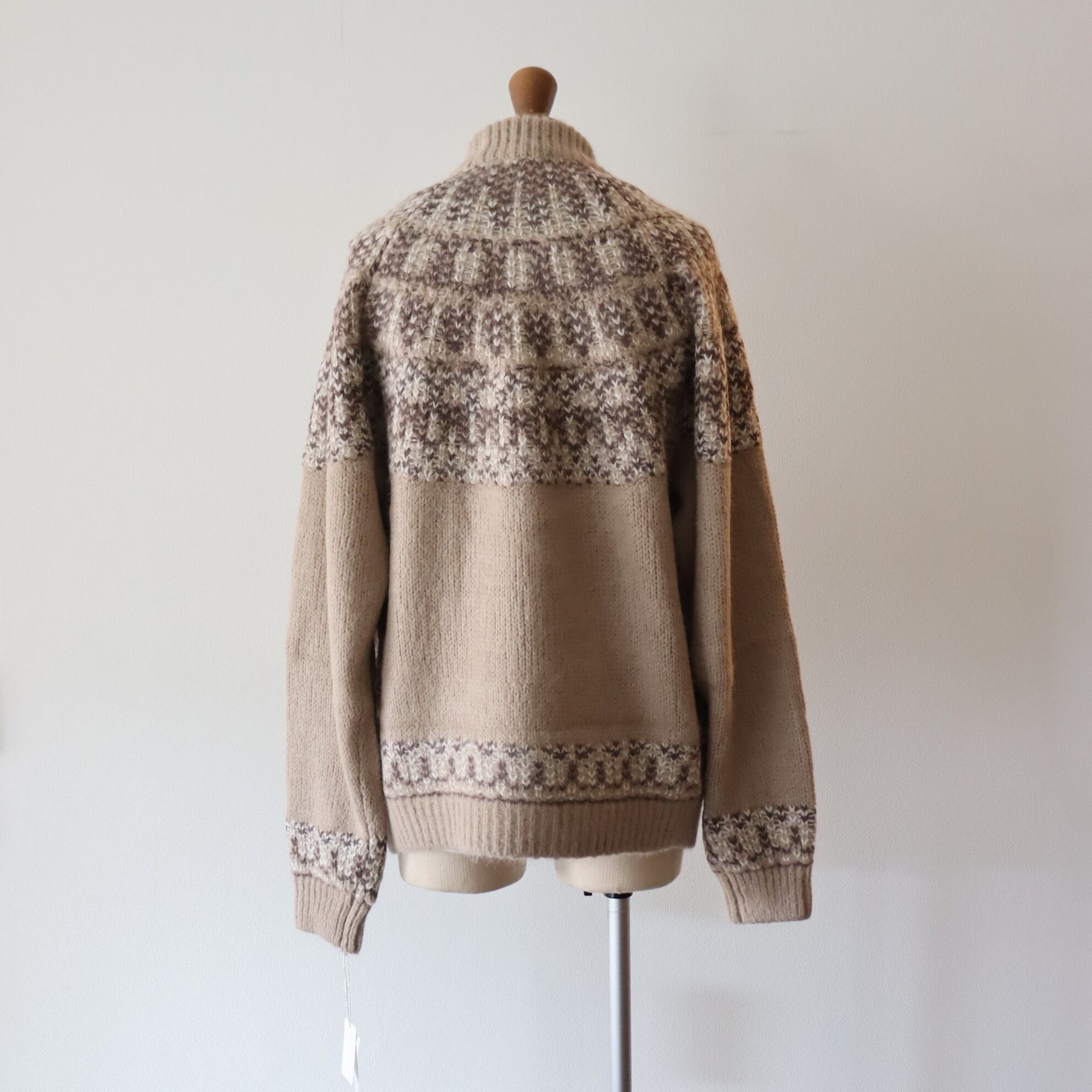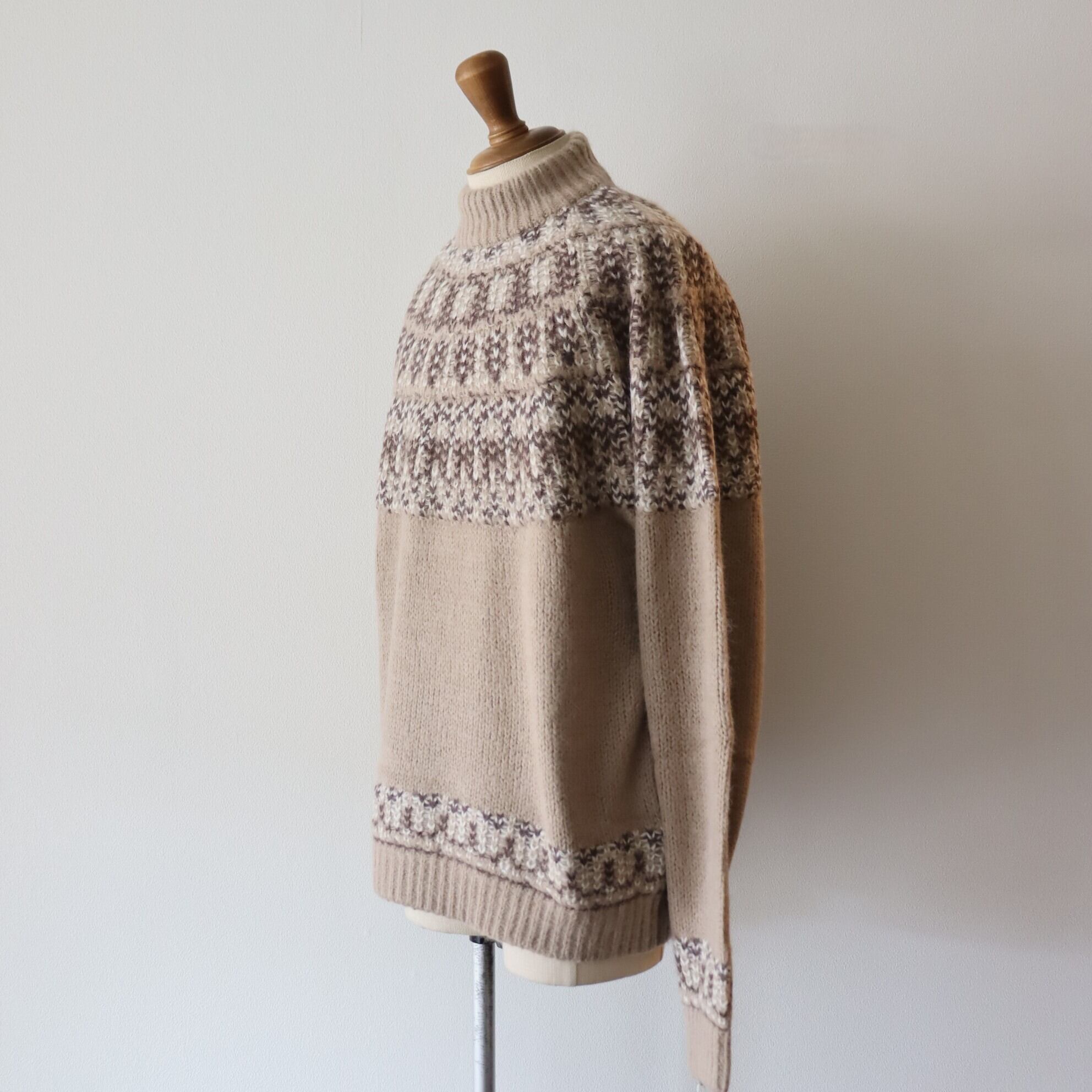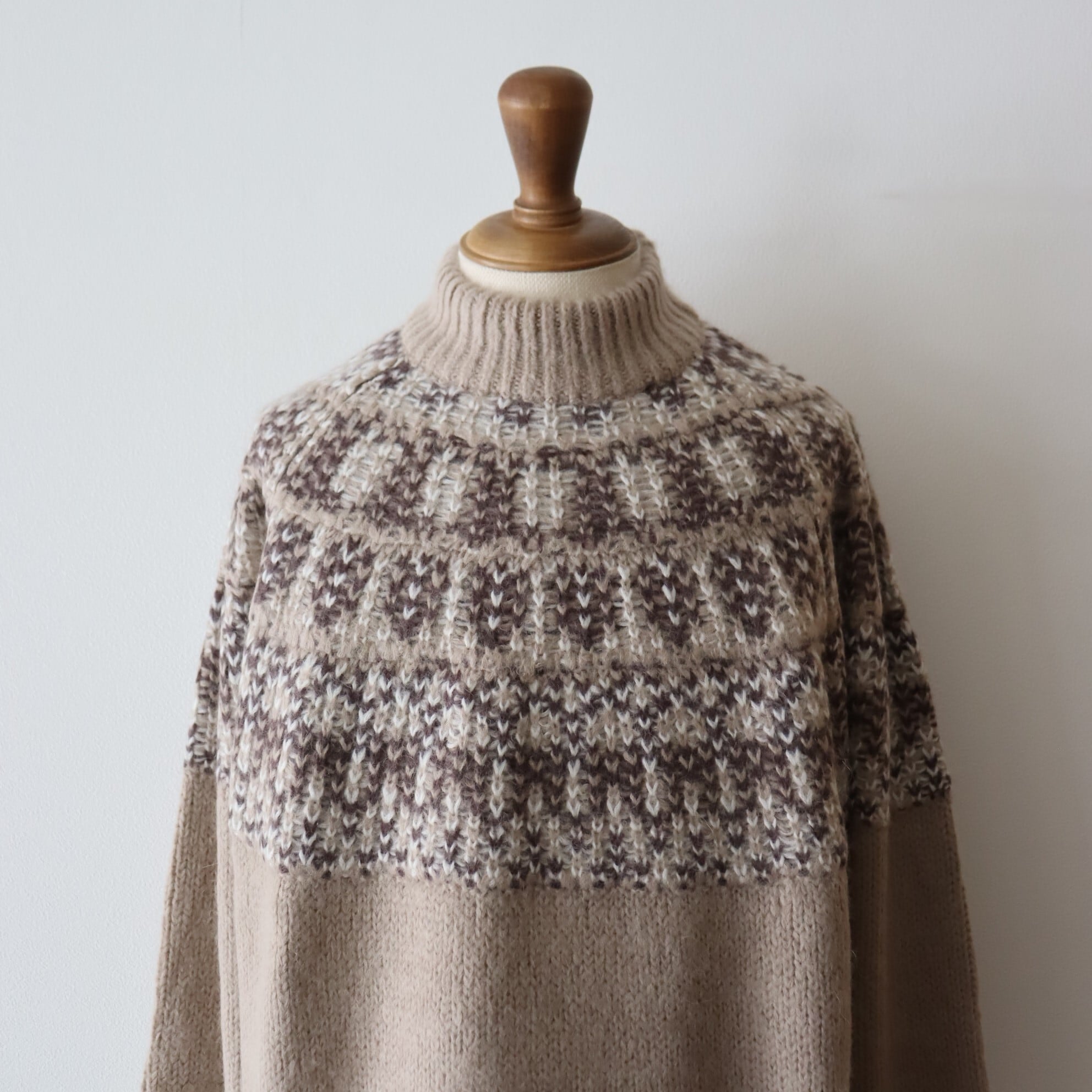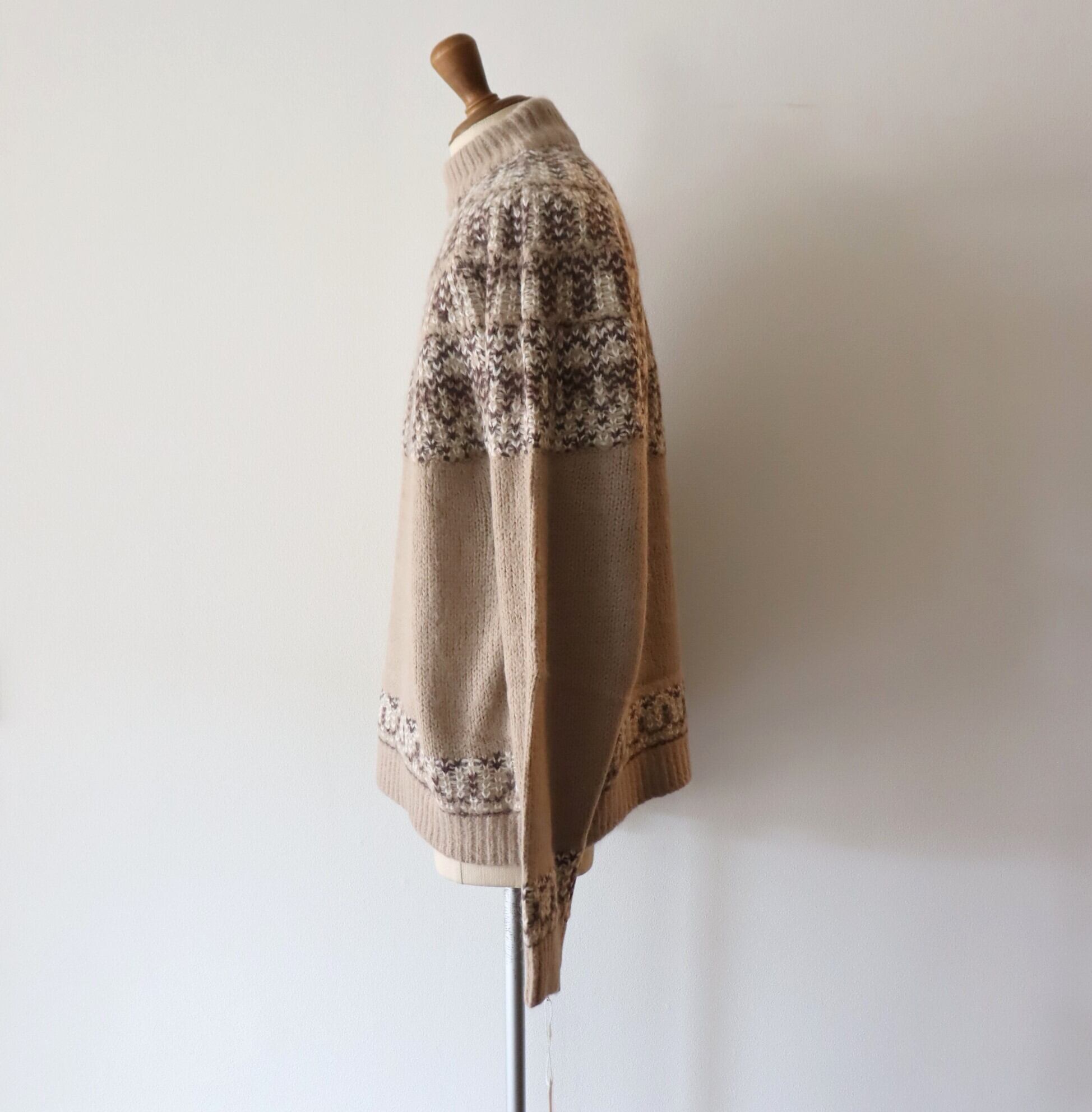 型はビンテージのノルディックセーターからインスピレーションを受け、元々⾷⽤の⽺の⽑を原料につくられているチクチクする原料を、ベビースーリーアルパカに置き換えてつくっています。スーリーアルパカはペルーの標⾼4000Mを超えるアンデス⼭脈に⽣息するアルパカの中でもスーリー種という極めて細い繊維で、アルパカ全体の3%しか⽣息していない希少原料になります。
