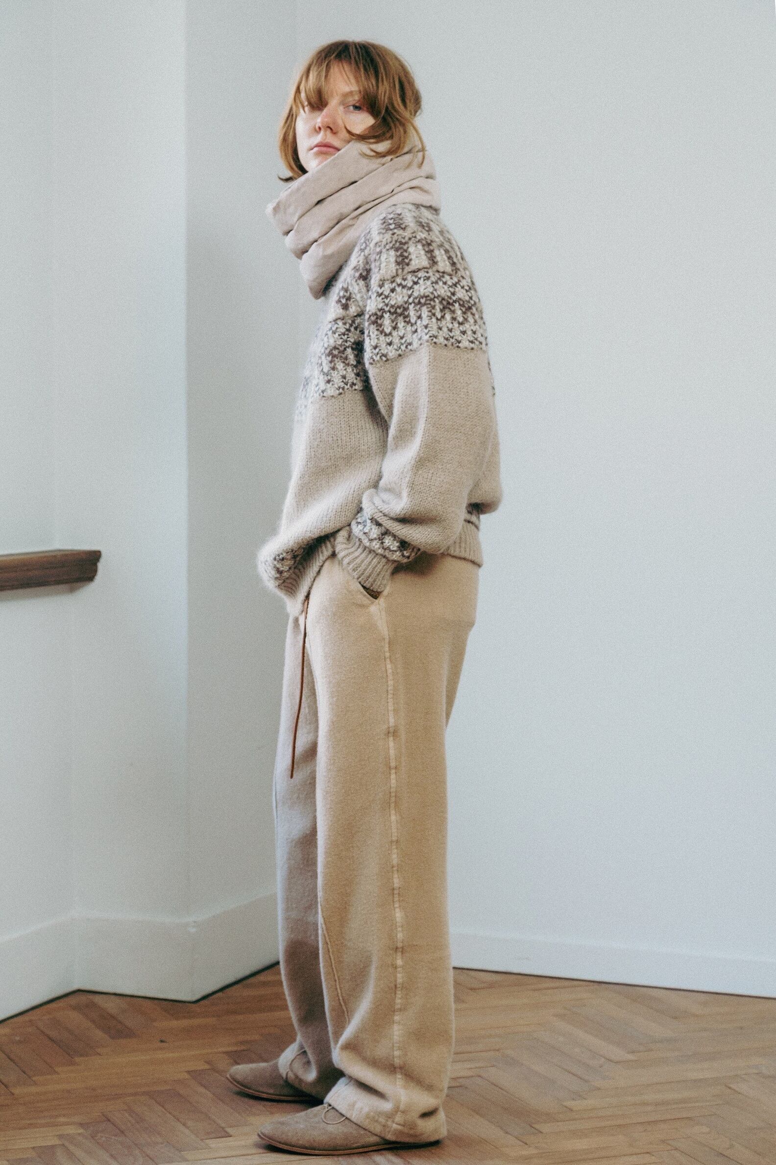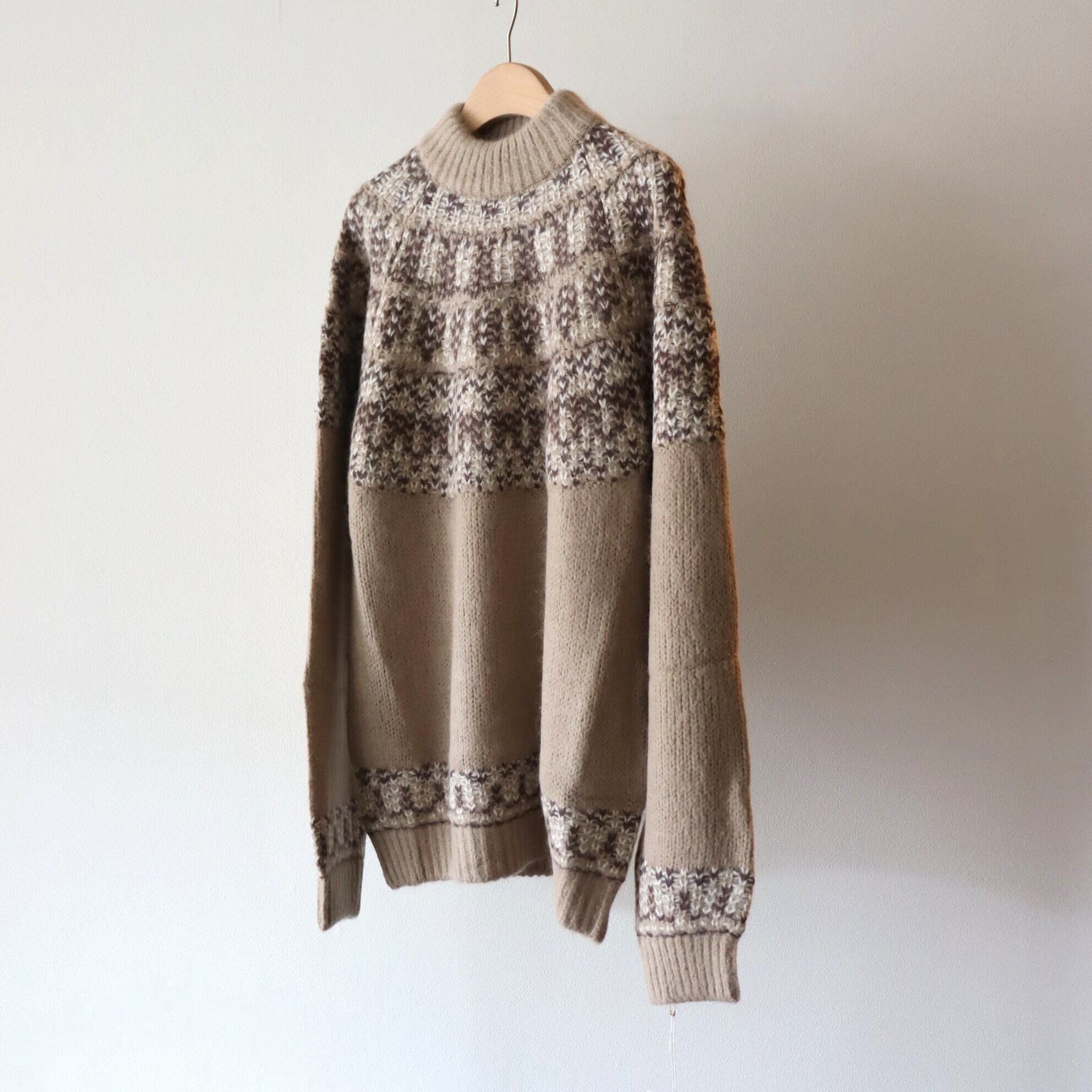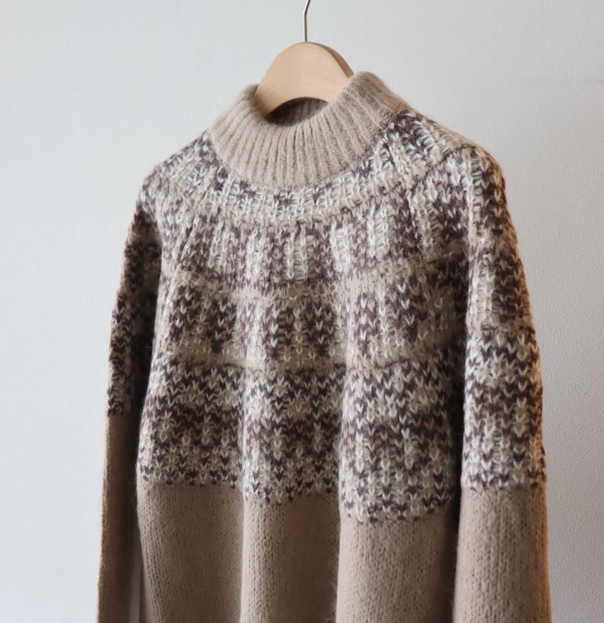 この⽷は1本1本の⽑が極めて細いので、とても柔らかく優しい肌触りで、軽くて暖かいのが特徴です。3Gのローゲージな仕上げなので、重い⾒た⽬だが、軽く肌触りが良い仕上げになっていて、ジャガードの柄の部分を敢えて裏使いにする事により、様々な境界線を取り払うというブランドのメッセージを込めたデザインになっています。