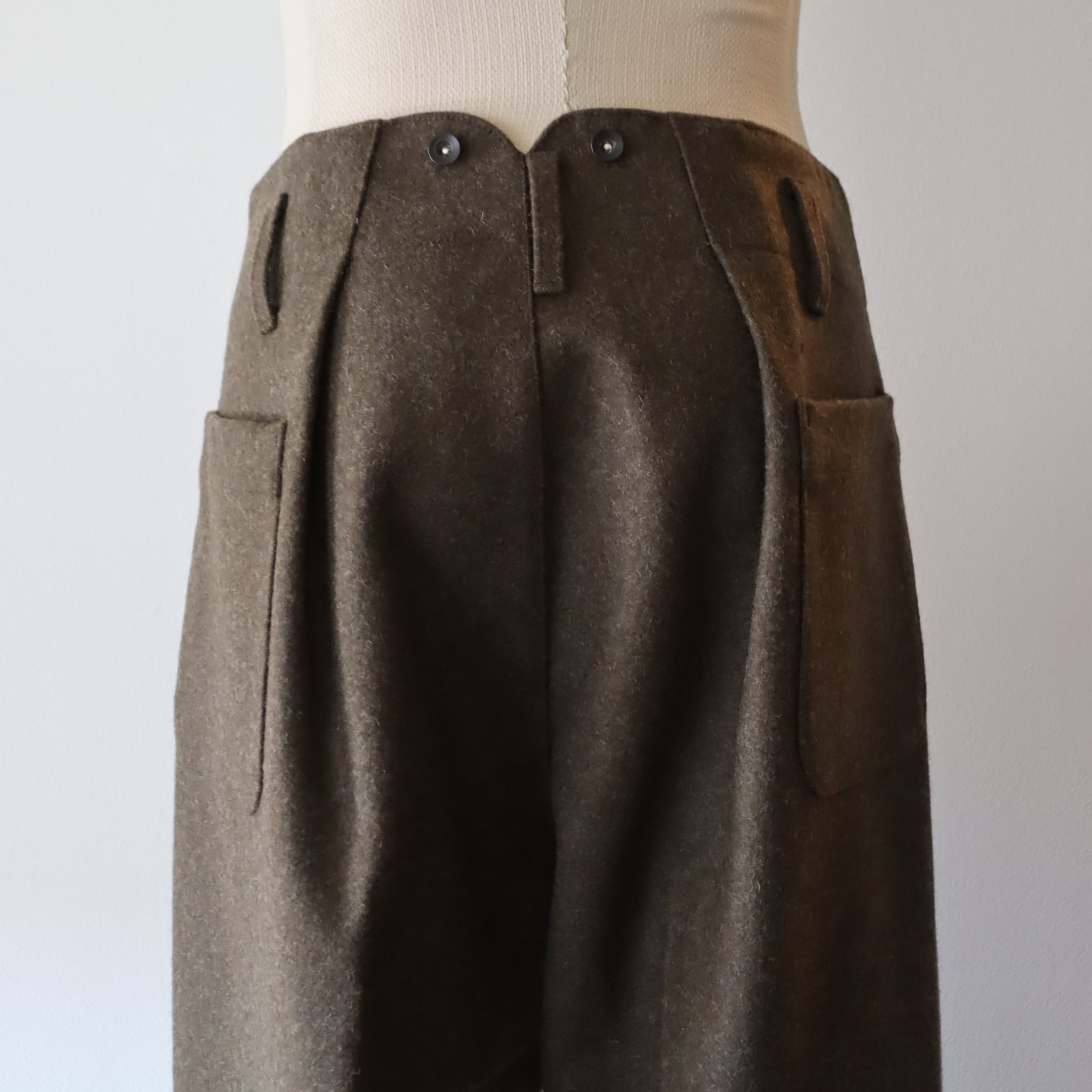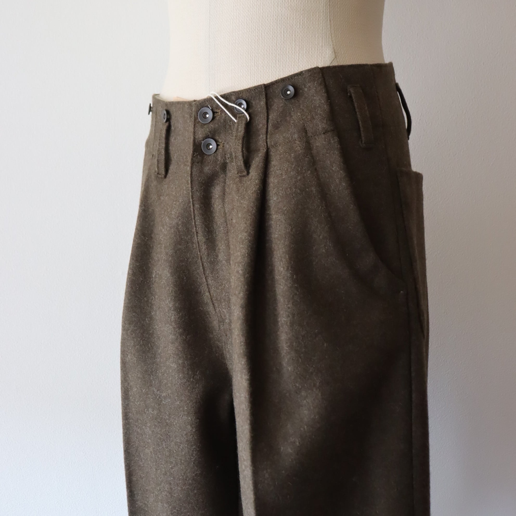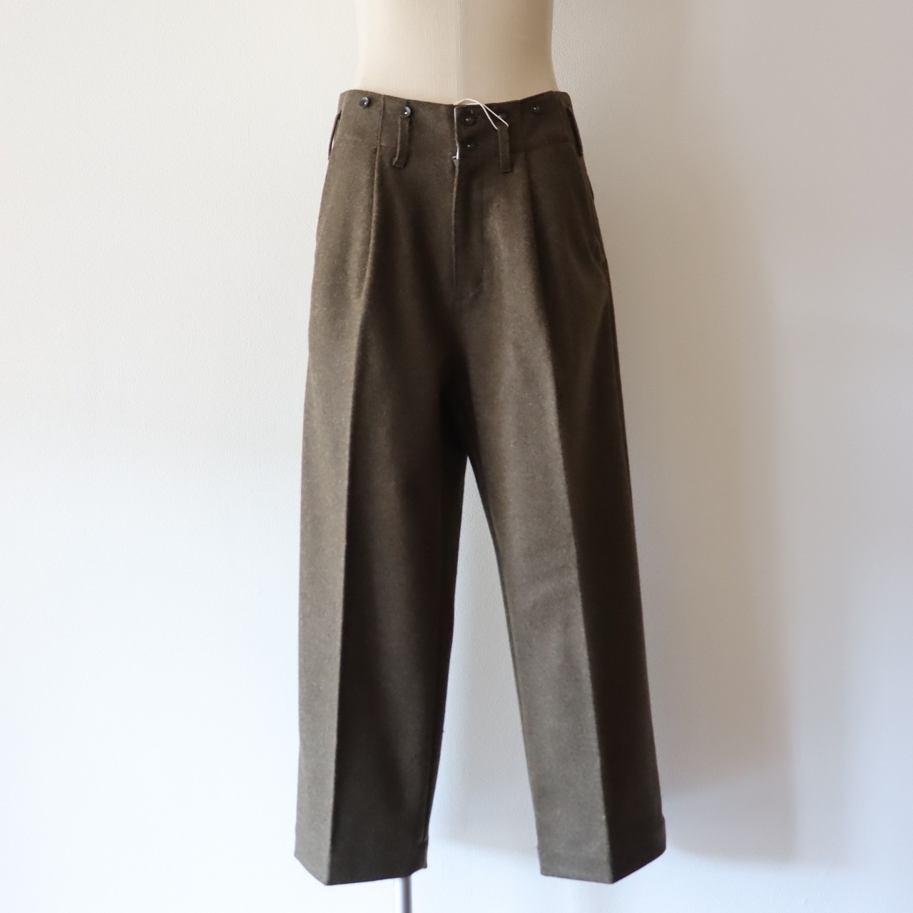 ヘビーアウターなどに使われるような極厚のヘビーメルトンを使用しており、非常に迫力のあるワークパンツに仕上っています。前後4タックからのセンタークリースがヘビーメルトンの素材感も相まって美しい立体感を演出し上品さもプラスしてくれています。また、サスペンダーボタンも配されており、サスペンダーで釣っての着用もお勧めです!
