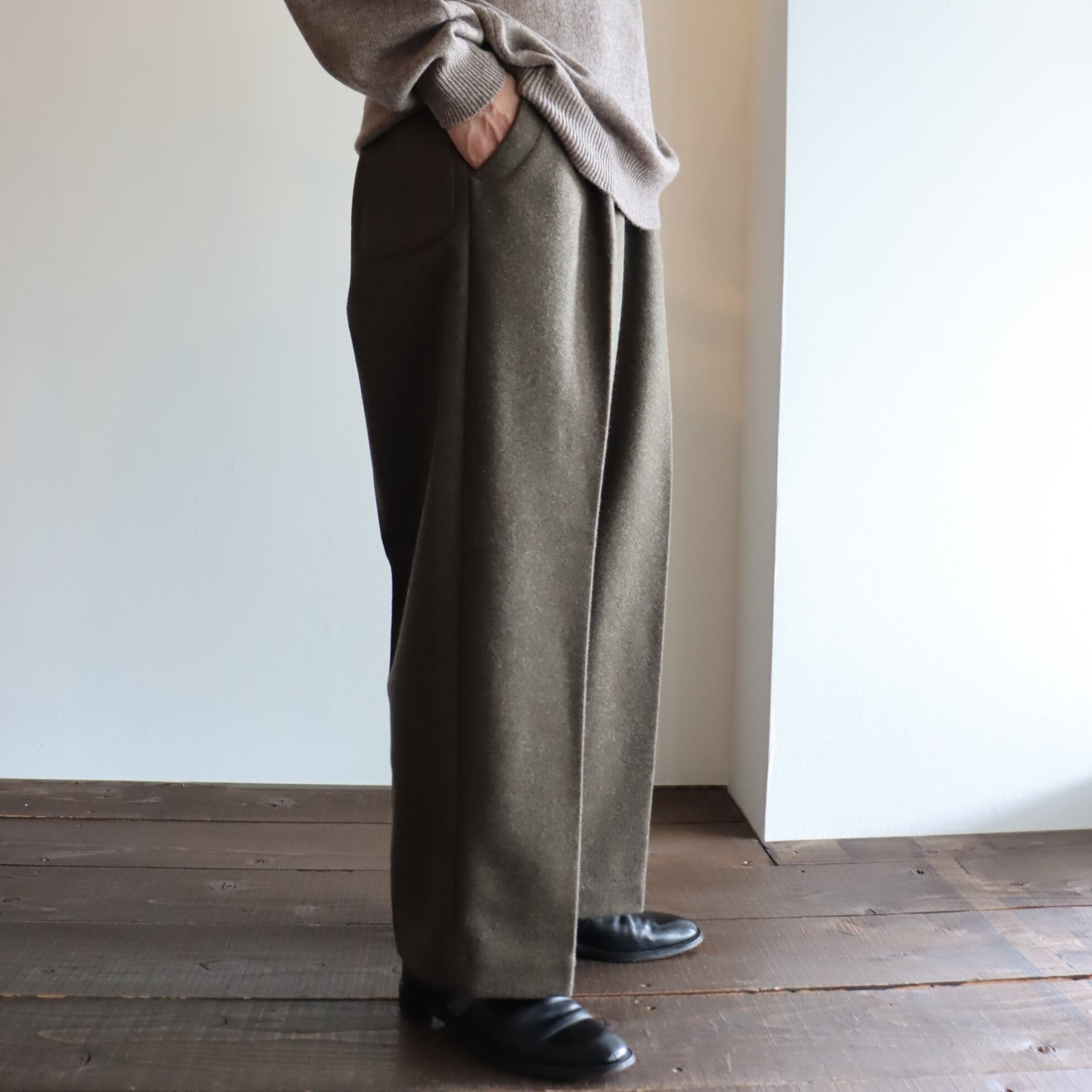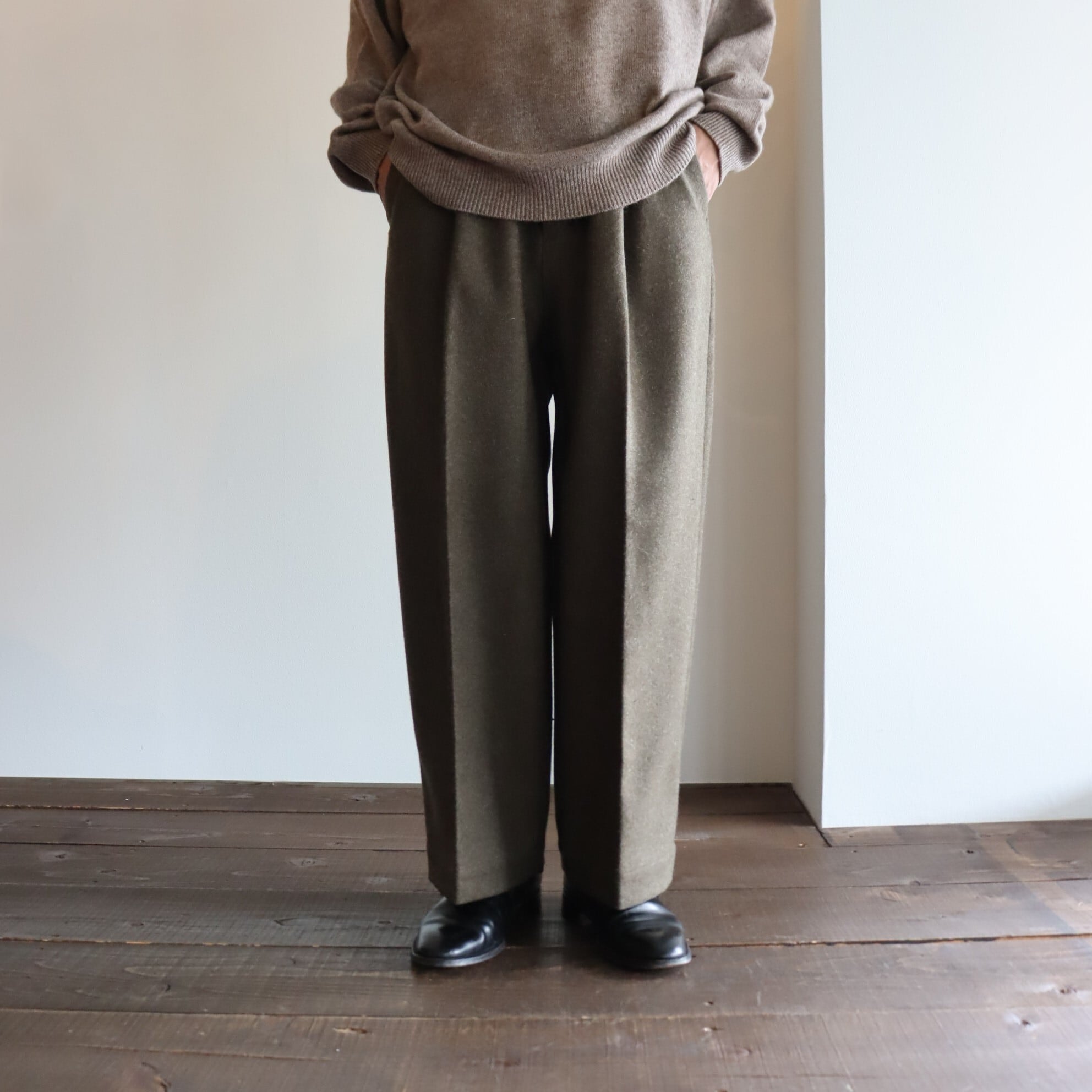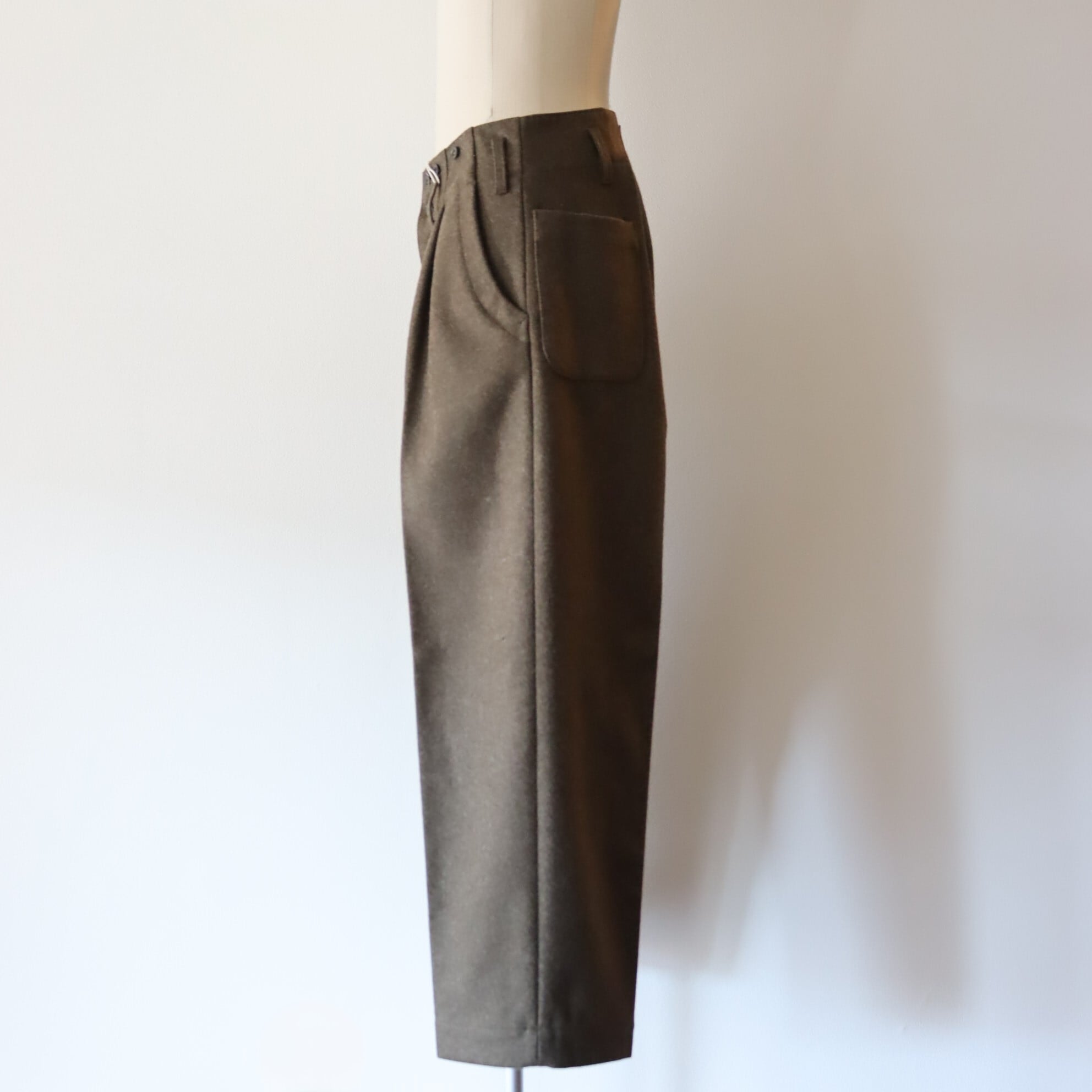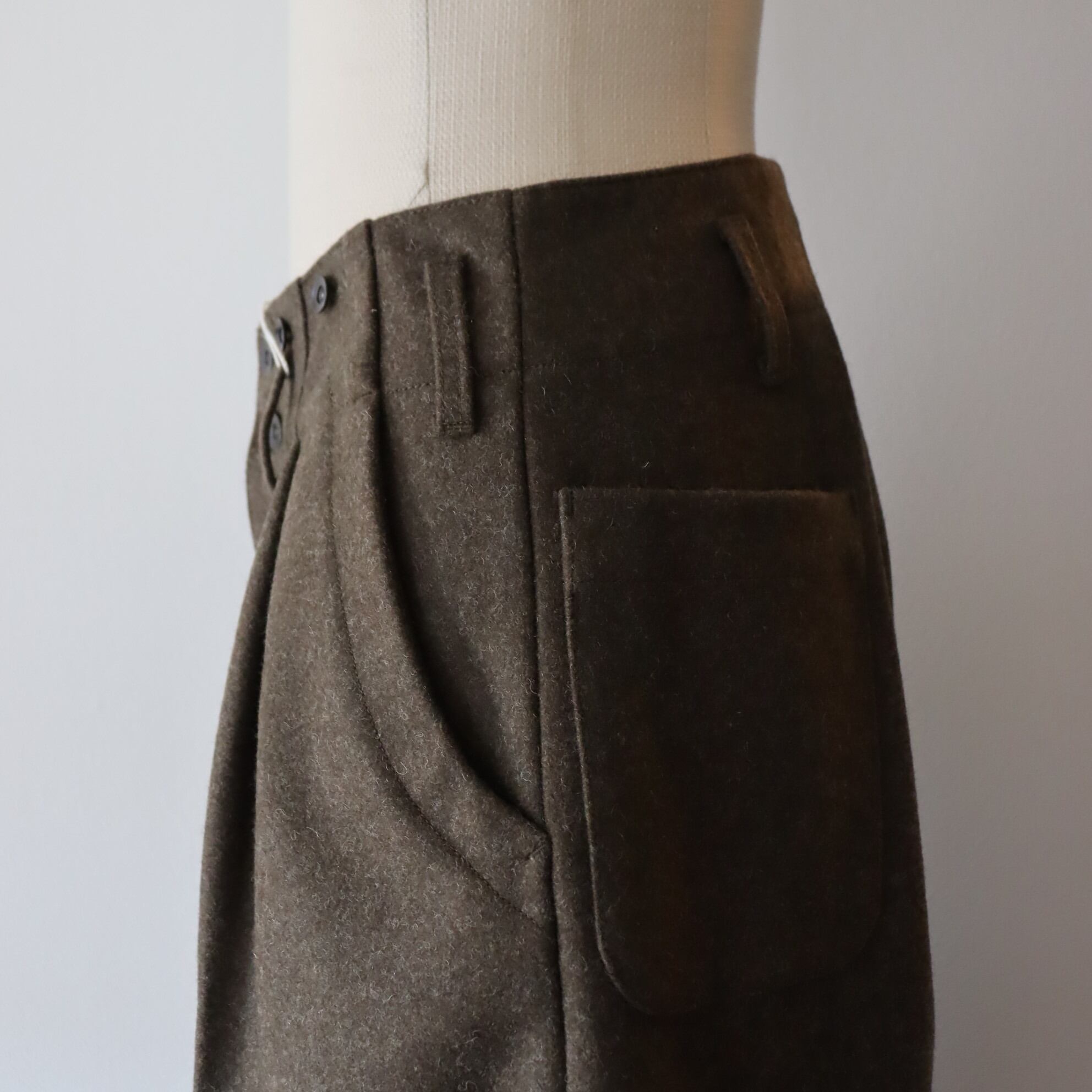 ヘビーアウターなどに使われるような極厚のヘビーメルトンを使用しており、非常に迫力のあるワークパンツに仕上っています。前後4タックからのセンタークリースがヘビーメルトンの素材感も相まって美しい立体感を演出し上品さもプラスしてくれています。また、サスペンダーボタンも配されており、サスペンダーで釣っての着用もお勧めです!