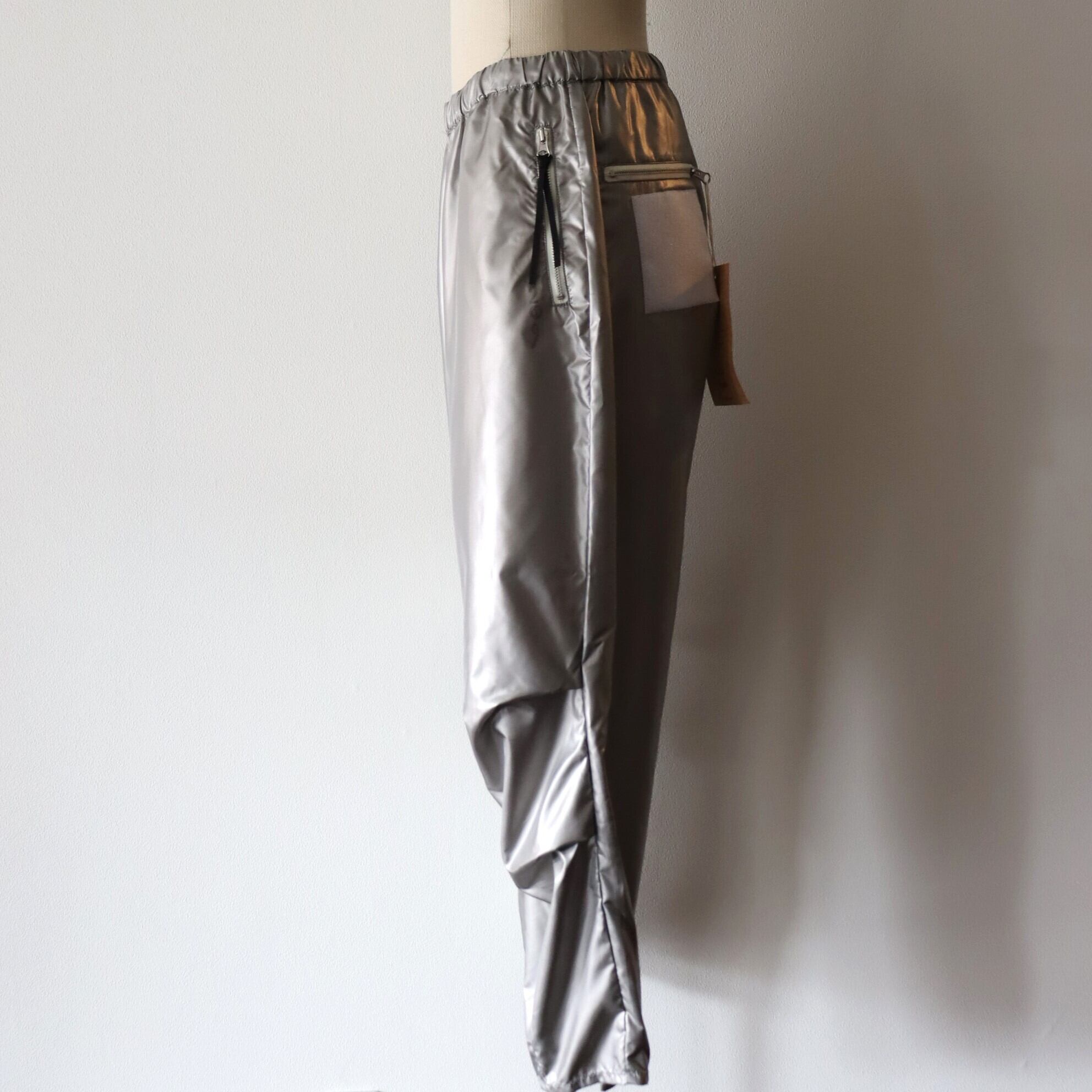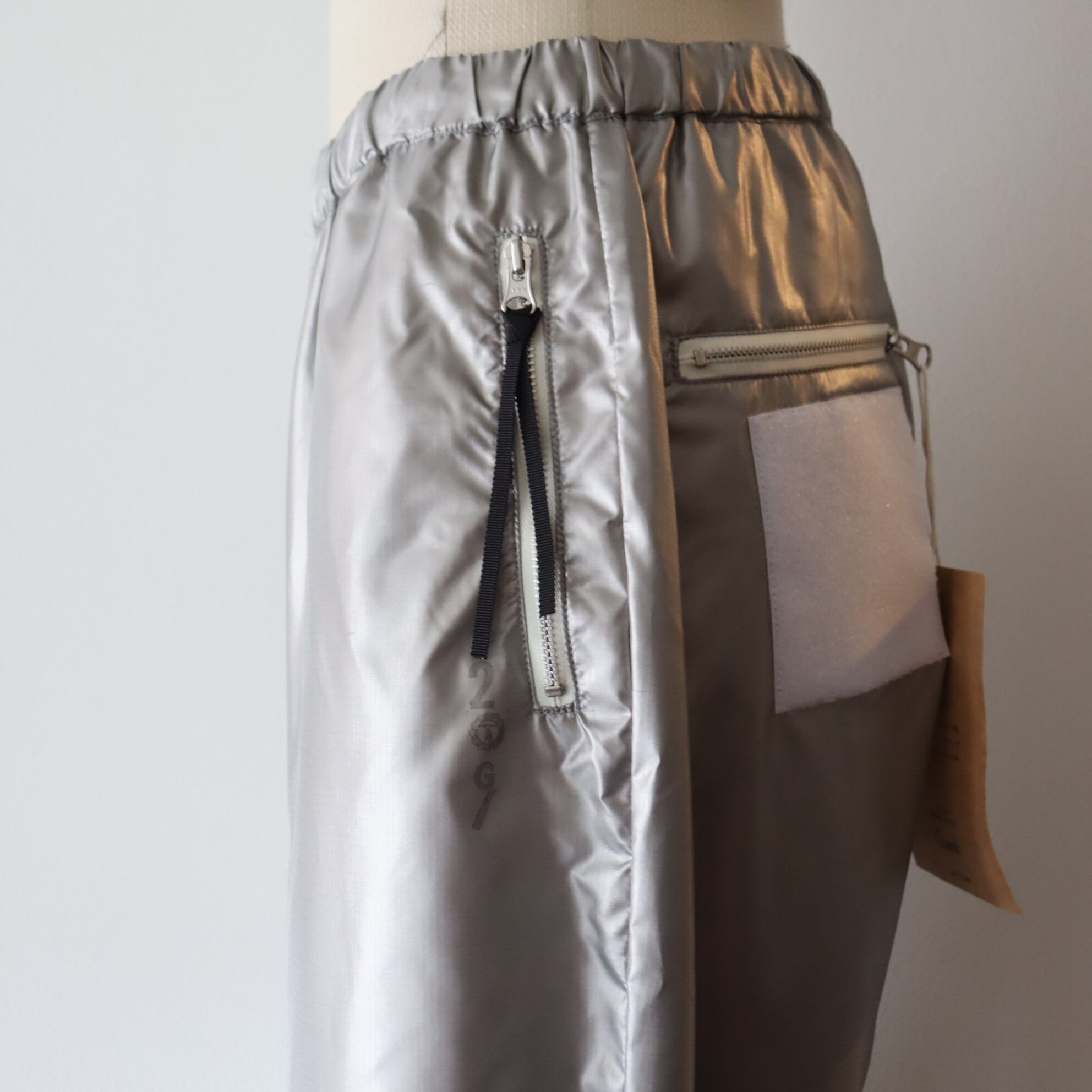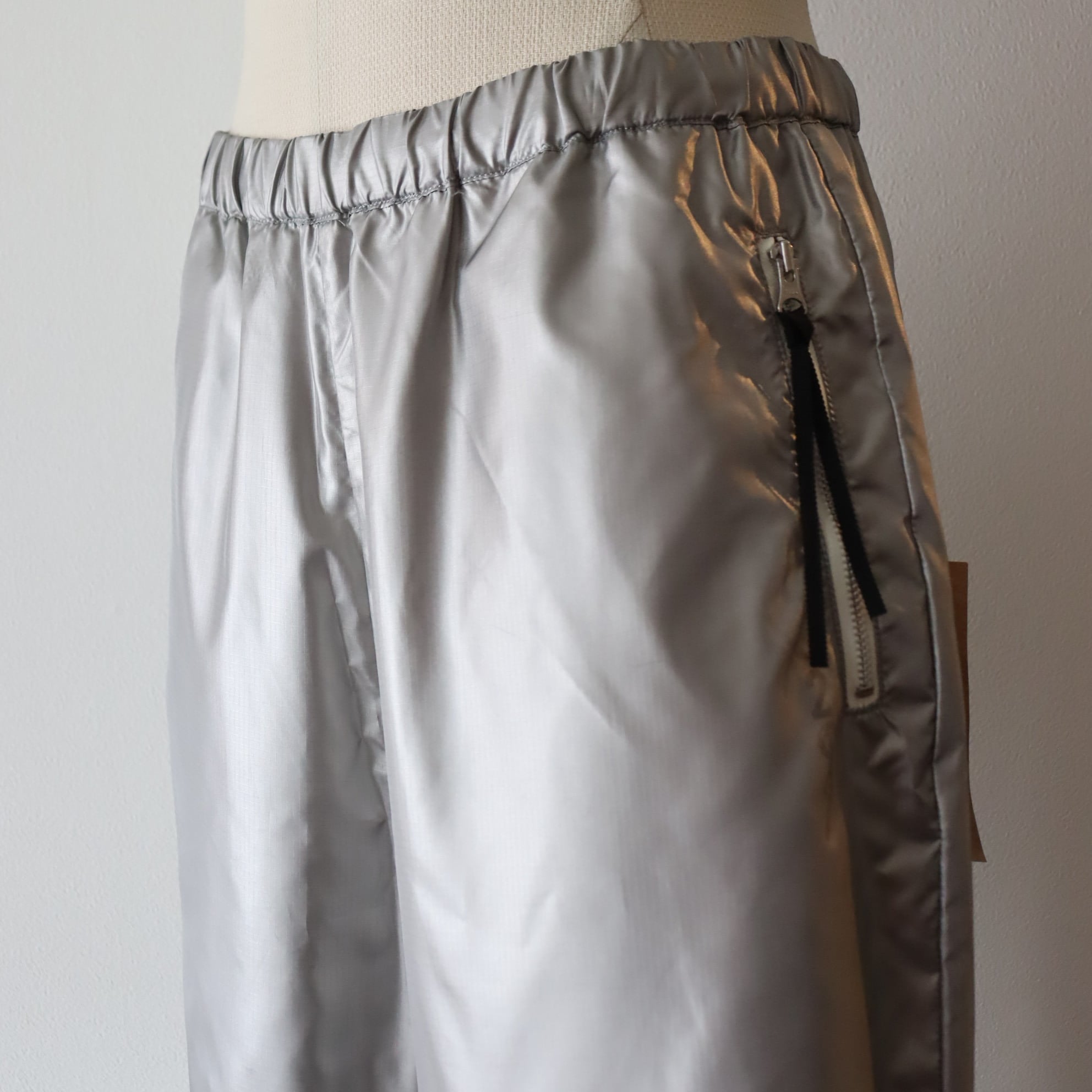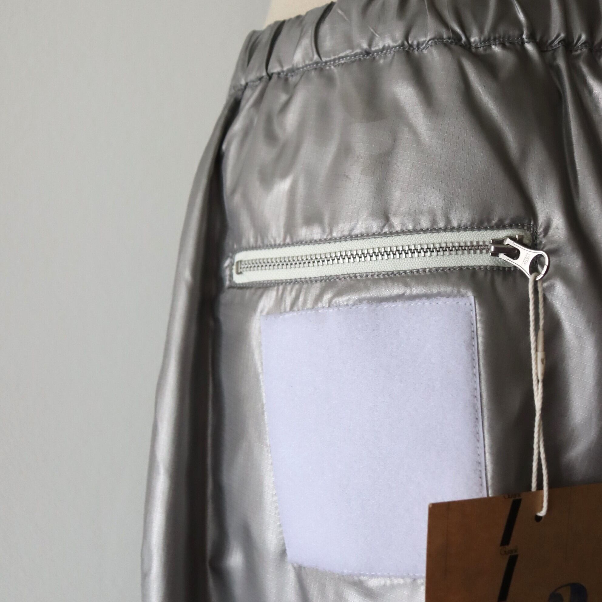 表地にはポリエステルリップストップにチタンコーティングを施し、近未来観を演出。裾はボタンにより絞って着用できるようになっております。